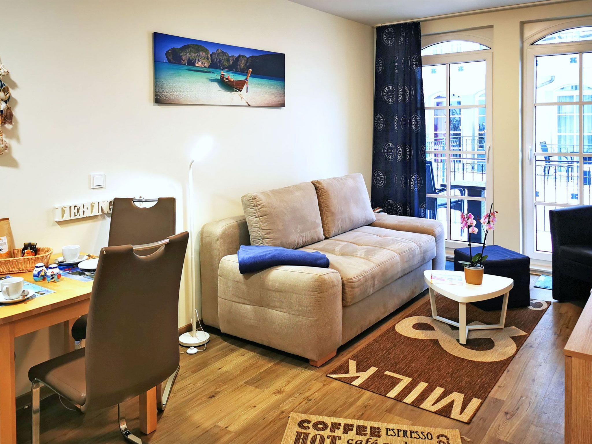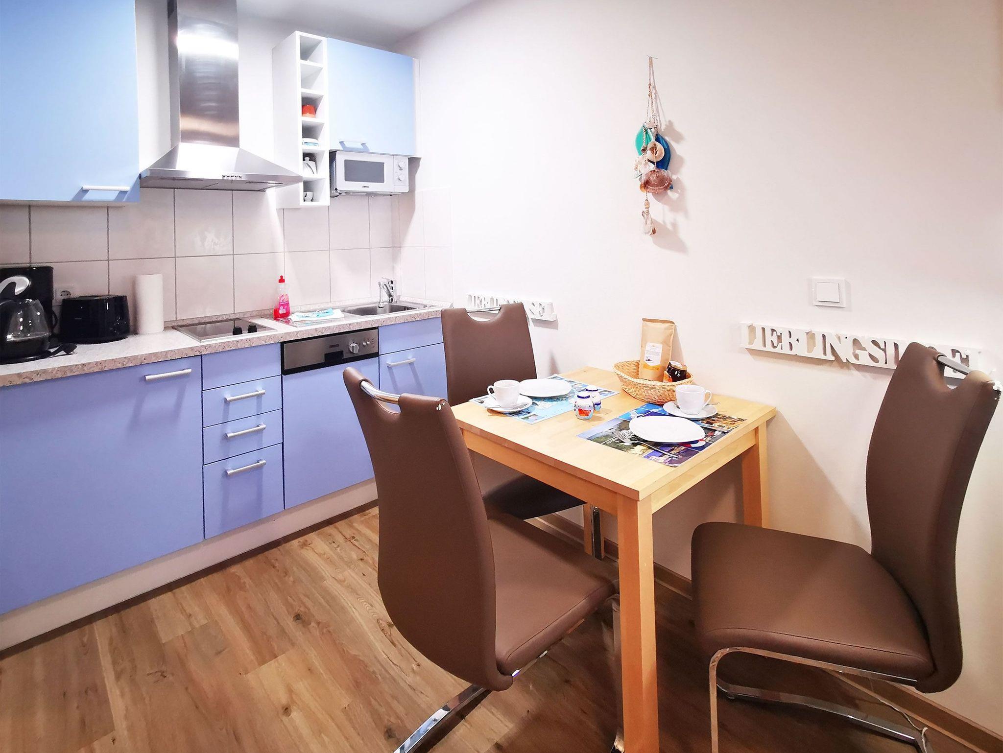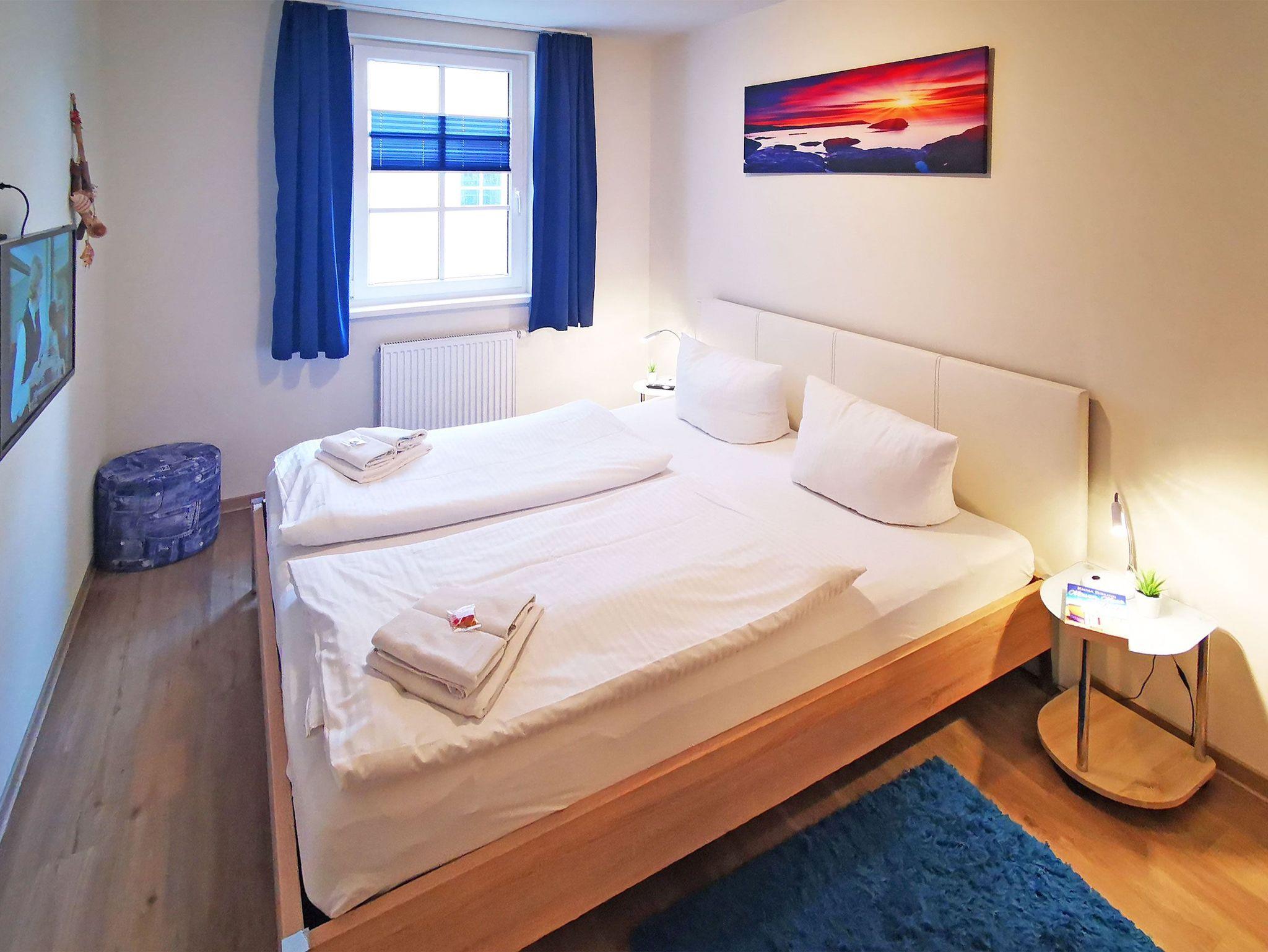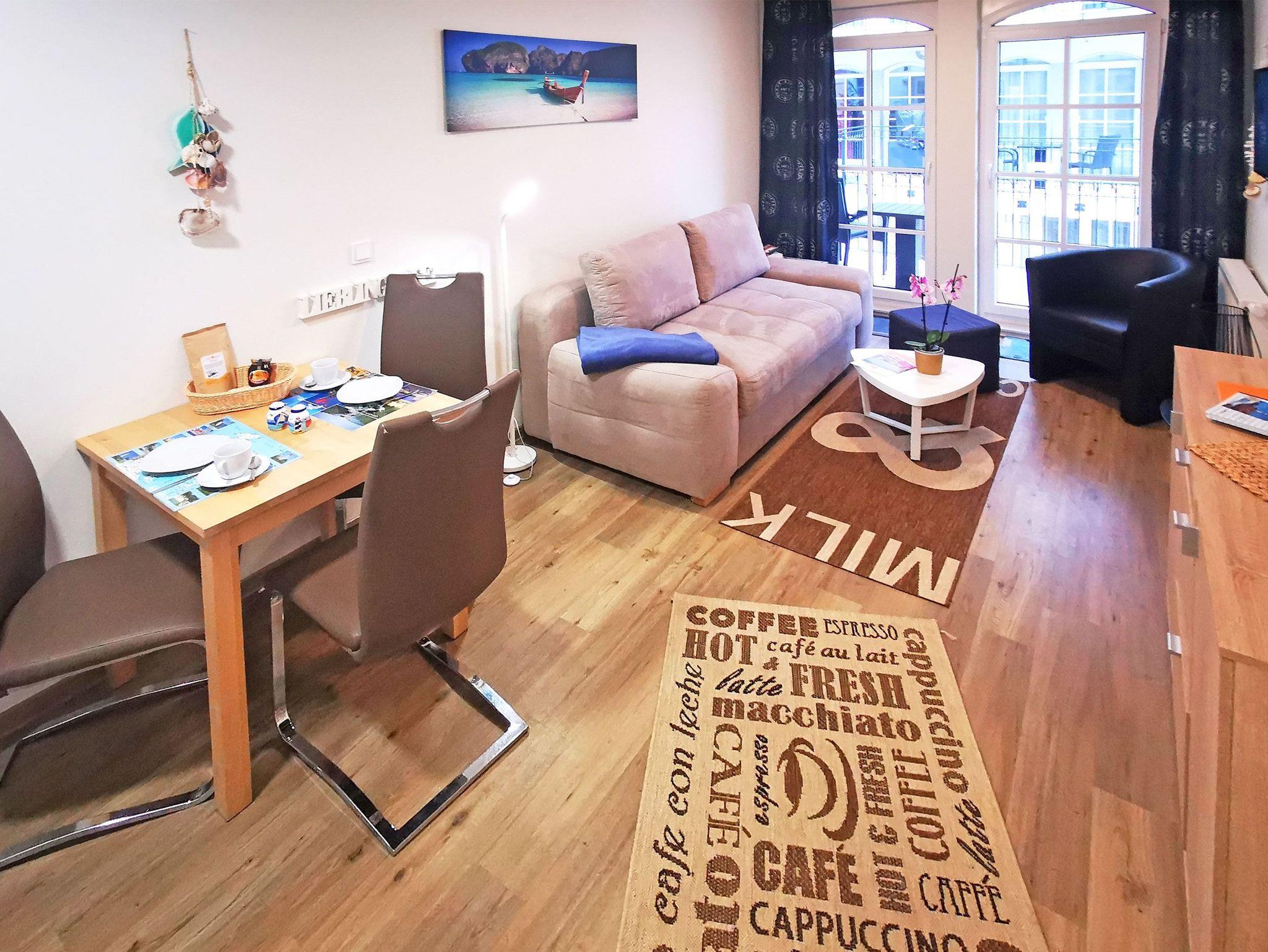 Zum perfekten Badeurlaub mit Strandidyll: Diese 2-Zimmer-Nichtraucherwohnung im ersten Obergeschoss der Ferienresidenz Haus Meeresblick bietet Platz für 2-3 Personen. Im Schlafzimmer mit Doppelzimmer und extra Fernseher ist Platz für zwei Personen, eine mögliche dritte Person übernachtet auf dem Schlafsofa, das im Wohn- und Essbereich steht. Dieser Bereich ist ebenfalls mit einem Fernseher ausgestattet, außerdem mit einem Radio und einer integrierten offenen Küche. Sie hat einen 2-Plattenherd (Ceranfeld), eine Spülmaschine, eine Kaffeemaschine, einen Toaster und natürlich einen Kühlschrank.