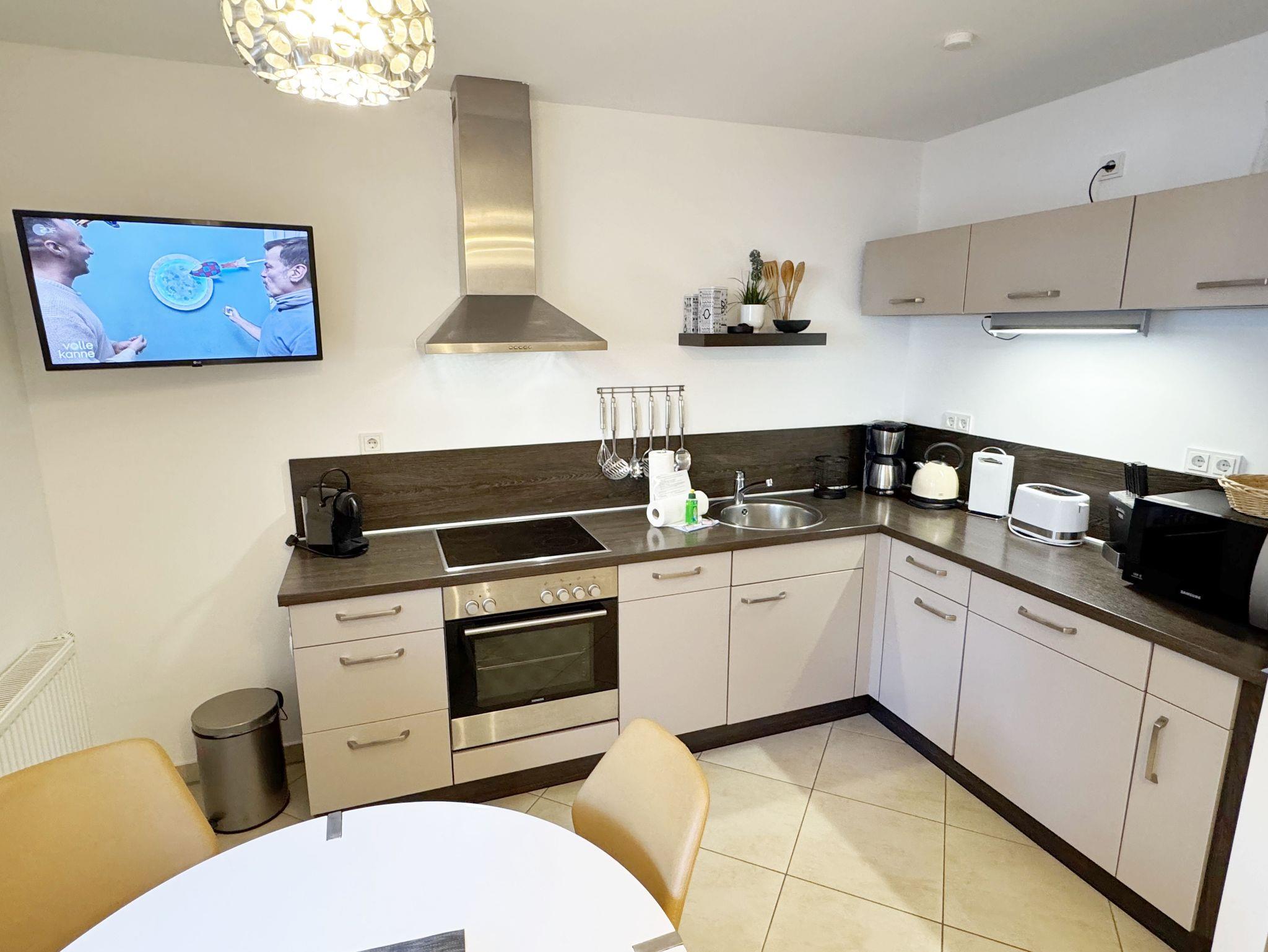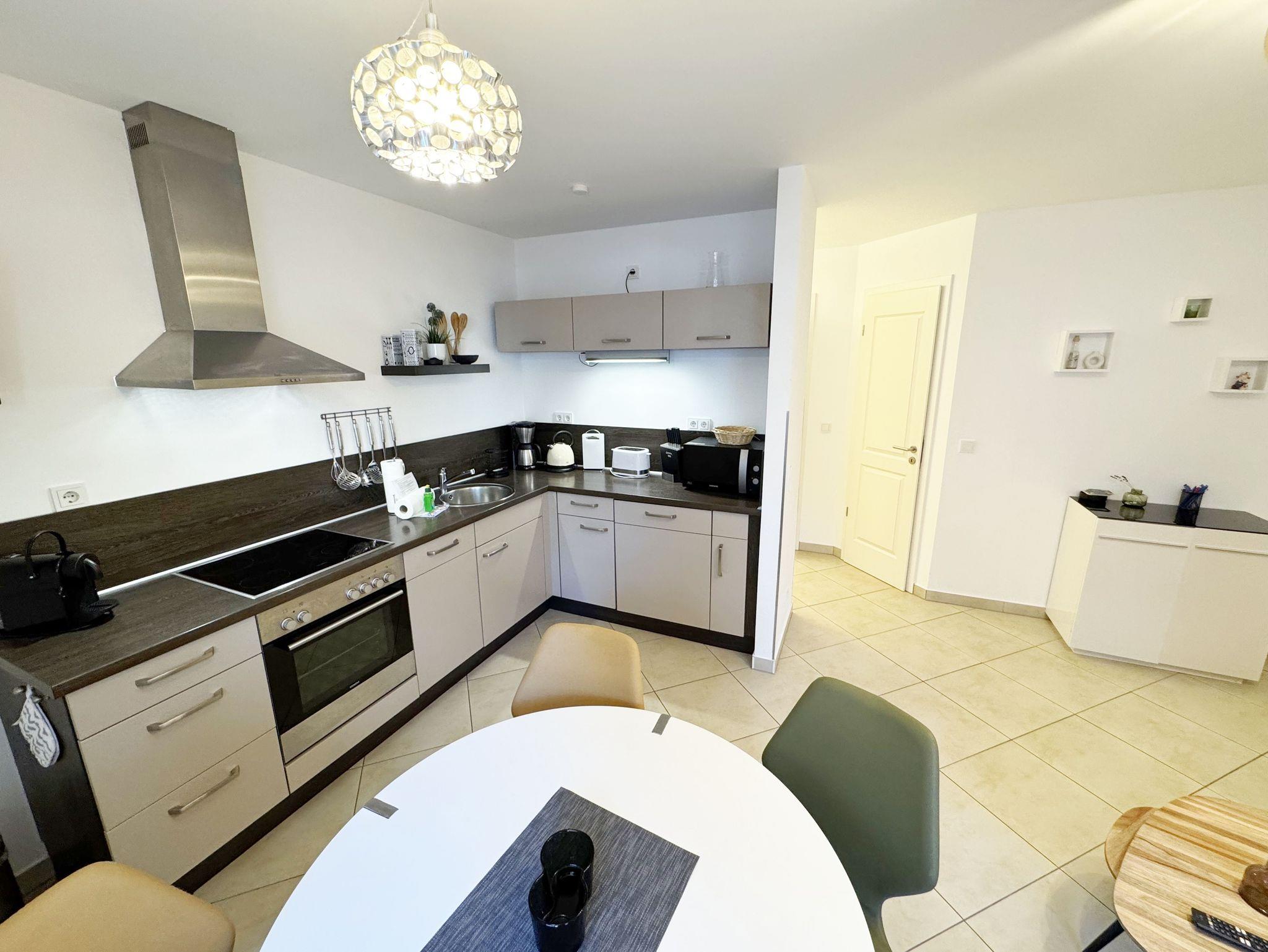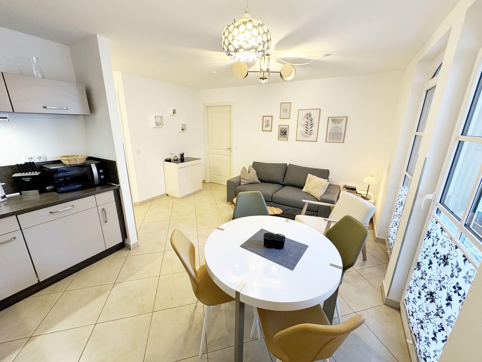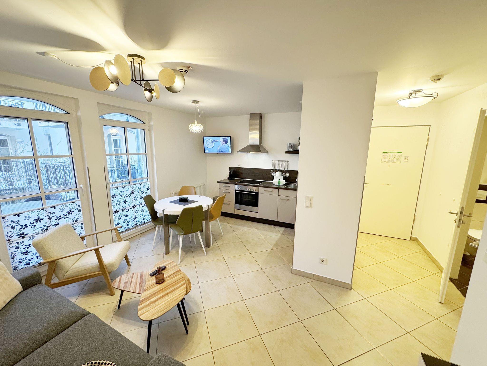 Ihre Nichtraucher-Ferienwohnung ist mit viel Liebe zum Detail ausgestattet und eingerichtet worden. Sie wohnen in einer ca. 41 qm großen 2-Zimmerwohnung, die für 2 bis max. 3 Personen ausgelegt ist. Die Wohnung Seegeflüster (A 1.26) befindet sich im Erdgeschoss und ist per Fahrstuhl von der Tiefgarage zu erreichen. In der Wohnung finden Sie einen kombinierten Wohn-/Koch- und Essbereich. Die integrierte Küchenzeile lässt mit Mikrowelle, Backofen, Ceranfeld, Spülmaschine, Kühlschrank mit Gefrierfach, Kaffeemaschine, Nespresso Maschine, Wasserkocher, Toaster und anderen praktischen Helfern keine Wünsche offen. Im Wohnbereich sind weiterhin eine Essecke, eine Leselampe, eine gemütliche Couch, die in wenigen Handgriffen zur 2. Schlafstätte umfunktioniert werden kann (1,45m x 2,00m), ein Smart-TV (43 Zoll) und eine Musikanlage mit DAB-Radio und eine Vitrine vorhanden. Die Terrasse ist vom Wohn-/Essbereich begehbar und komplett möbliert. Von hier aus schauen Sie in Richtung Kiefern und Dünen. Das Schlafzimmer ist mit einem Doppelbett (1,80 m x 2,00 m), verstellbaren Lattenrosten, Nachttischkonsolen und einem Kleiderschrank ausgestattet. Für einen ruhigen Schlaf sorgen die vorhandenen Insektenschutzgitter sowie Verdunklungsplissee´s im Schlaf- und Wohnbereich. Das Bad verfügt über eine ebenerdige Dusche, Waschbecken, WC, Kosmetikspiegel, Handtuchheizkörper und einen Haarfön. Auch im Urlaub brauchen Sie in der Wohnung nicht auf einen Internetanschluss (WLAN) verzichten. Dieser ist für Sie inklusive! Im Keller des Hauses haben Sie die Möglichkeit eine Waschmaschine/Trockner gegen Gebühr zu nutzen. Ein Haustier gegen eine Gebühr ein gern gesehener Gast. Ein eigener PKW-Stellplatz (Nr.126, Einfahrtshöhe 2,00m) befindet sich in der Tiefgarage des Hauses. Mit dem Fahrstuhl des Hauses A gelangen sie in das Untergeschoss der Meeresblickanlage, wo Sie ein großzügiger und heller Wellnessbereich erwartet. Hier können sie in einem Pool kleine Bahnen schwimmen, in 2 Saunen Ihren Kreislauf in Schwung bringen, in einem dazugehörigen Ruheraum Ihren Körper wieder beruhigen, in einer Schneckendusche sowie weiteren Duschen das kühle Nass genießen und auf einer Außenterrasse mit Außendusche die frische Luft einatmen. Die Erstausstattung eines Wäschepaketes (komplette Bettwäsche, 1 Duschhandtuch, 2 kleine Handtücher) können Sie bis 14 Tage vor Anreise gegen einen Aufpreis dazu buchen oder durch eigene ergänzen. Ab 2 gebuchten Paketen erhalten Sie einmalig 1 Geschirrhandtuch und 1 Duschvorleger dazu.