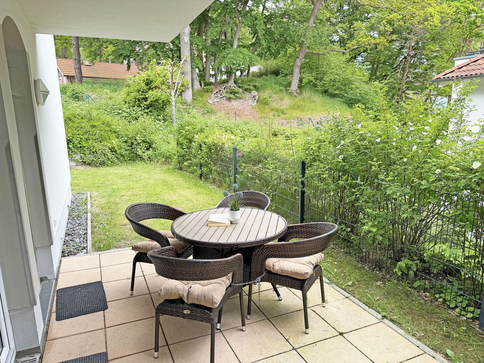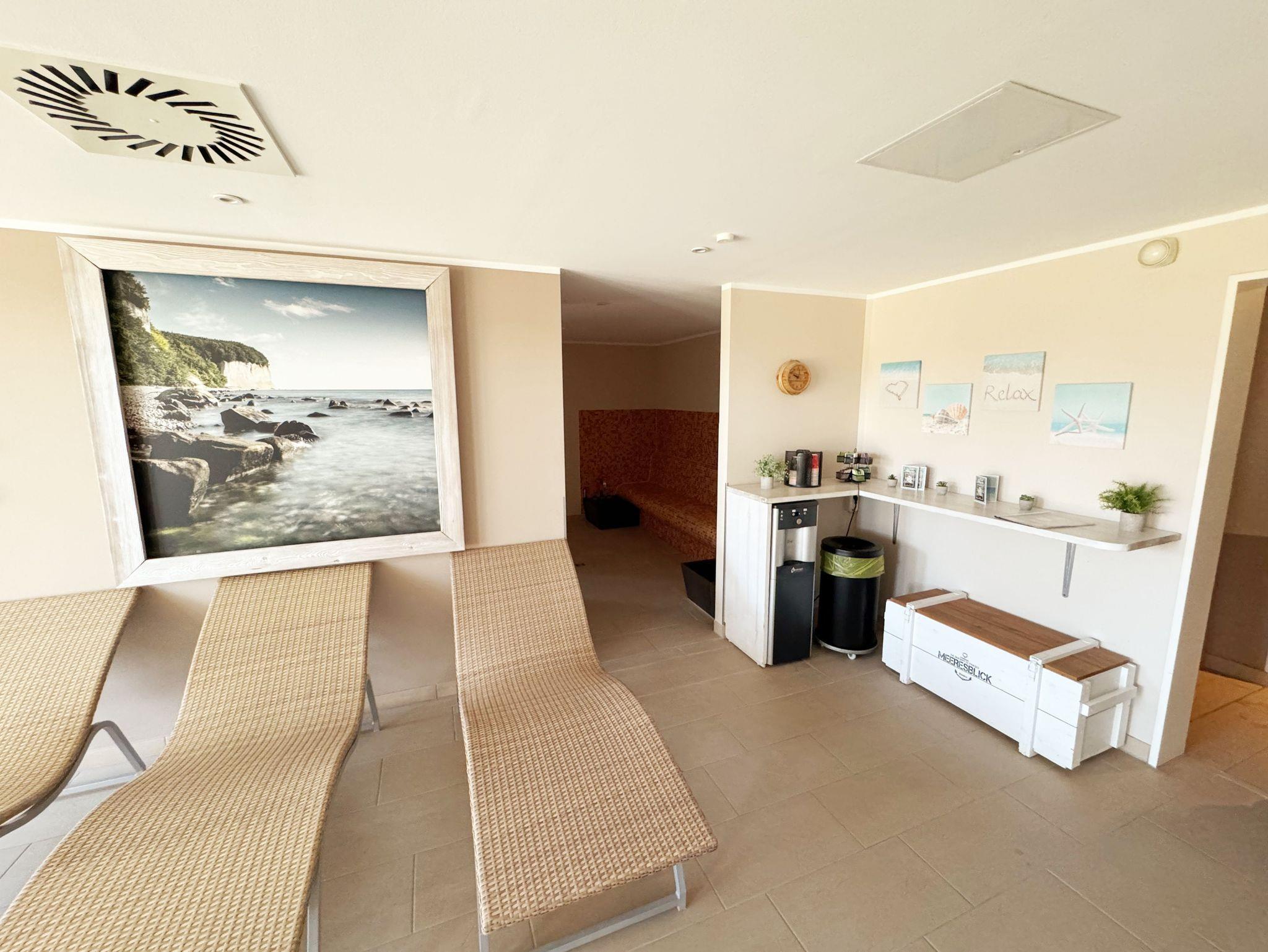 Unmittelbar am Kurpark des Ostseebades Baabe, umgeben von Kiefern befindet sich die Appartementanlage Meeresblick mit der Ferienwohnung Seegeflüster. Die Ferienanlage besteht aus 3 freistehenden Häusern und ist nur ca. 80 Meter vom feinen Sandstrand entfernt. An die hiesige Bäderarchitektur angelehnt fügt sich die Meeresblickanlage wohltuend in die Umgebung ein. Die Ferienwohnungen verfügen über einen hohen Komfort und lassen Ihren Urlaubstraum wahr werden. Im Haupthaus befindet sich ein Wellnessbereich mit Innenpool, Sauna und Ruheraum (inklusive) der zur Entspannung einlädt. Eine hauseigene Tiefgarage sorgt dafür, dass Ihr PKW sicher untergebracht ist. Cafés und Restaurants laden in der Anlage zum Verweilen ein. Ein weiteres Highlight ist der Müther Schalenbau, welches saniert, restauriert und in die Meeresblickanlage liebevoll integriert wurde. Von hier aus haben Sie einen fantastischen Blick auf die weite Ostsee. Die Wohnung Seegeflüster (A 1.26) befindet sich im Haupthaus A im Erdgeschoss und verfügt über eine Terrasse mit Blick Richtung Kiefern und Dünen.