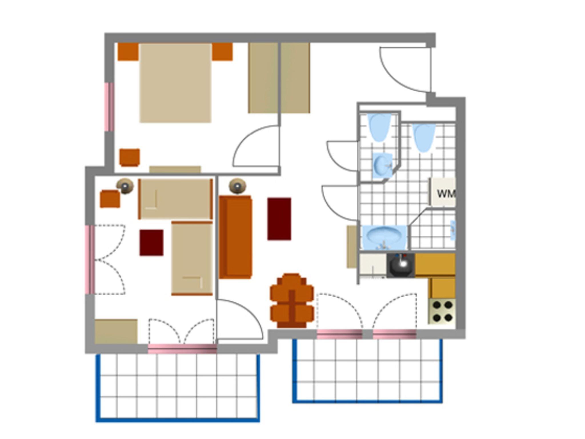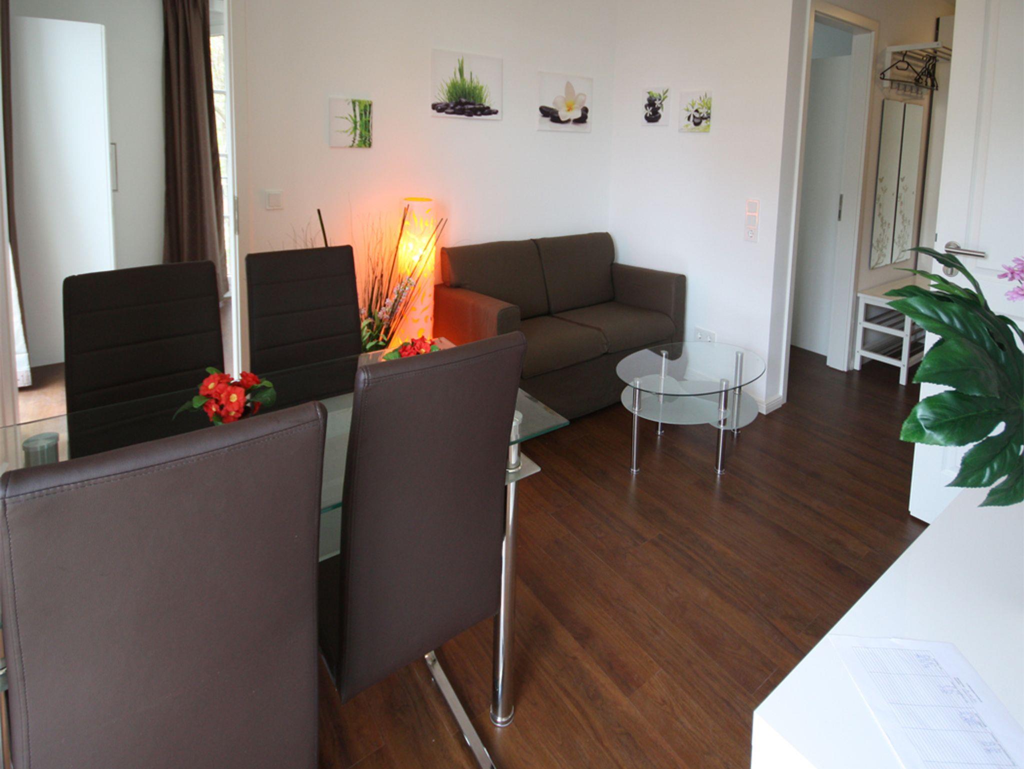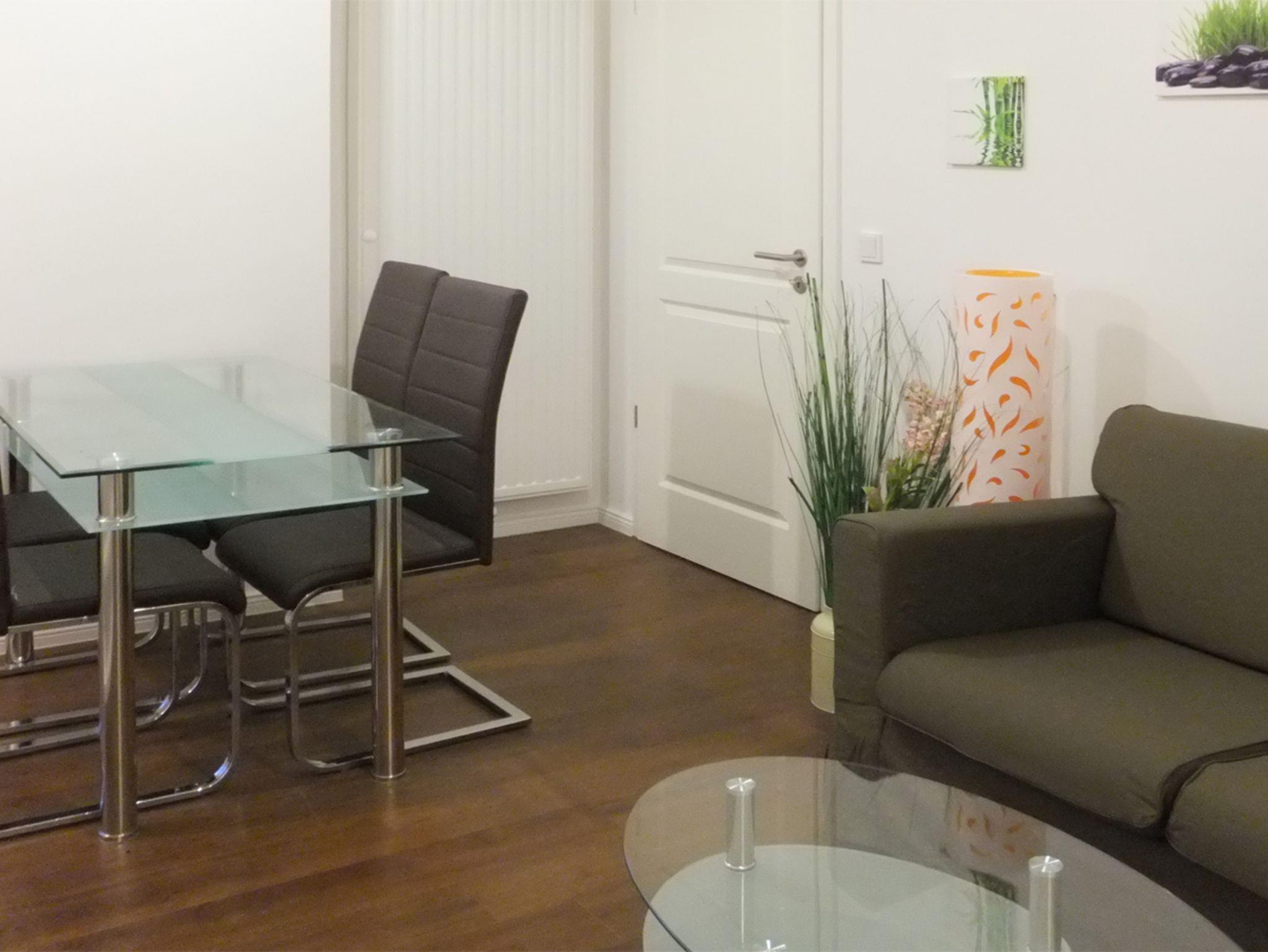 Die Wohnung hat einen großzügigen Wohn-/Essbereich mit einer modern ausgestatteten Küchenzeile mit Esstisch sowie TV mit DVD-Player und Radio. Die beiden separaten Schlafzimmer sind mit einem Doppelbett bzw. mit 2 Einzelbetten eingerichtet. In der Wohnung ist Internet (LAN und WLAN) kostenfrei vorhanden.