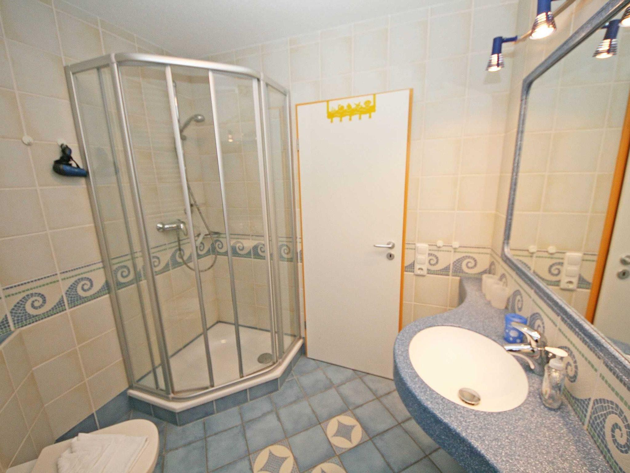 Die gemütliche und komfortable 3-Raum-Nichtraucherwohnung mit ca. 55qm Wohnfläche befindet sich im Erdgeschoss und bietet ausreichend Platz für 2 Erw. + 2 Kinder bis 17 Jahre. Die im Rügener Stil behaglich eingerichtete Ferienwohnung bietet einen großzügigen Wohn- Essbereich mit Zugang auf die teilweise überdachte Terrasse. Die kleine aber komplett eingerichtete Küchenzeile mit Geschirrspüler, Backofen, 4 Herdplatten, Kaffeemaschine, Toaster, Wasserkocher sowie diverse Küchenutensilien lassen keine Wünsche offen und grenzen an den Wohnbereich. Im Wohn- Essbereich erwartet Sie ein Esstisch mit 4 Stühlen, eine gemütliche Couch mit einem Sideboard sowie einen LCD Sat-TV in HD-Qualität für eine hohe Programmvielfalt, CD und DVD-Player sowie ein Radio mit USB-Anschluss und SD-Kartenleser. Vom Wohnbereich aus gelangen Sie auf die teilweise überdachte, im Bäderstil gehaltene und bestuhlte Terrasse (Richtung Süden) mit 2 zusätzlichen Sonnenliegen. Das 1. Schlafzimmer verfügt über 1 Doppelbett (2x90x200 cm) mit Nachtischkonsolen und einen viertürigen Kleiderschrank. Das Aufstellen eines Kinderreisebettes wäre hier möglich. Das 2. und damit kleinere Schlafzimmer ist mit 2 Einzelbetten (je 80x200cm), und Nachttischablagen ausgestattet. Beide Schlafzimmer sind abdunkelbar. Das geflieste Tageslicht-Bad bietet Ihnen eine Dusche, WC, Fön und einen Waschtisch. Auch im Urlaub brauchen Sie in der Wohnung nicht auf einen Internetanschluss (WLAN) verzichten. Dieser ist für Sie inklusive!!! In einem Gemeinschaftsraum können Sie eine Waschmaschine gegen eine Extragebühr nutzen (in den Monaten: November bis Ende März nicht im Betrieb). Ein Parkplatz Nr. 02 befindet sich vor dem Haus Rügenwelle und ist für Sie inklusive. Ihre mitgebrachten oder geliehenen Fahrräder können Sie auf dem Grundstück anschließen. Auf Wunsch kann auch 1x Kinderreisebett (mit Matratze, ohne Bett Inlett) / 1x Hochstuhl gestellt werden. 2 kleine Haustiere können gegen eine Gebühr dazu gebucht werden. Die Erstausstattung eines Wäschepaketes (komplette Bettwäsche, 1 Duschhandtuch, 2 kleine Handtücher) können Sie bis 14 Tage vor Anreise gegen einen Aufpreis dazu buchen oder durch eigene ergänzen. Ab 2 gebuchten Paketen erhalten Sie einmalig 1 Geschirrhandtuch und 1 Duschvorleger hinzu.