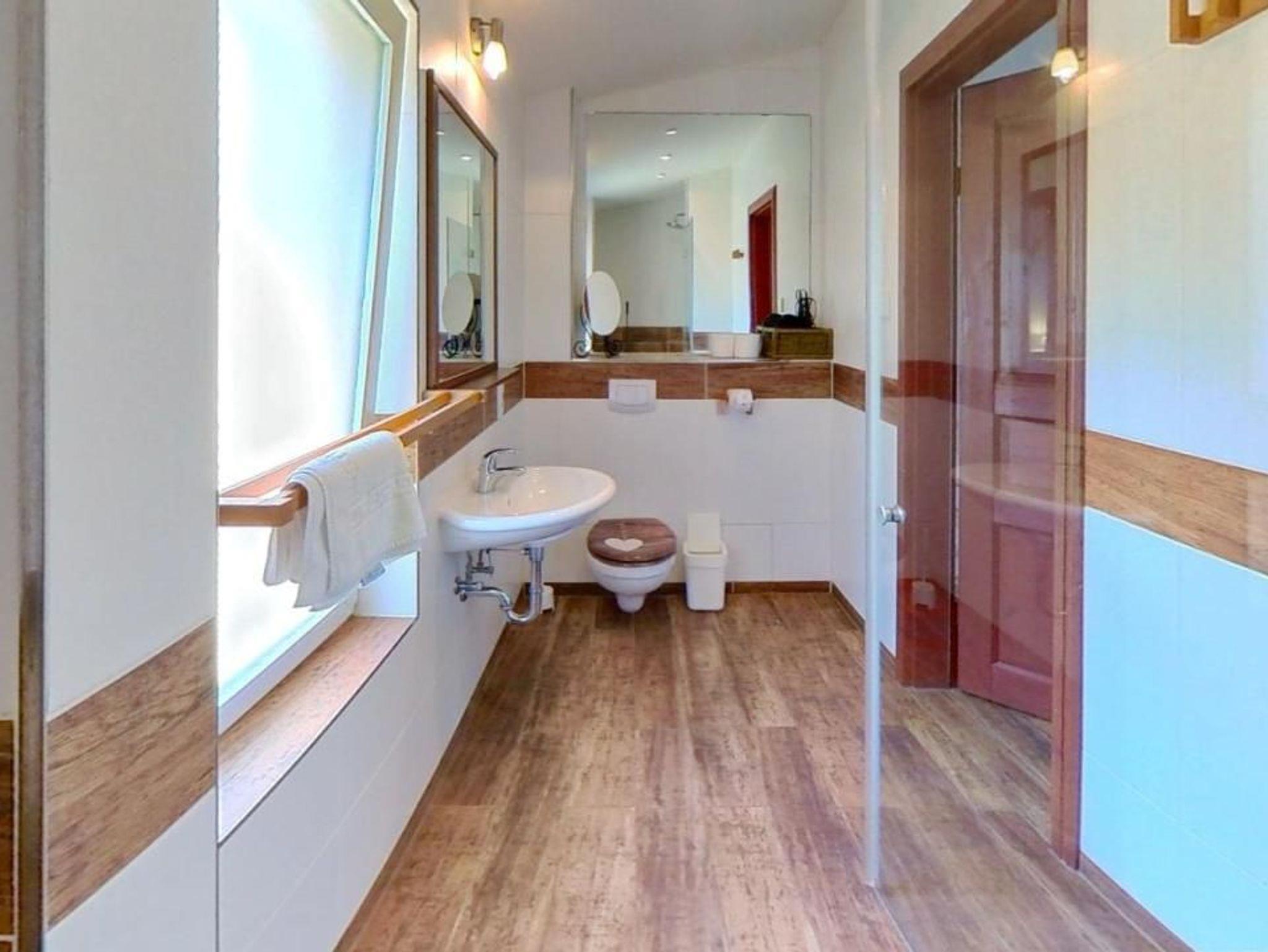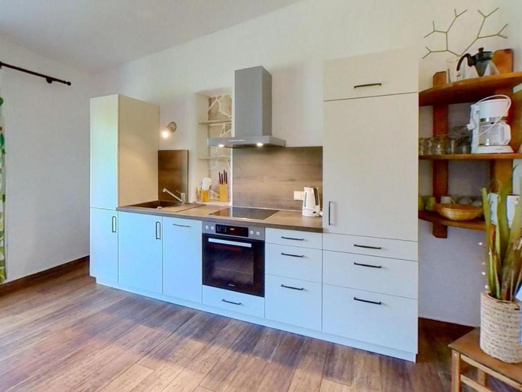 Die Küchenzeile im Wohnbereich ist mit einem Cerankochfeld, Geschirrspüler, Wasserkocher, Kaffeemaschine, Toaster und Backofen ausgestattet. Das sehr schöne und großzügige Bad bietet einen Waschtisch, WC und eine spezielle Wellnessdusche.