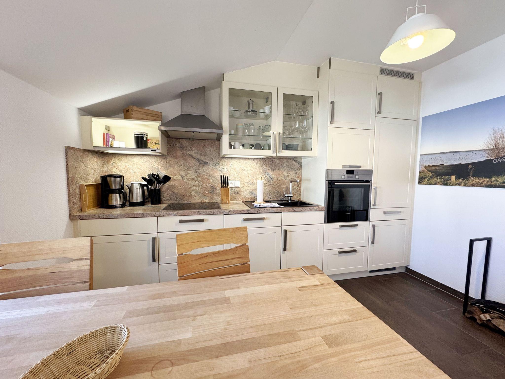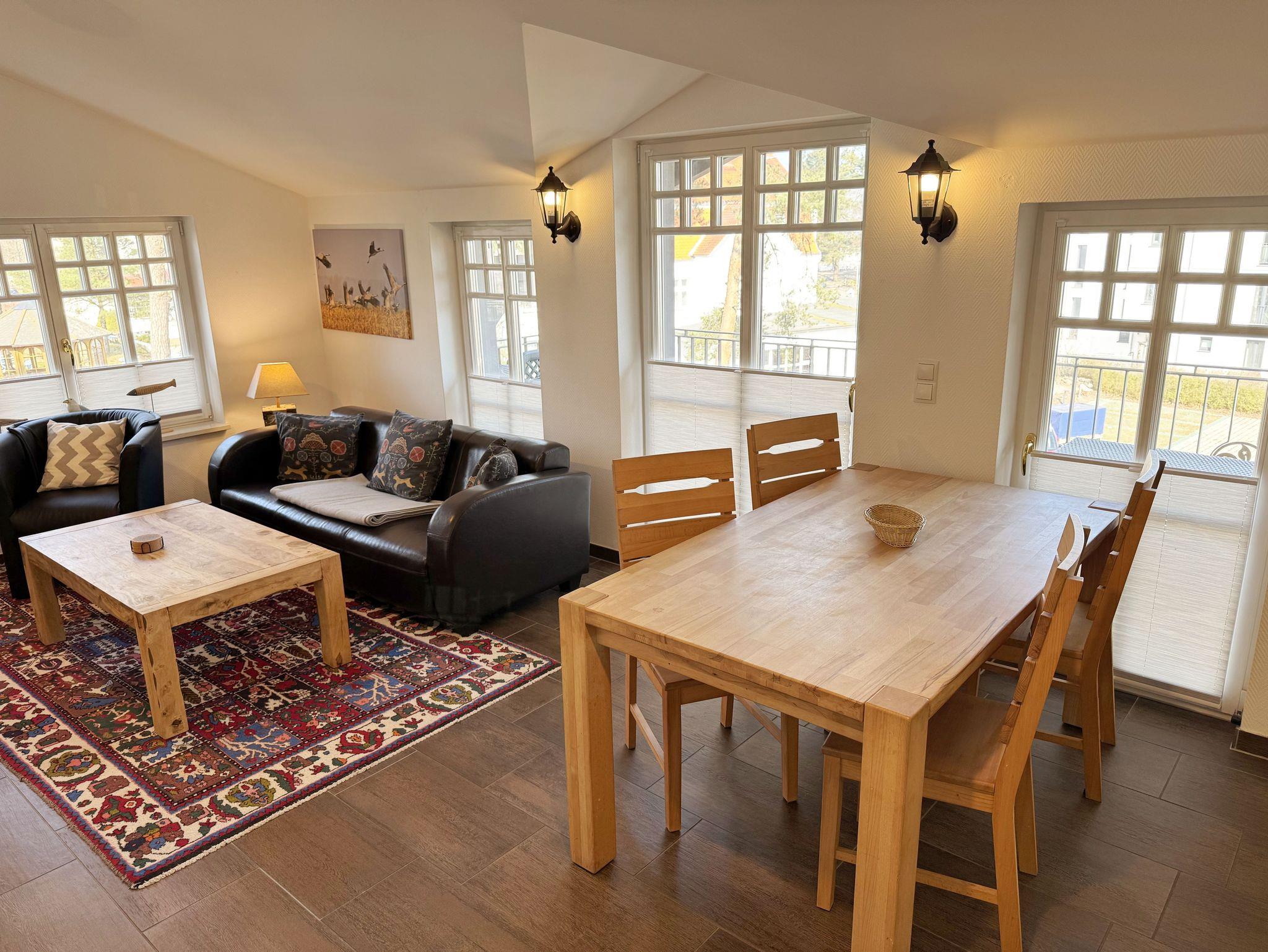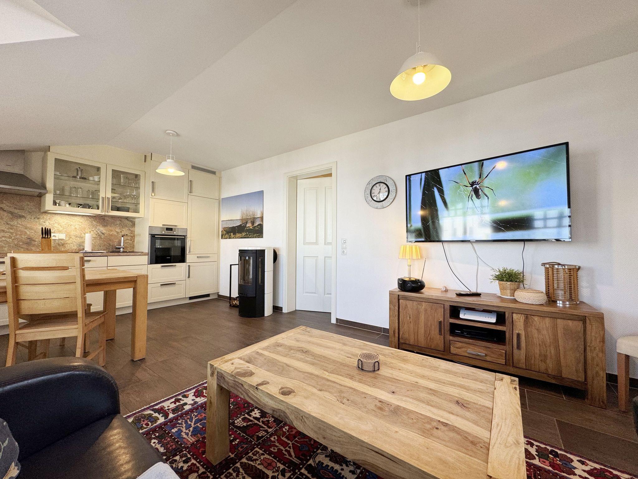 Die modern eingerichtete Nichtraucherferienwohnung 03 im Haus Strandkiefer befindet sich in der 1. Etage. Sie bietet Ihnen mit ca. 56 m² ausreichend Platz für 2 bis 4 Personen + 1 Kleinkind bis 3 Jahre im Kinderreisebett. Vom Flur mit Garderobe gelangen sie in alle Räumlichkeiten. Der helle Wohn-/Essbereich besticht mit seinen bodentiefen Holzfenstern und den Blick auf die Ostsee. Der Wohnbereich wurde mit einer Couch, einem Couchtisch, einem Sessel, einem TV-Board mit einem Smart-TV, einem WLAN-Zugang und einem Blu-Ray-Player ausgestattet. Abgerundet wird der Raum durch einen Kamin, der Ihnen gerade in der kälteren Jahreszeit, zusätzlich zur Fußbodenheizung, eine wohlige Wärme beschert. Die angrenzende Küchenzeile lässt keine Wünsche offen, so dass Sie mit einem Geschirrspüler, einem Backofen (selbstreinigend), einem Kühlschrank mit Gefrierfach, einem Cerankochfeld, einer Mikrowelle, einer Kaffeemaschine, einem Toaster, einem Wasserkocher, einem Mixer sowie diversen Küchenutensilien jede Mahlzeit zubereiten können. Zusätzlich finden Sie hier auch eine Waschmaschine mit Trocknerfunktion. Durch den Essplatz am Fenster wird der Bereich komplettiert. Ihr bestuhlter Balkon (Ost) erreichen Sie vom Wohnbereich, von wo Sie auch den Blick auf das Meer genießen können. Das große Schlafzimmer verfügt über ein Doppelbett (1,80m x 2,00m), verstellbare Lattenroste, Nachttischablagen mit Beleuchtung, einem großen Kleiderschrank und Verdunklungsplissees. Zusätzlich haben Sie auch von hier eine Möglichkeit auf einen weiteren Balkon (Nord) zu kommen. Das kleine Schlafzimmer verfügt über 2 Einzelbetten (0,90m x 2,00m), Nachttischablagen mit Beleuchtung, einem Flachbild-TV und Verdunklungsplissees. Das innenliegende Badezimmer ist mit einer Dusche (flacher Einstieg), einem WC, einem Waschtisch, einem Kosmetikspiegel, einem Fön und einer Badewanne ausgestattet. Ein Wäscheständer sowie Reinigungsutensilien runden die Ausstattung ab. Ihre mitgebrachten oder geliehenen Fahrräder können Sie im kleinen abschließbaren Fahrradschuppen neben dem Hauseingang unterbringen. Ihr PKW-Stellplatz (Nr.03) befindet sich direkt am Haus. 2 Haustiere sind gegen eine Gebühr gern gesehene Gäste. Die Erstausstattung eines Wäschepaketes (komplette Bettwäsche, 1 Duschhandtuch, 1 kleines Handtuch) können Sie bis 14 Tage vor Anreise gegen einen Aufpreis dazu buchen oder durch eigenes Ergänzen. Ab 2 gebuchten Paketen erhalten Sie einmalig 1 Geschirrhandtuch und 1 Duschvorleger hinzu.