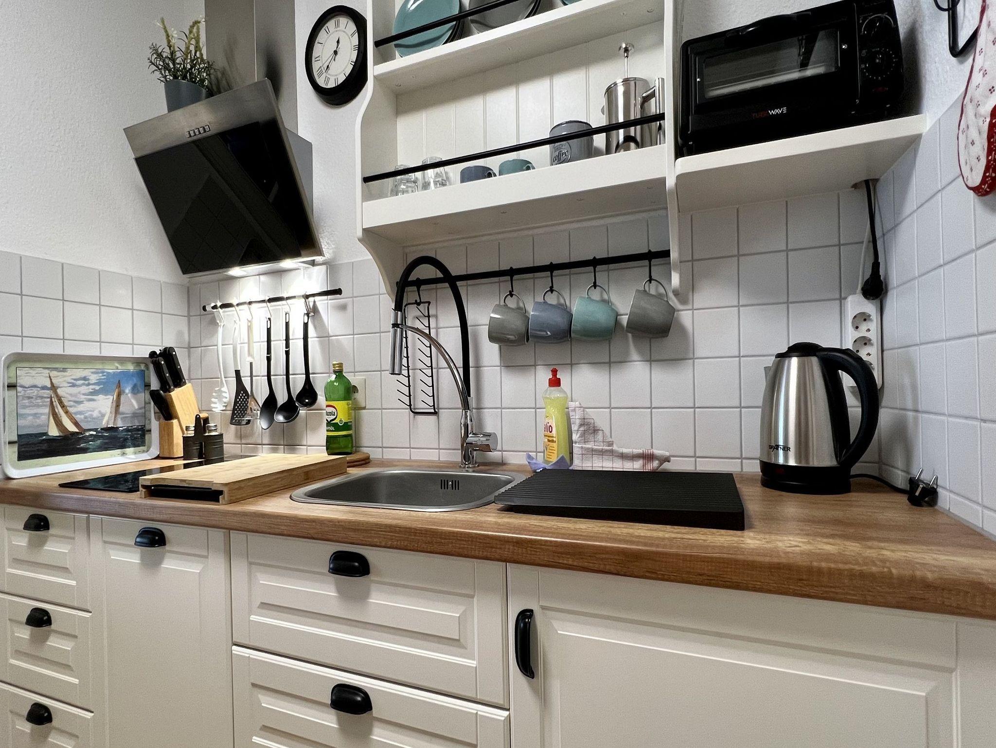 • KÜCHE: separate Küche, 2-Felder Induktionsherd, Spülmaschine, Kühlschrank, Toaster, Wasserkocher, Kaffeemaschine, reichlich Besteck, Geschirr und Küchenutensilien