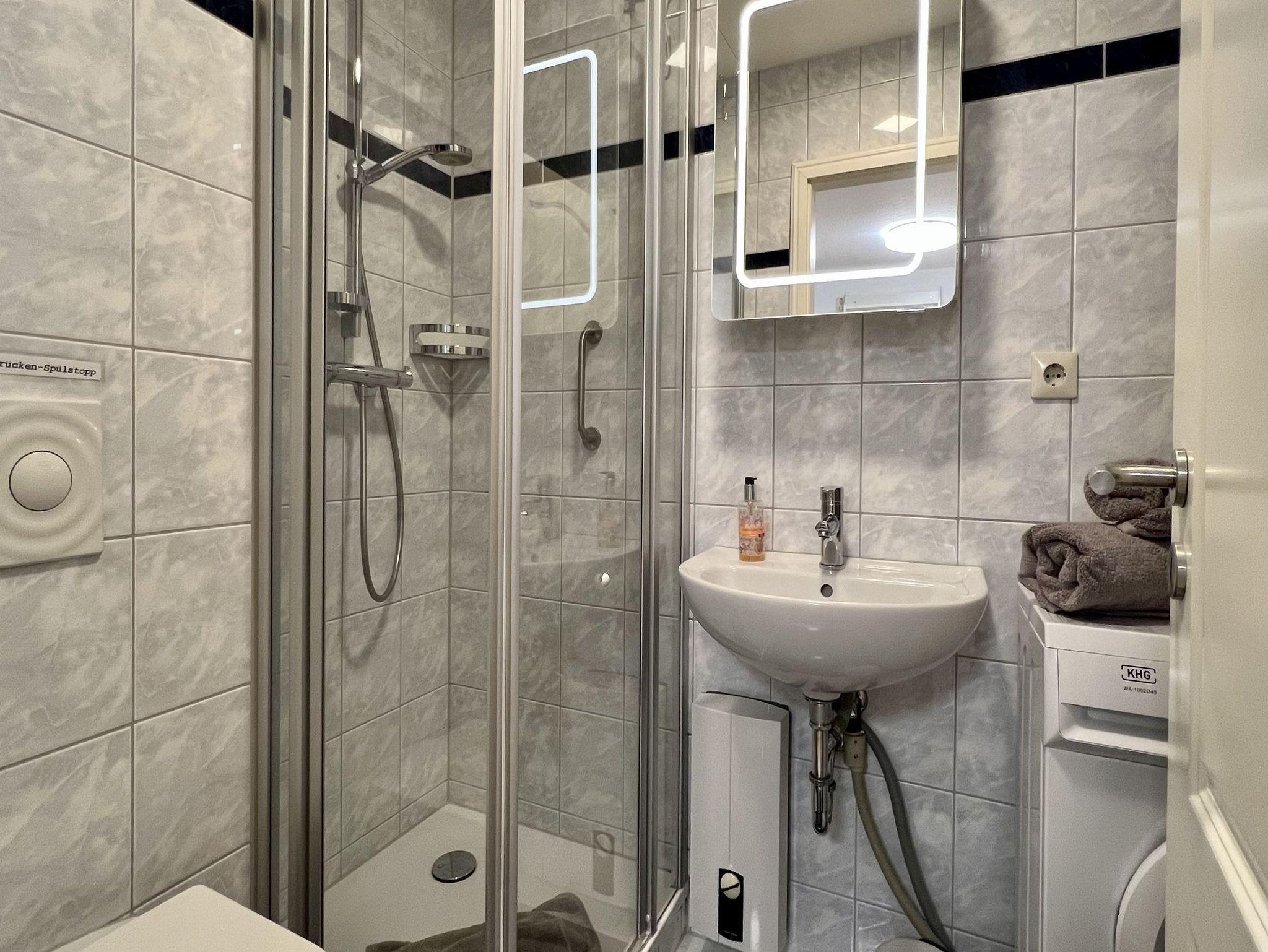 Das innen liegende Bad ist mit einer Dusche, WC, Föhn und einer Waschmaschine versehen.