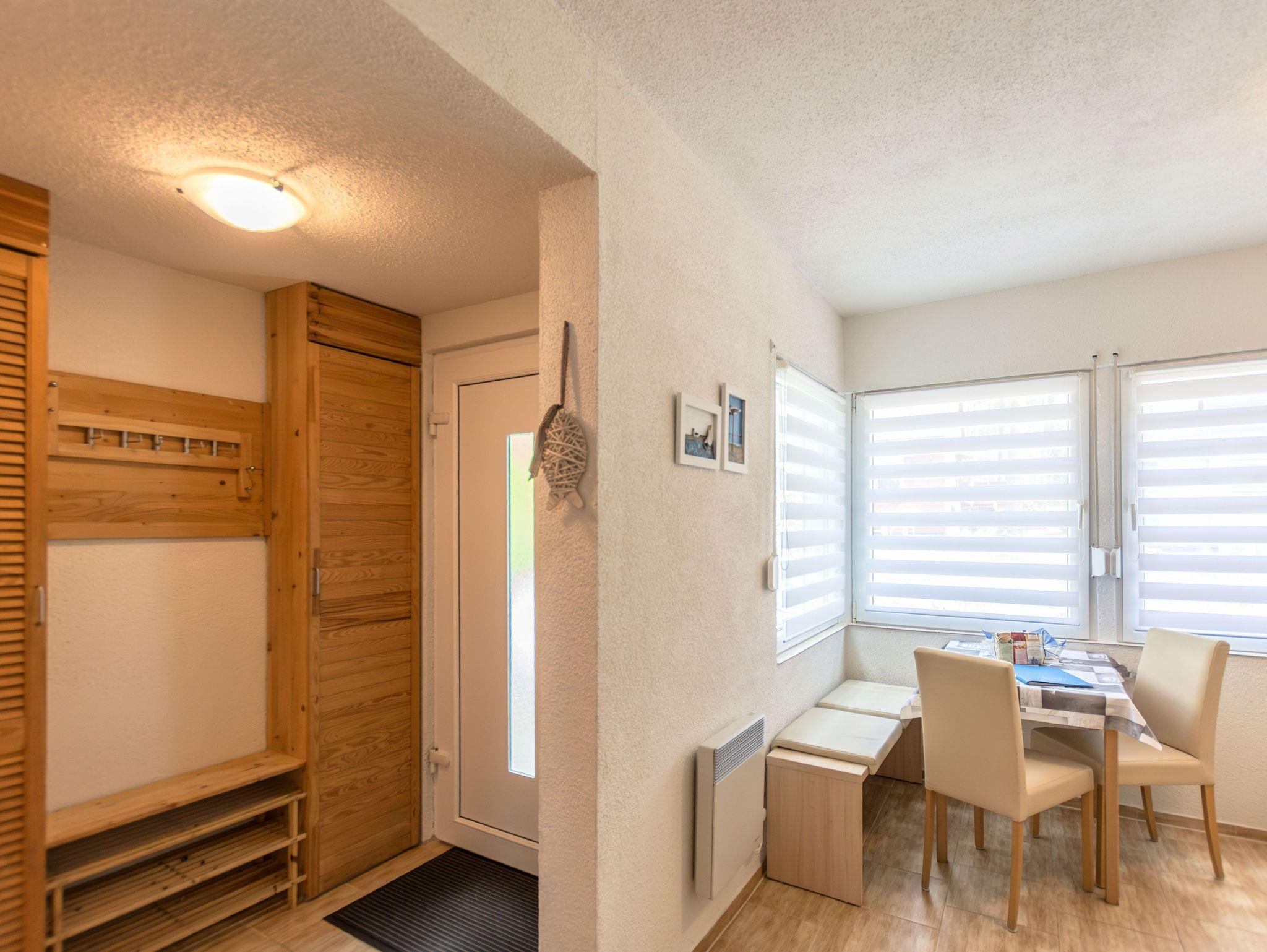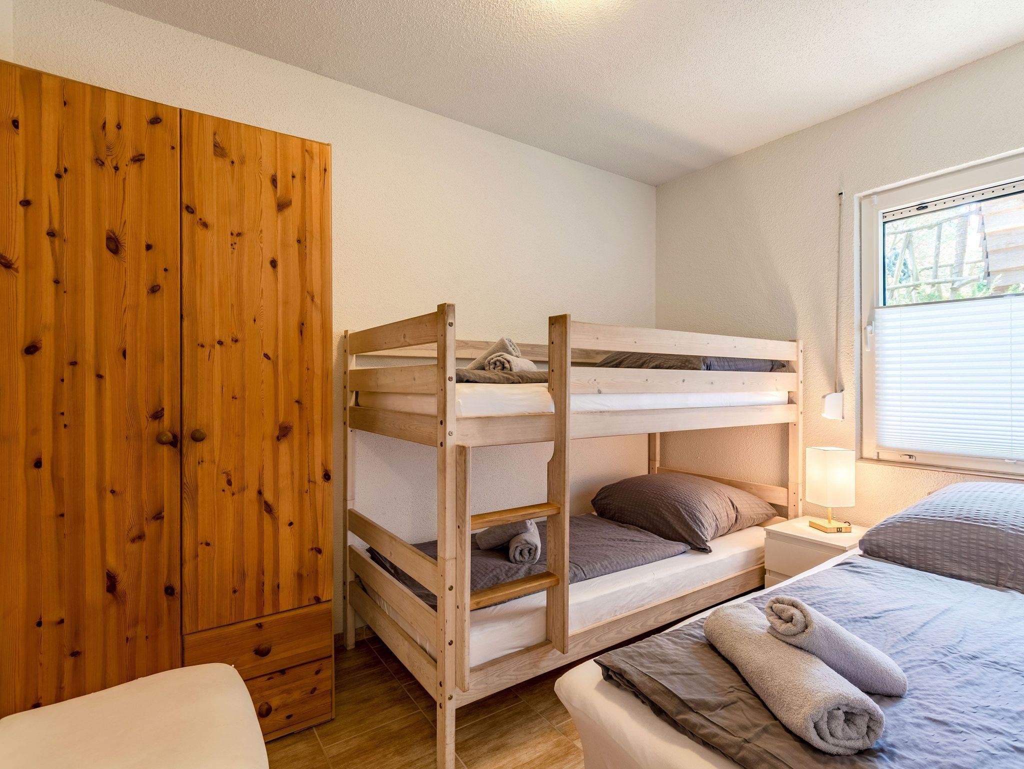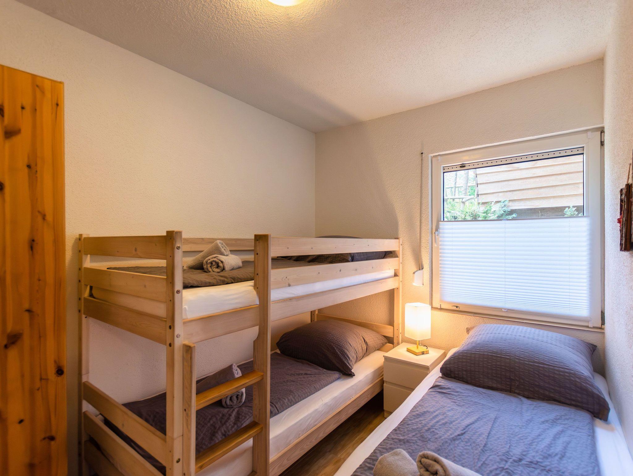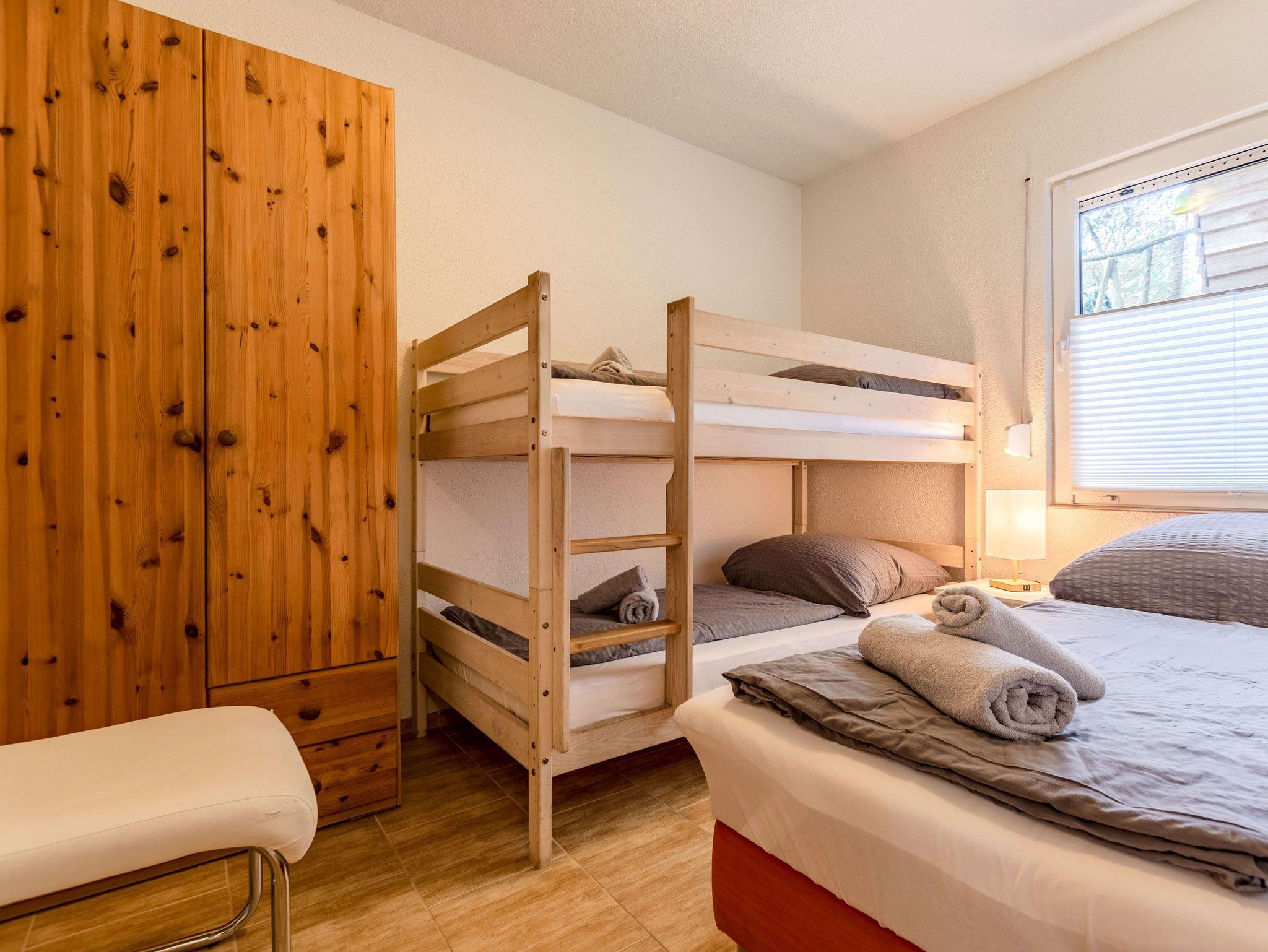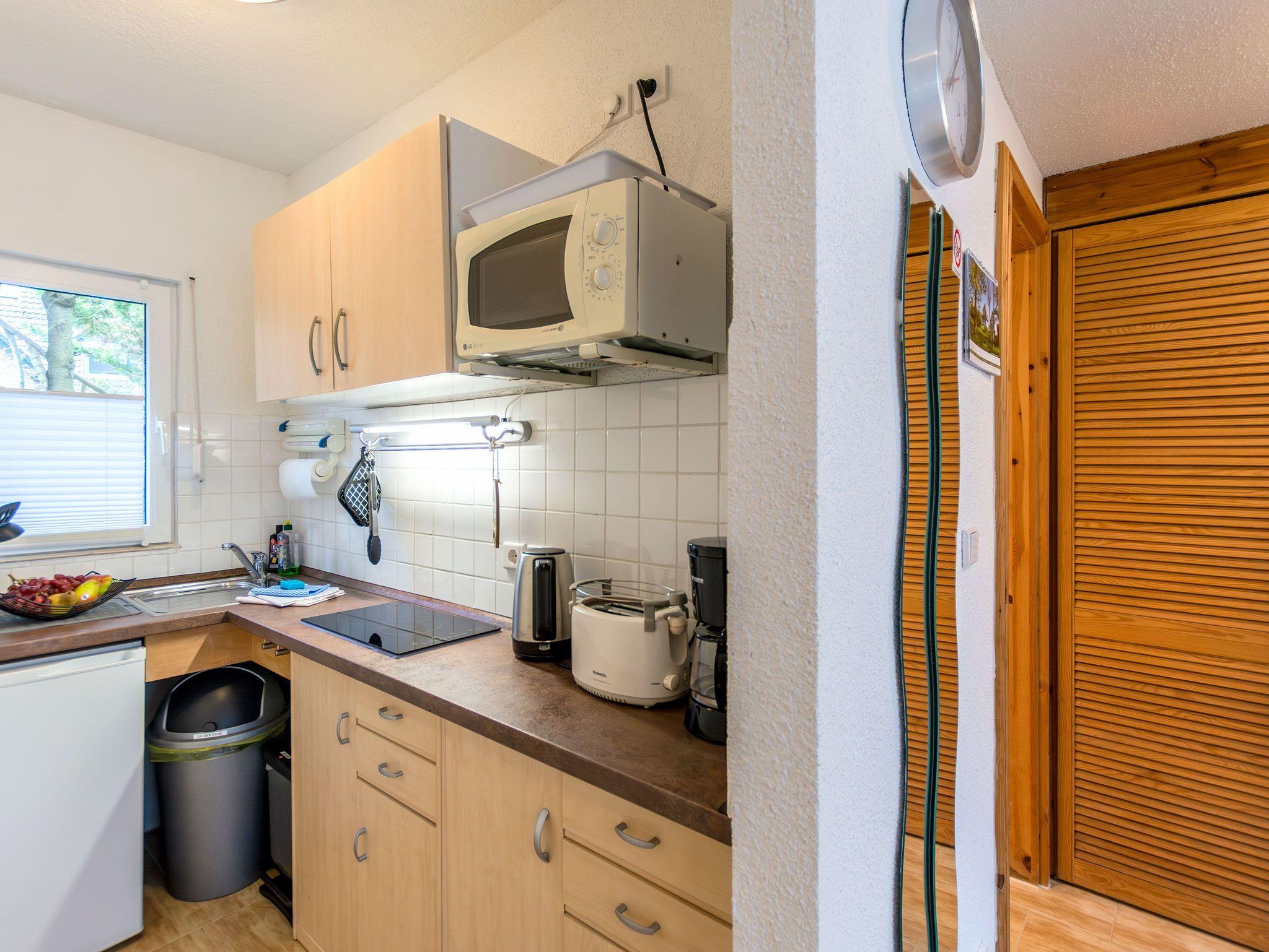 Die offene Küche ist mit einem kleinen Kochfeld, einem Kühlschrank, Kaffeefiltermaschine, Wasserkocher, Toaster sowie einer Mikrowelle ausgestattet. Ein kleiner Essbereich rundet das Gesamtangebot ab. Im Schlafbereich befindet sich ein Doppelstockbett, ein Einzelbett und ein Kleiderschrank.