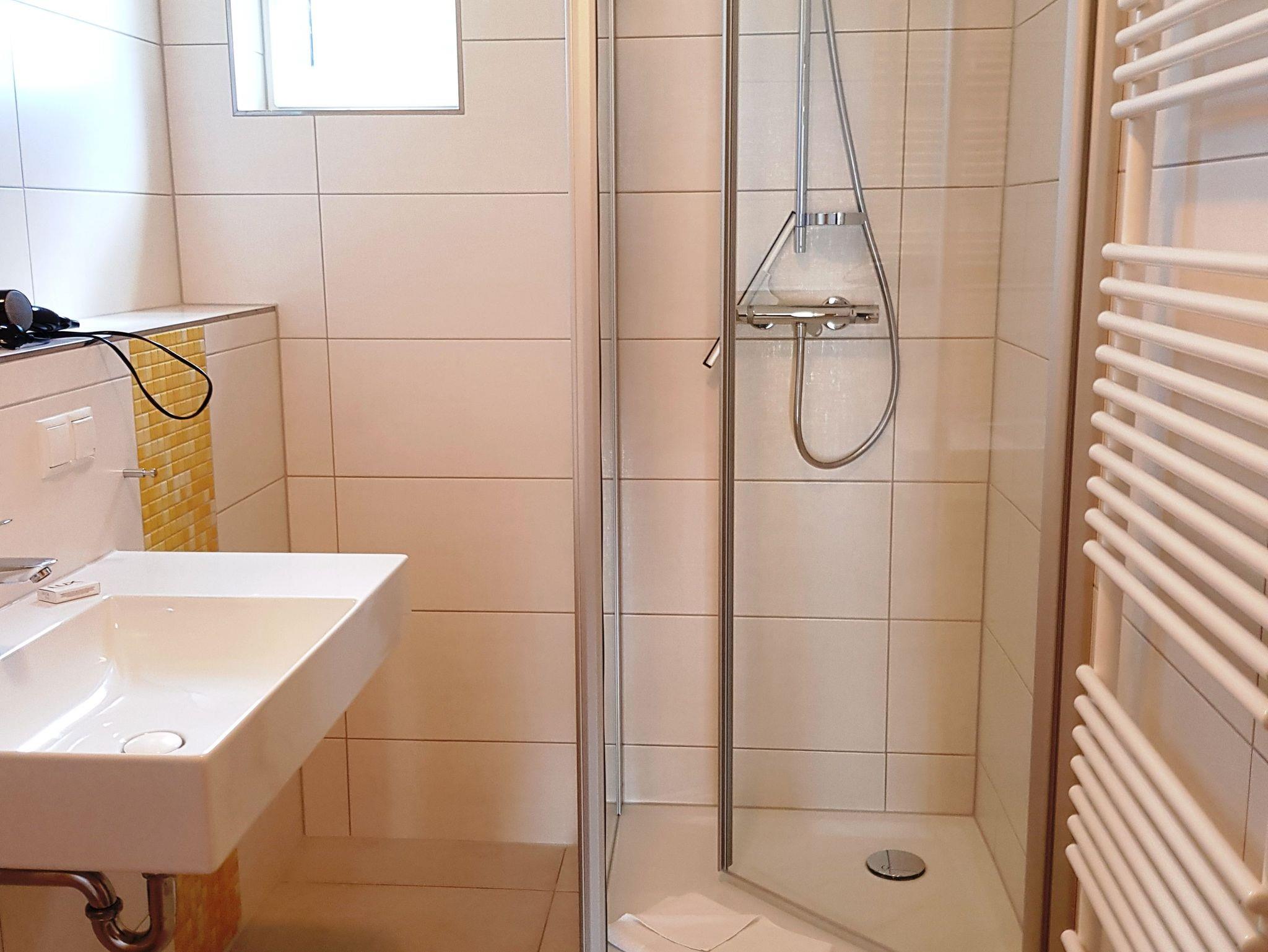Bad mit Dusche, WC, Waschplatz und Fußbodenheizung