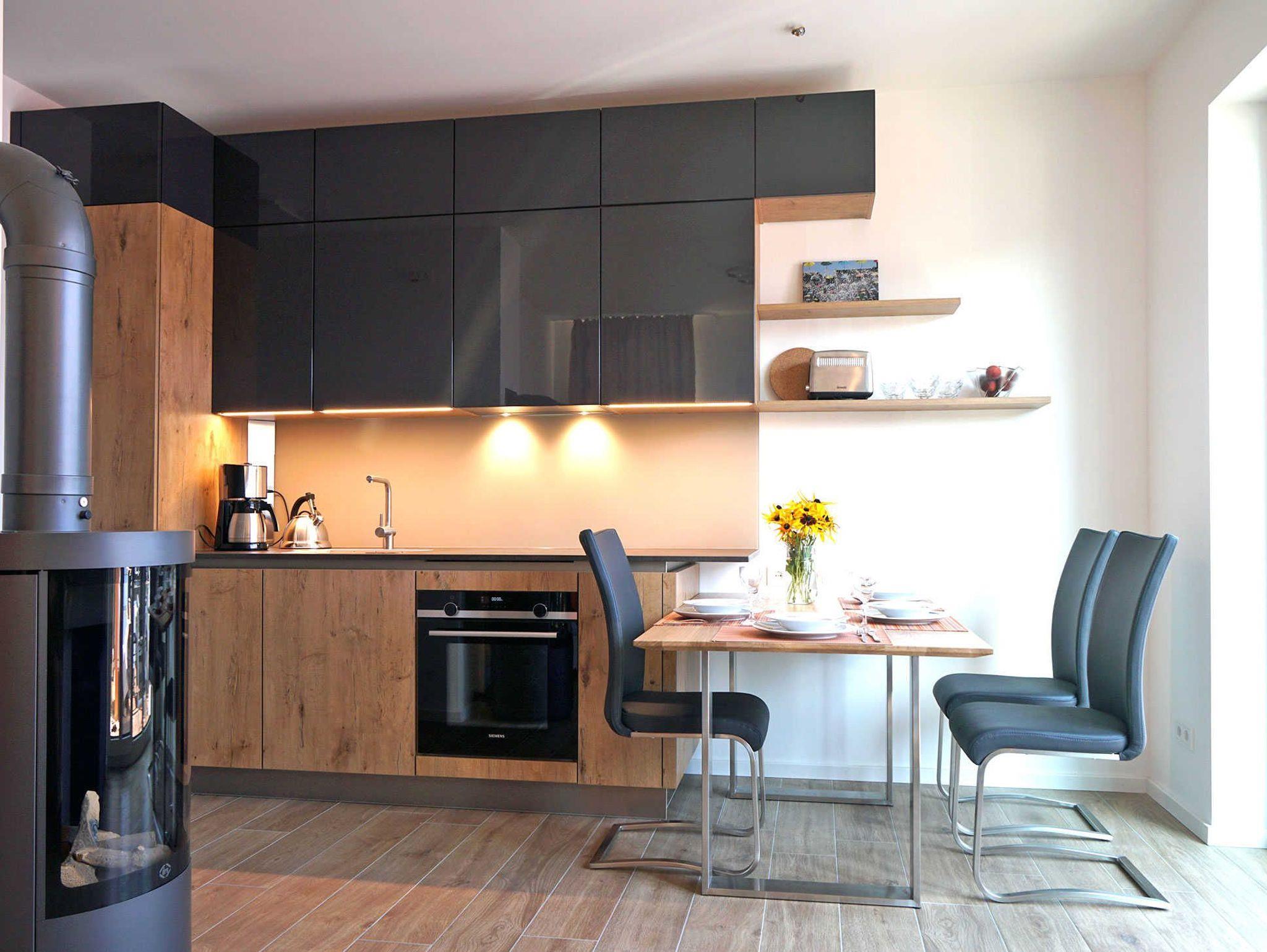 Die moderne Wohnküche ist ausgestattet mit einem extraleisen Geschirrspüler, einem Siemensbackofen, einer Induktionsherdplatte, einem Kühlschrank mit Gefrierfach, einer Keramikarbeitsplatte, einer Mikrowelle, einer Nespressomaschine, einem Toaster sowie einem Raclette.