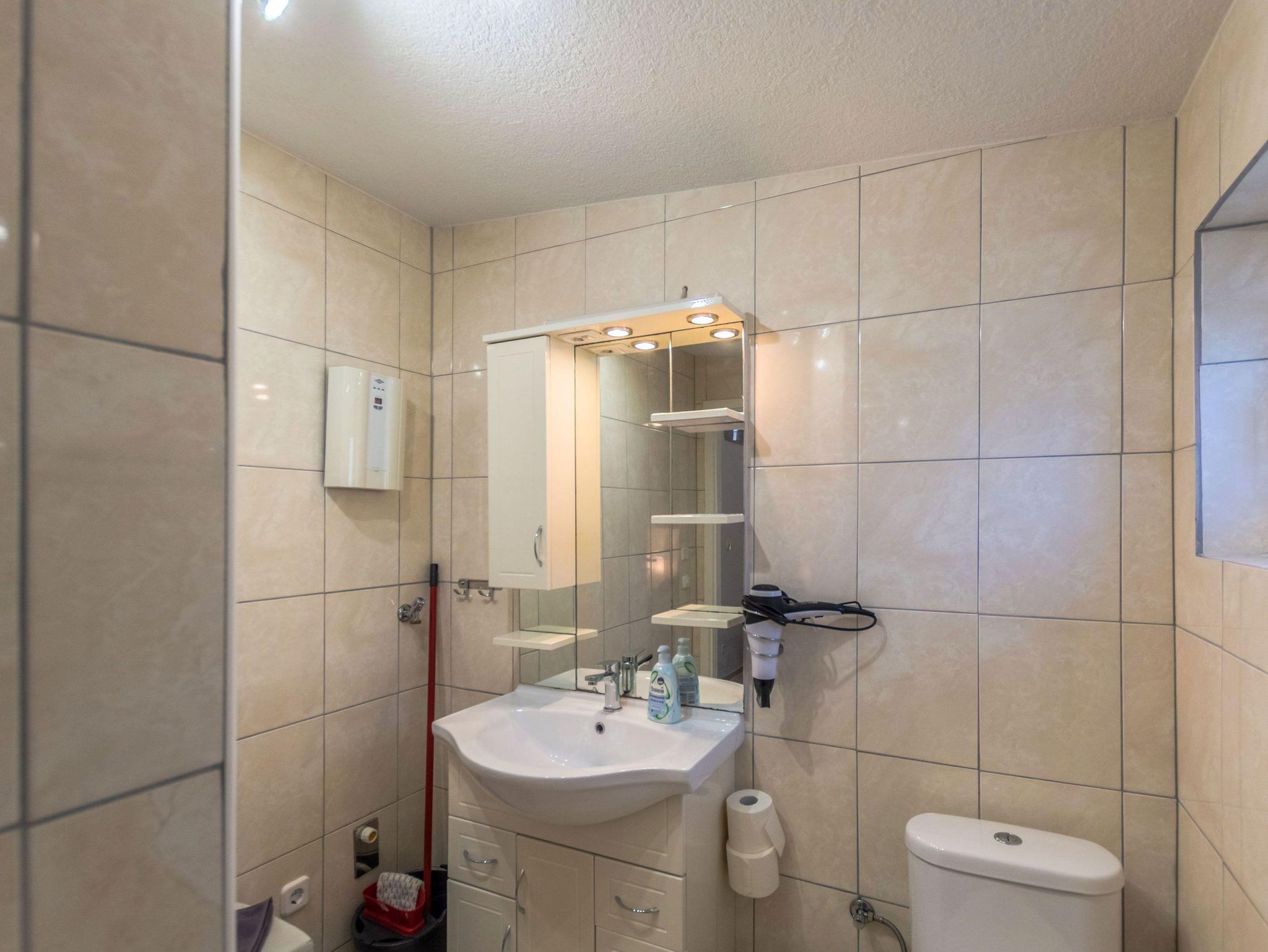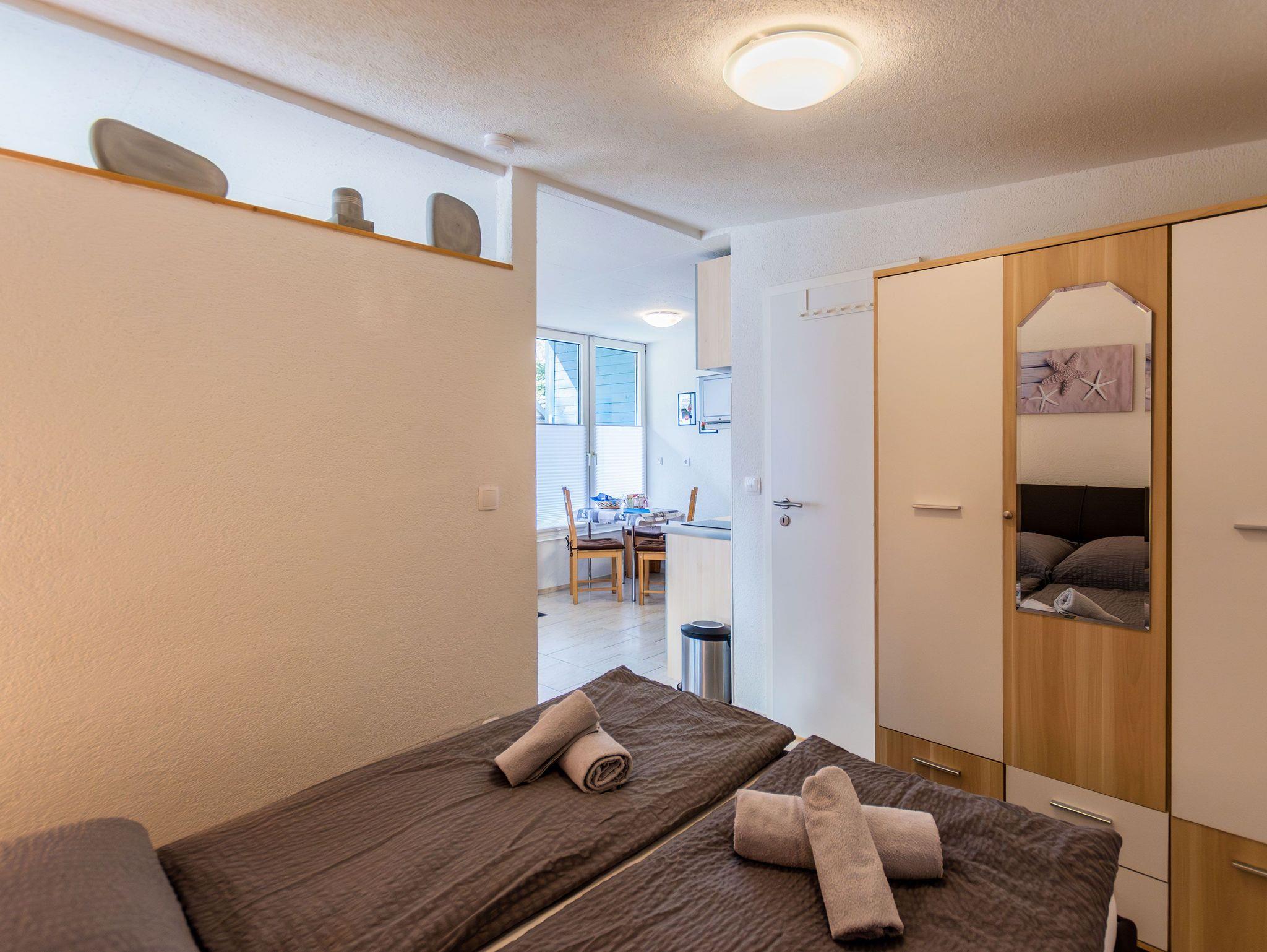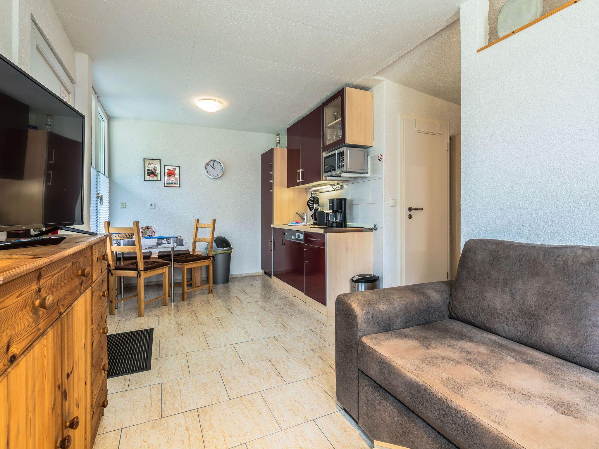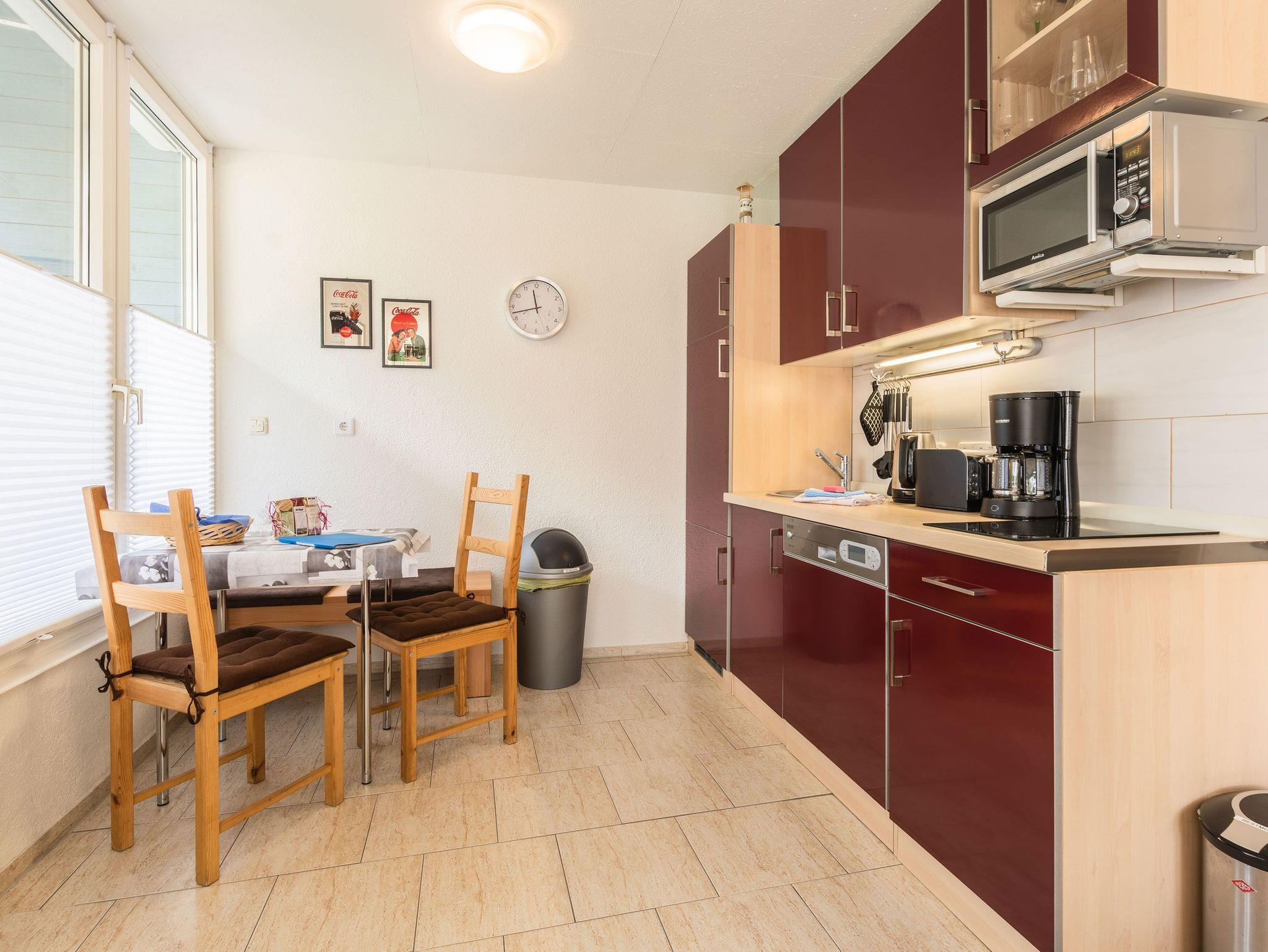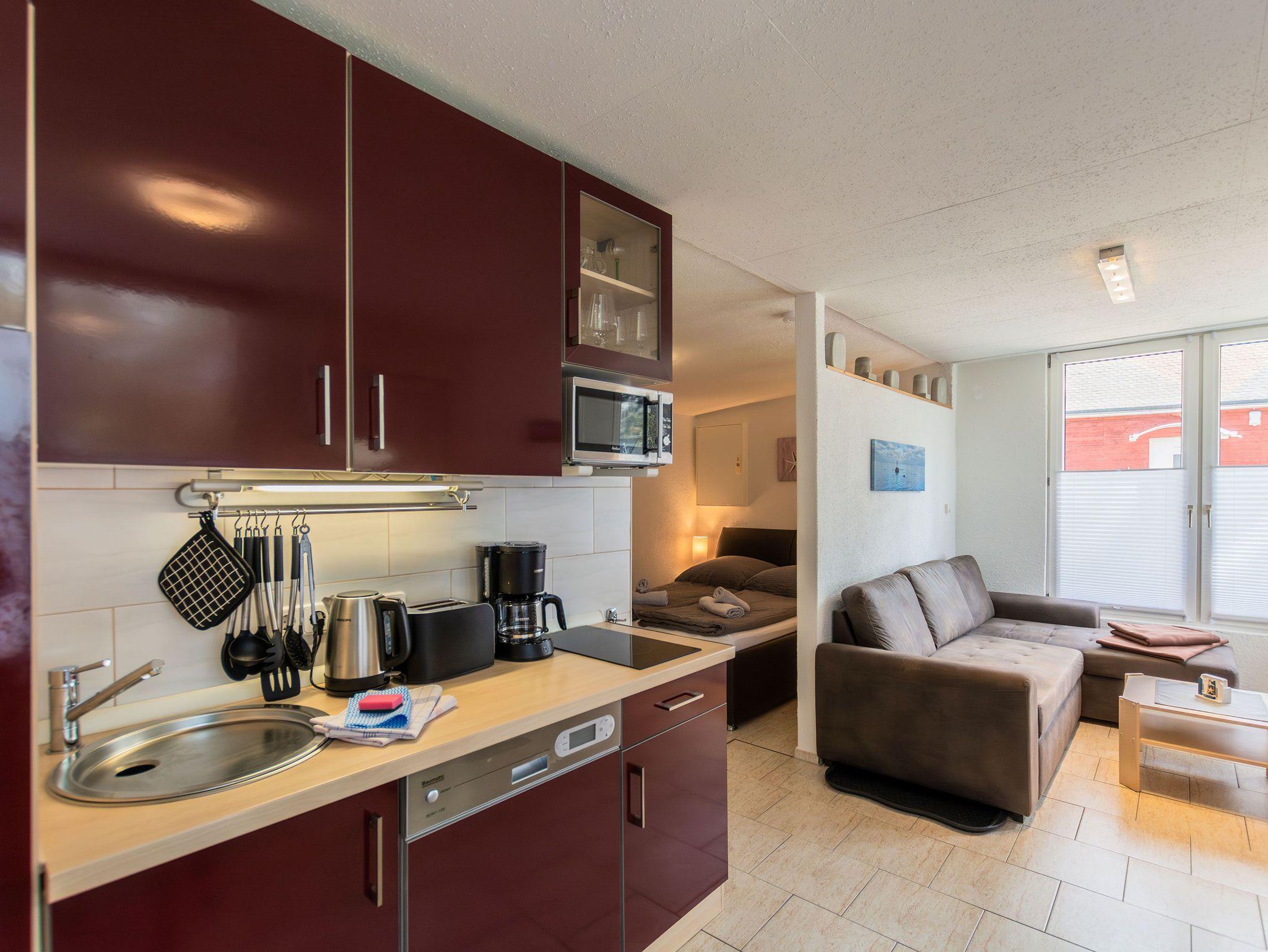 Die offene Küche ist mit einem kleinen Kochfeld, einem Geschirrspüler, einem Kühlschrank mit Tiefkühlfach, Kaffeefiltermaschine, Wasserkocher, Toaster sowie einer Mikrowelle ausgestattet. Ein kleiner Essbereich rundet das Gesamtangebot ab. Im Schlafbereich befinden sich 2 Einzelbetten und ein Kleiderschrank.