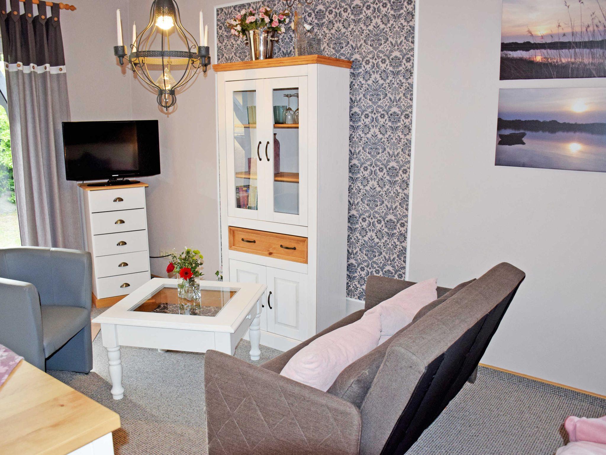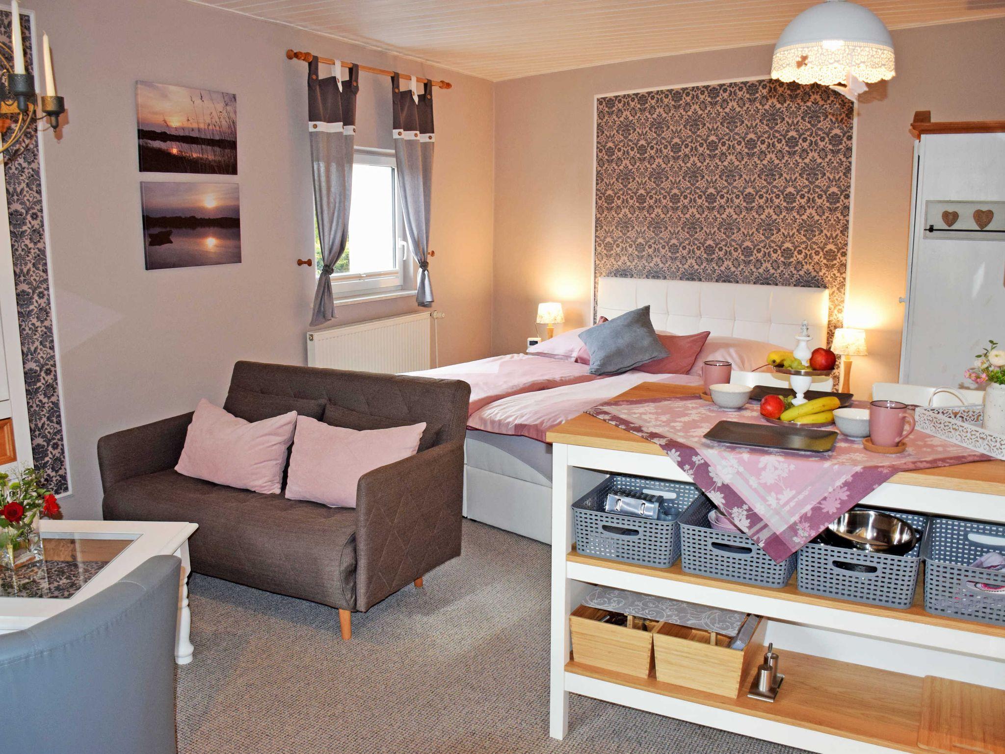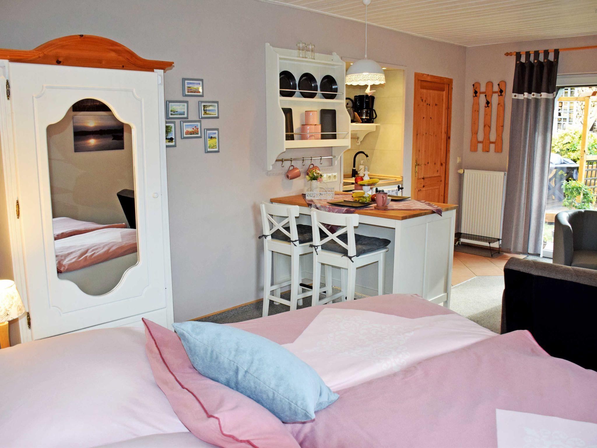 Unsere Ferienwohnung ist modern eingerichtet und verfügt über WLAN. Zur Ausstattung gehöhren ein bequemes Doppelbett, ein Sofa, eine kleine Kochnische, Internetanschluss und ein Bad mit Dusche und WC sowie Tageslicht. Zur Küchernausstattung gehören Toaster, Wasserkocher, Herd und Spüle. Die Ferienwohnung verfügt auch über TV und Radio, CD-Player, Handtücher und Bettwäsche sind vorhanden. An schönen Tagen können Sie, die zur Ferienwohnung gehörende Terrasse mit Sitzmöbeln oder die Liegewiese vor der Ferienwohnung nutzen. Hier gibt es auch eine Grillmöglichkeit.