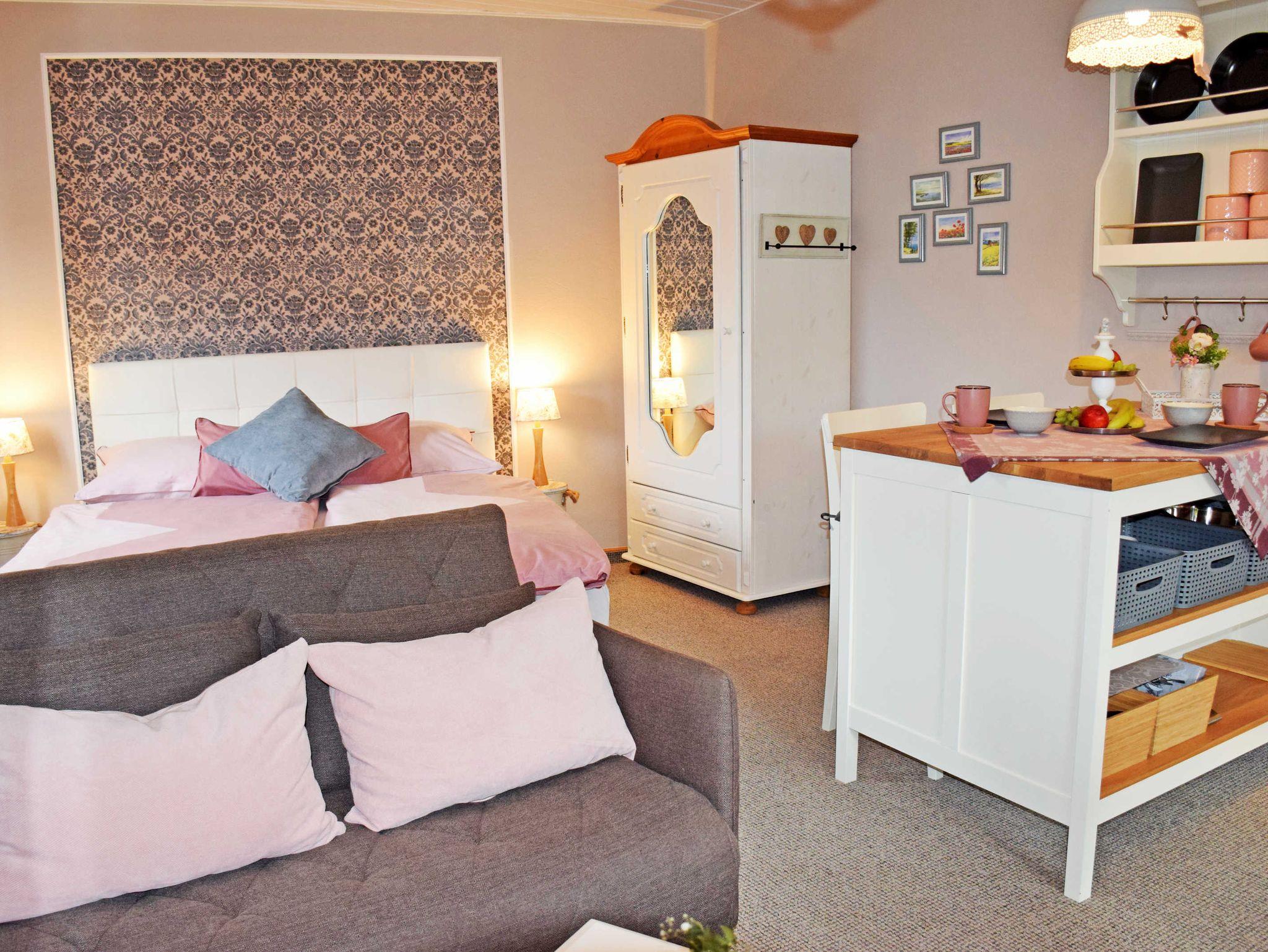 Die ruhig gelegene Ferienwohnung (max. 2 Erwachsene, Internetanschluss) befindet sich im EG der Rückseite eines Einzelhauses mit Garten. Im Wohn- / Essraum gehören zur Ausstattung: Ein Schlafsofa das bei Bedarf für ein Kind aufgebettet werden kann, Ablagemöglichkeiten, Sitzgelegenheiten, eine kleine Kochnische sowie ein bequemes Doppelbett. Das moderne Bad verfügt über Dusche und WC und hat Tageslicht.