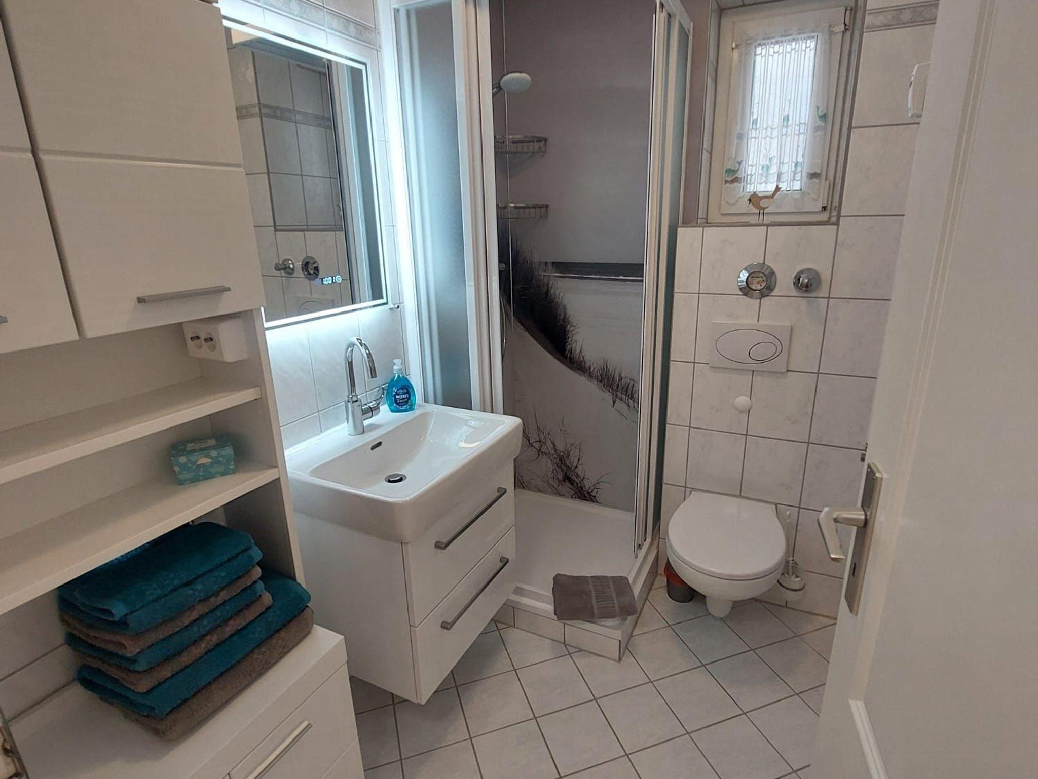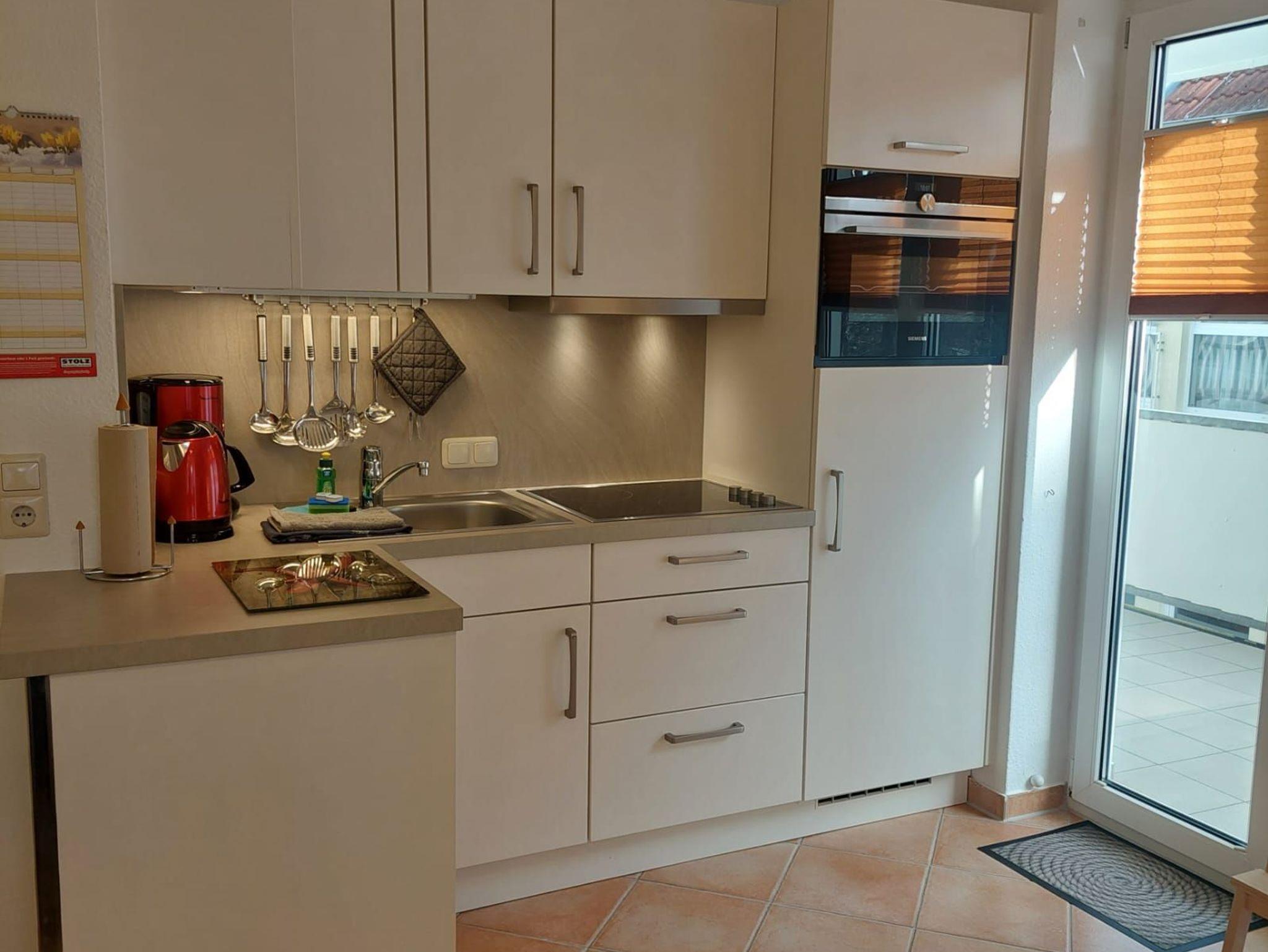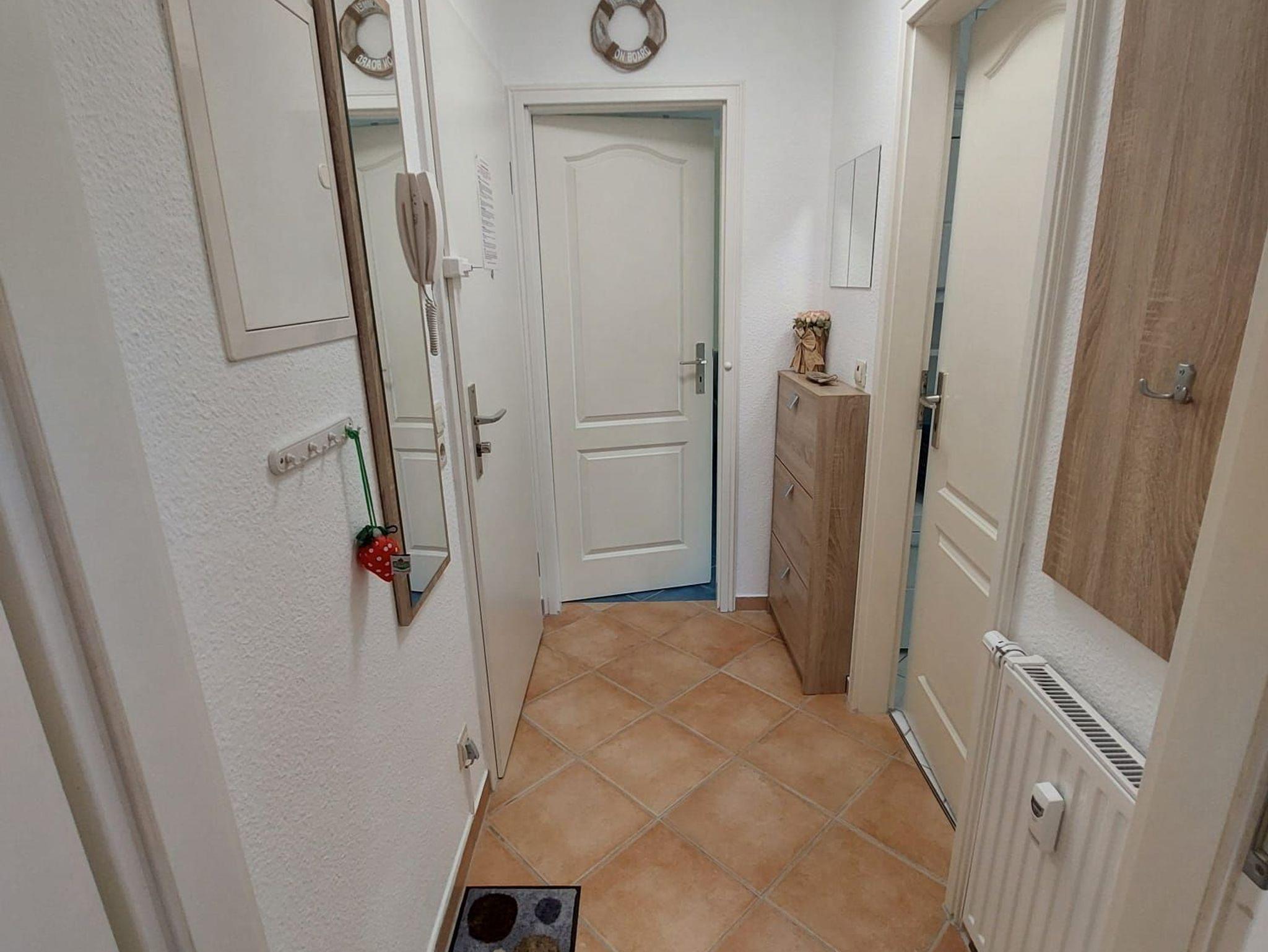2-Zimmer-Ferienwohnung mit Balkon: 41 m², 1 WZ mit Küchenzeile und Ausgang zum Balkon (2 Balkon-Alu-Hochlehner mit Auflagen u. passende Klapphocker, ein Tisch und Sichtschutz-Balkonumrandung) , ein großer TV Flachbildschirm (HD TV), Fliegengitter im WZ- Fenster, Hifi Anlage mit CD, Wohnwand mit Bücherregal, kostenloses WLAN, moderne Küchenzeile mit Geschirrspüler, Cerankochfeld, Backofen, großer Kühlschrank mit Gefrierfach, 1 SZ mit Ausgang zum Balkon, Doppelbett (1.90x1.80 m), Kleiderschrank inkl. Spiegel, verdunkelte Plissees, ruhige Lage, 1 gefliestes Bad mit Fenster, WB, WC, Dusche mit flachen Einstieg, Waschplatz, beleuchteter Spiegel mit Uhrzeit, beheizter Handtuchhalter, Föhn, Fenster, kleiner Flur mit Schuhschrank, Flurgarderobe, Spiegel, Ferienwohnung komplett gefliest