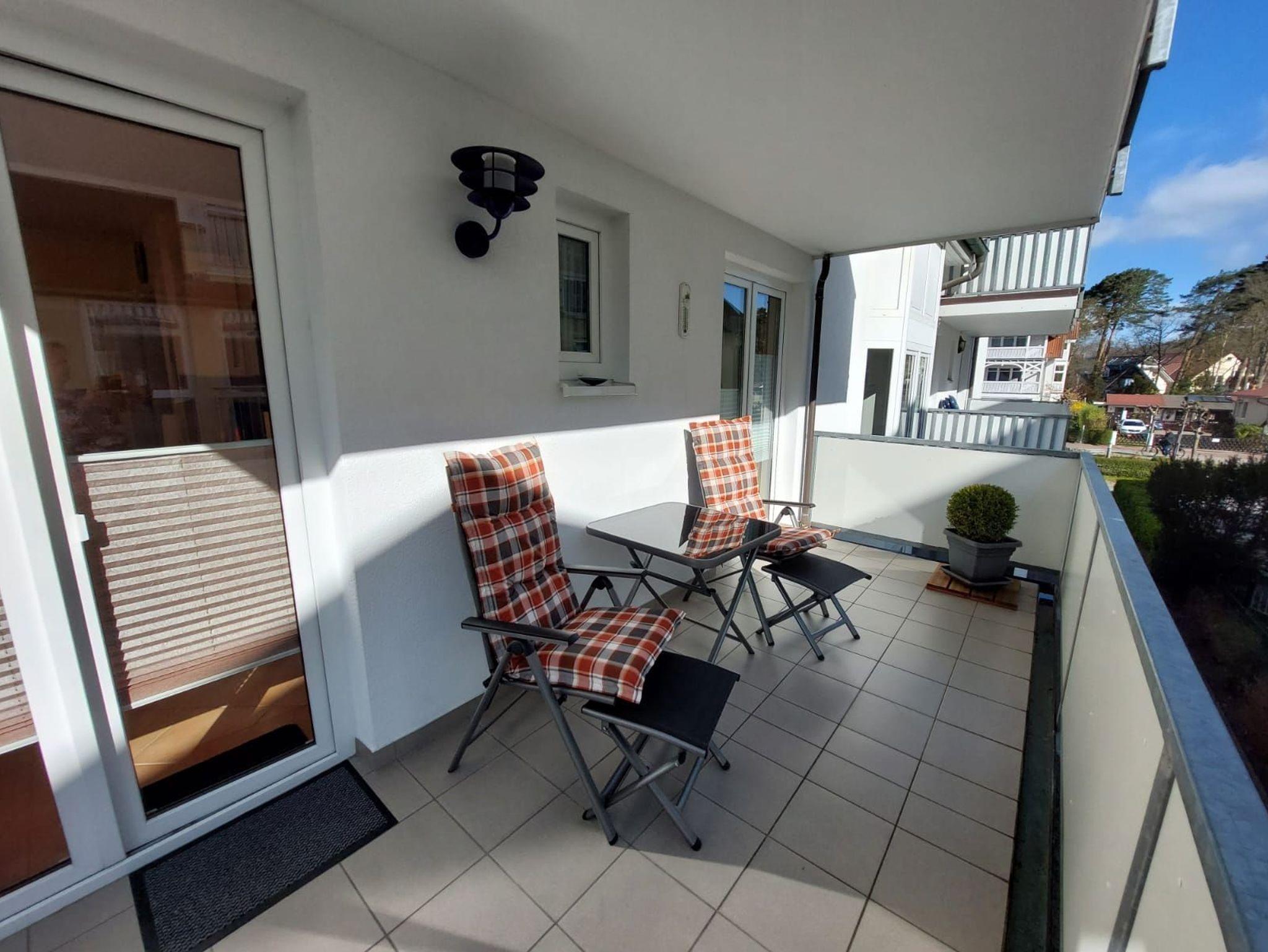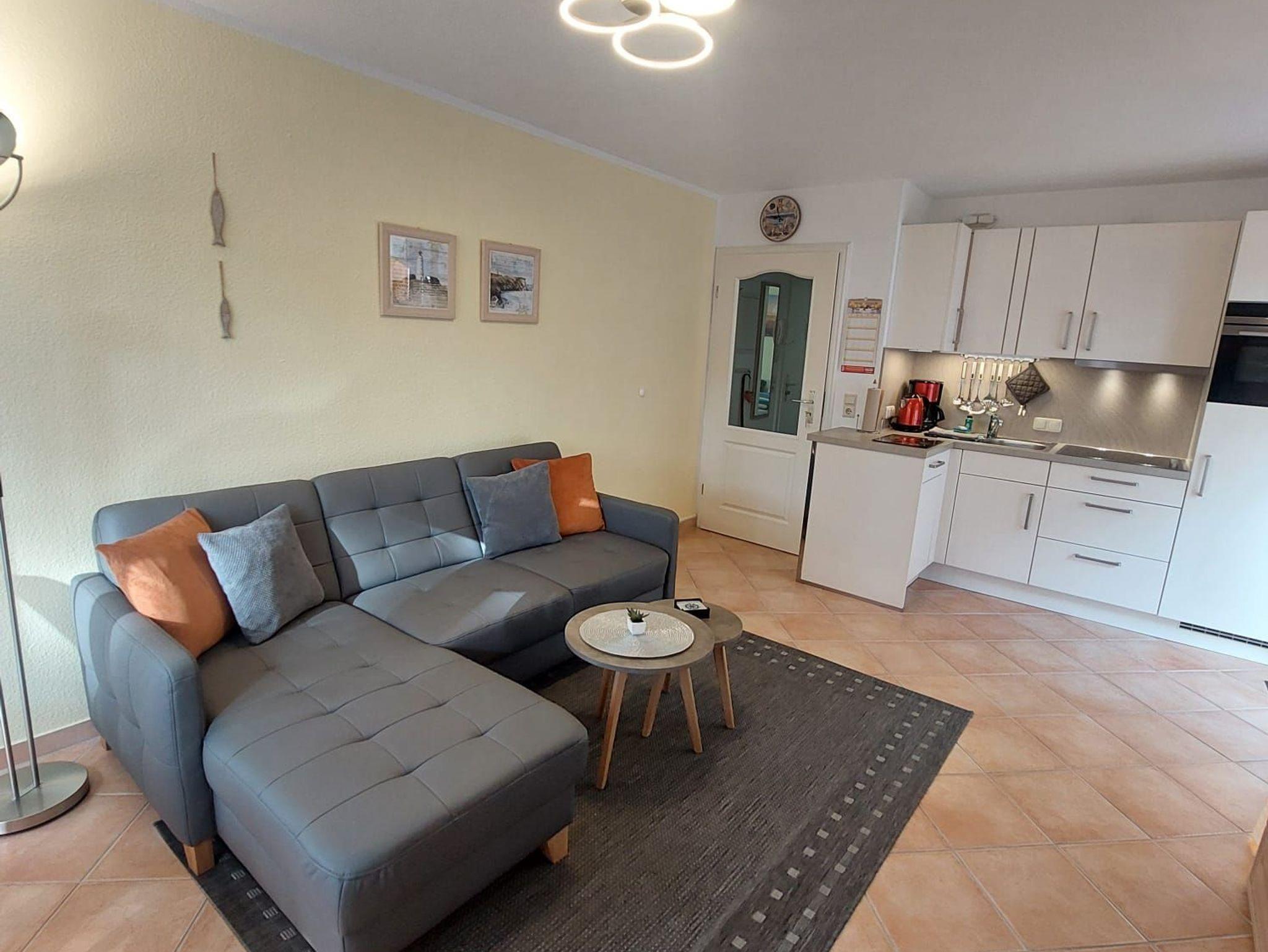Die moderne und maritim eingerichtete NICHTRAUCHER-Ferienwohnung Strandvogel 3, 41 qm, max. 2 Gäste, Wohnzimmer, Schlafzimmer, Bad/Dusche, Küchenzeile im WZ, Lift, WLAN, Balkon) liegt angenehm ruhig in der ersten Etage eines 2001 errichteten Appartementhauses, nur etwa 400 m vom feinsandigen Badestrand an der Ostsee.