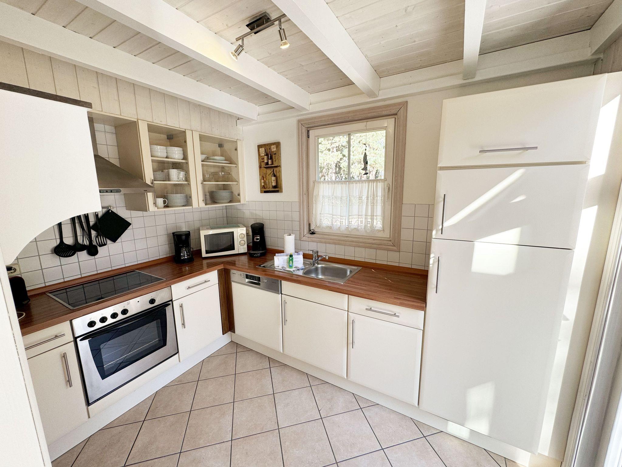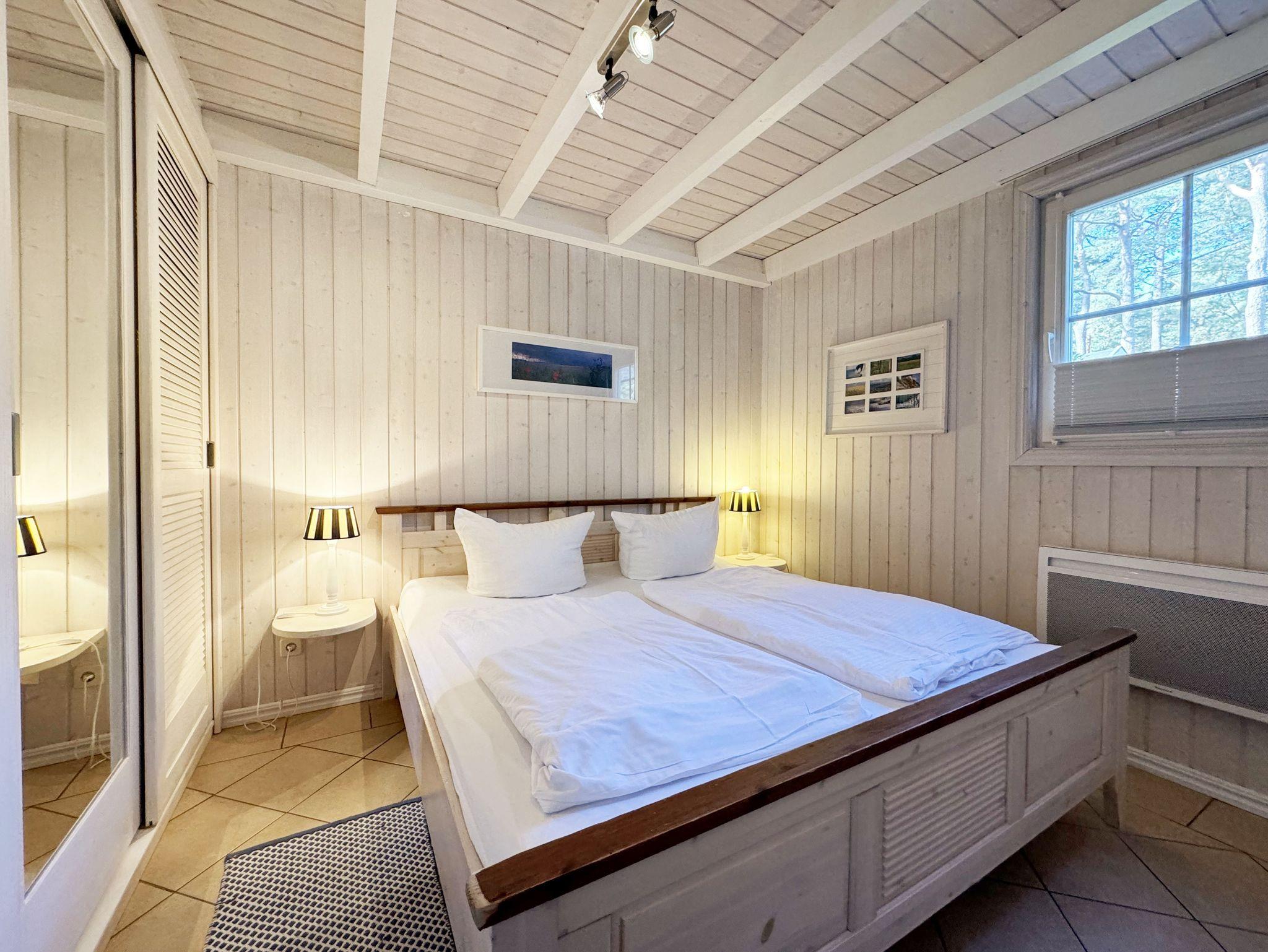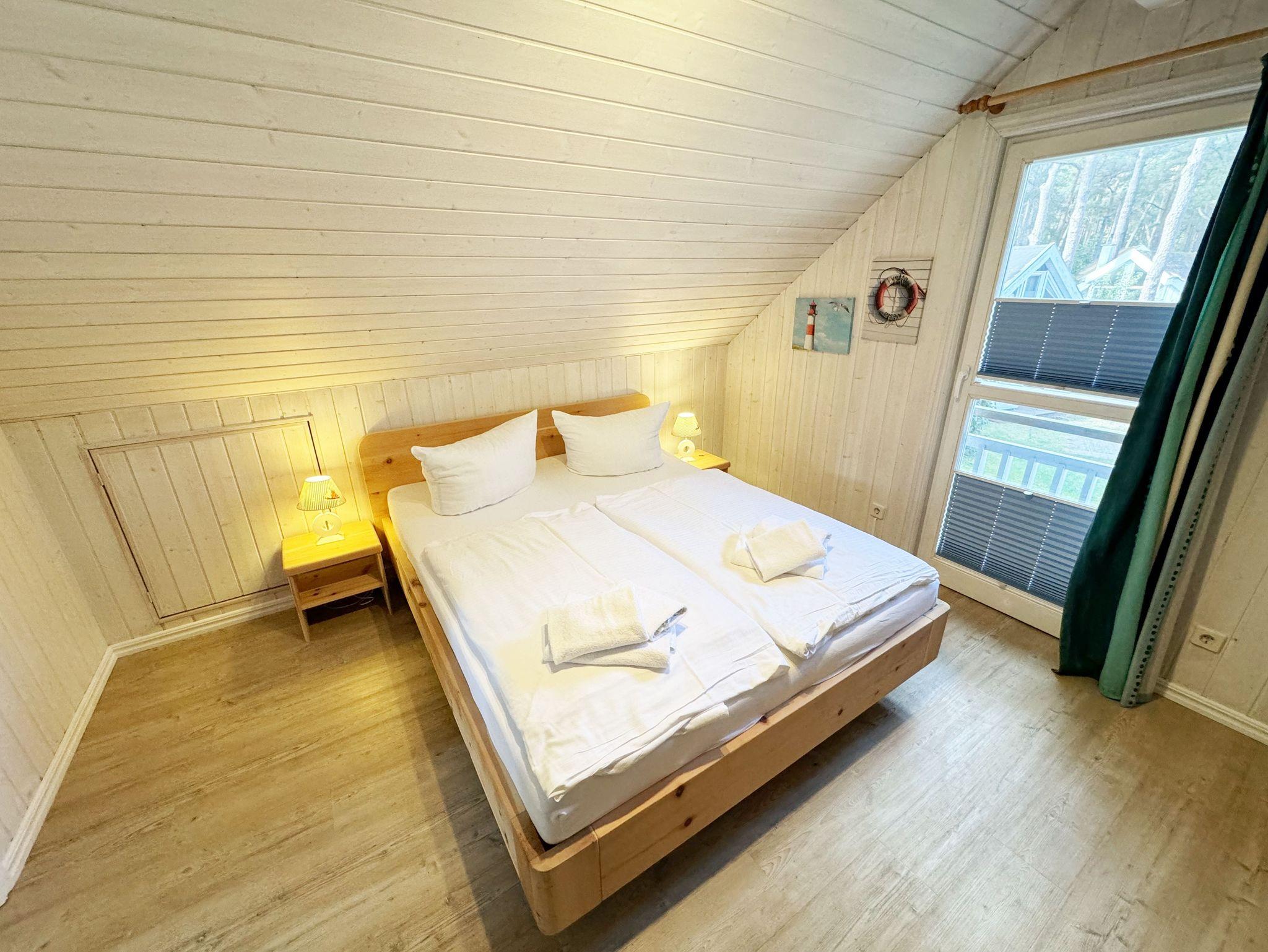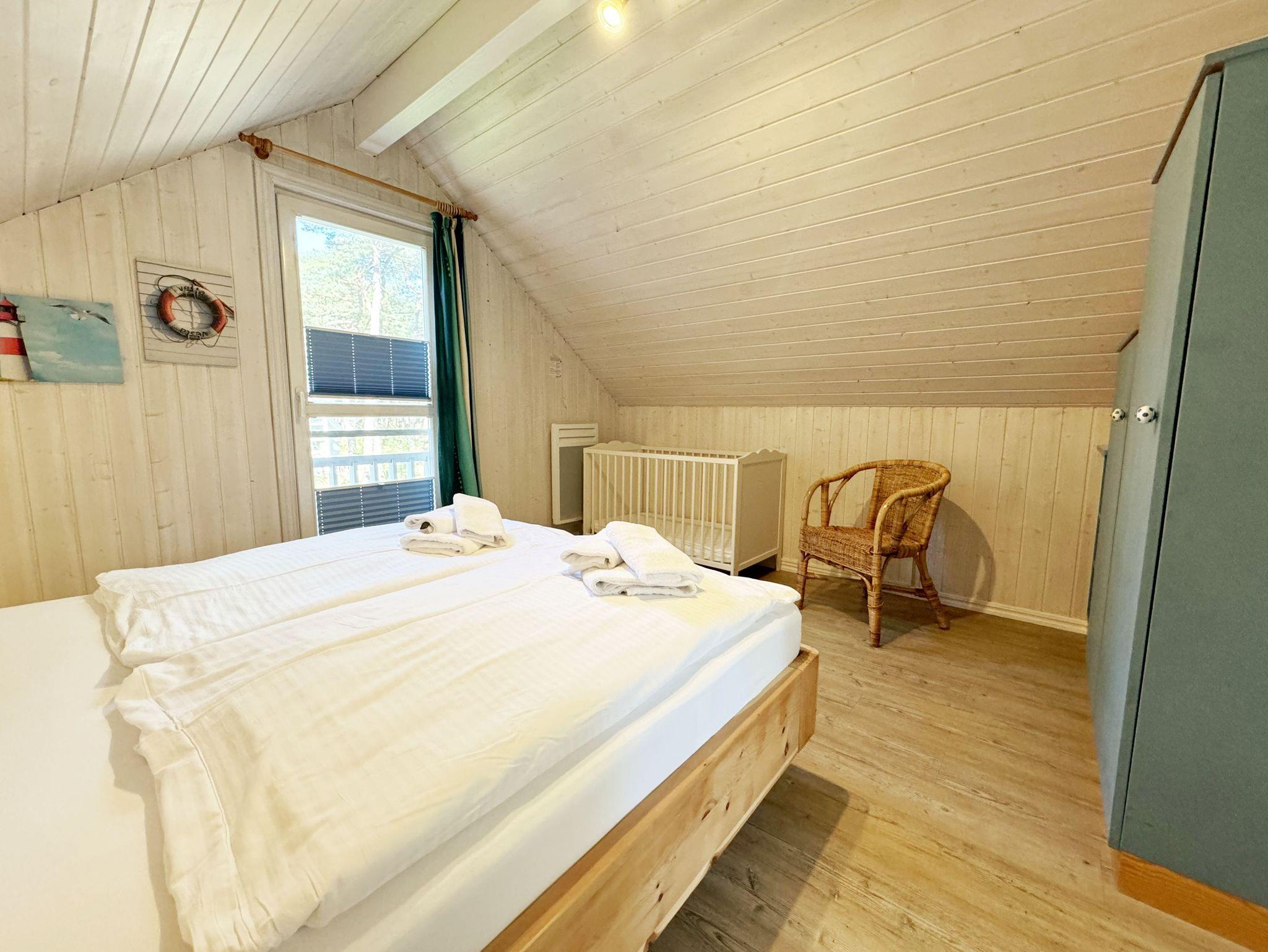 Das haustierfreie Nichtraucherferienhaus „Sandkörnchen“ bietet ausreichend Platz für 4 Erwachsene und 1 Kleinkind bis 3 Jahre im Kinderbett. Das 80 qm große Holzhaus in typisch skandinavischem Stil ist sehr liebevoll ausgestattet und bietet eine hochwertige Einrichtung auf zwei Etagen. Es erwartet Sie im Erdgeschoss ein großer Wohn- und Essbereich mit Kaminofen und Smart-TV, Blu Ray-Player sowie ein DAB-Radio-CD-Player. Auch auf einen Internetanschluss über WLAN brauchen Sie im Urlaub nicht verzichten. Dieser ist für Sie inklusive. Zwei gemütliche Ledercouchen mit Couchtisch und einem Sideboard garantieren entspannende Abende. Insektenschutzgitter befinden sich im Erdgeschoss sowie der Terrassentür. Der lichtdurchflutete stilvolle Essbereich mit Vollholzmöbeln bietet Ihnen ausreichend Platz für 4 Personen. Die moderne Einbauküche ist ausgestattet mit allem was man für das alltägliche Leben braucht. Deshalb gehören ein Kühlschrank mit Gefrierfach, ein Backofen mit Ceranfeld und Dunstabzug, eine Mikrowelle, eine Spülmaschine, ein nickelfreier Wasserkocher, eine Kaffeemaschine, eine Senseo Padmaschine, ein Toaster, ein Eierkocher, ein Mixer, Teekannen, reichlich Geschirr und Gläser sowie selbstverständlich alle weiteren Utensilien zum Kochen und Essen zum Inventar. Ebenfalls Teil des Erdgeschosses ist ein Schlafzimmer mit einem Doppelbett (1,80 m x 2,00 m) mit hochwertigen Kaltschaummatratzen und verstellbaren Lattenrosten, einem Nachtschrank und einer Nachttischablage sowie einem dreitürigen Kleiderschrank mit Spiegel. Insektenschutzgitter und Verdunklungsplissees sorgen hier für einen ruhigen, erholsamen Schlaf. Das großzügige Bad mit ebenerdiger Dusche, Eckbadewanne, Sauna, Waschmaschine, Handtuchtrockner, Fön und großem Waschtisch wird Sie begeistern. Sie erreichen es vom Flur aus, welcher mit Schuhschrank, Garderobe und Spiegel möbliert ist. Im Wohnbereich sowie im Bad sorgt die Fußbodenheizung für angenehme Wärme. In der 1. Etage befindet sich eine helle Galerie mit großer Fensterfront und gemütlicher Sitzecke, kleinem Tisch und Leselampe mit Blick zum Meer und in den Kiefernwald. Das zweite Schlafzimmer, gemütlich unter Dachschrägen, ist von hier aus erreichbar. Es ist mit einem Massivholzbett (1,60 m x 2,00 m), verstellbare Lattenroste, 2 Nachttischablagen, einem stabilen Kinderbett sowie einem Kleiderschrank ausgestattet. Das Fenster ist auch hier mit einem Verdunklungsplissees und Insektenschutzgitter versehen. Für unsere kleinen Gäste stehen 1x Hochstuhl und 1x stabiles Kinderbett (ohne Bettinlett) inklusive zur Verfügung. Haustiere sind im Haus nicht erlaubt. Auf der großzügigen bestuhlten Holzterrasse (Südost/West) haben ein Strandkorb (Mai-September), Sonnenliegen und ein Sonnenschirm zusätzlich ihren Platz gefunden. Eine angenehme Wärme wird durch Infrarotheizkörper ausgestrahlt. Für Ihre Räder befindet sich am Haus ein Fahrradständer. Im Anbauschuppen können Sie diverse Strandutensilien unterbringen. Ein PKW-Stellplatz (Nr. 271) befindet sich direkt vor dem Haus. Ab einem Aufenthalt von 7 Nächten, ist ein Sack Kaminholz in der Zeit vom 01.Oktober bis 30. April für Sie inklusive. Die Erstausstattung eines Wäschepaketes (komplette Bettwäsche, 1 Duschhandtuch, 2 kleine Handtücher) können Sie bis 14 Tage vor Anreise gegen einen Aufpreis dazu buchen oder durch eigene ergänzen. Ab 2 gebuchten Paketen erhalten Sie einmalig 1 Geschirrhandtuch und 1 Duschvorleger hinzu.