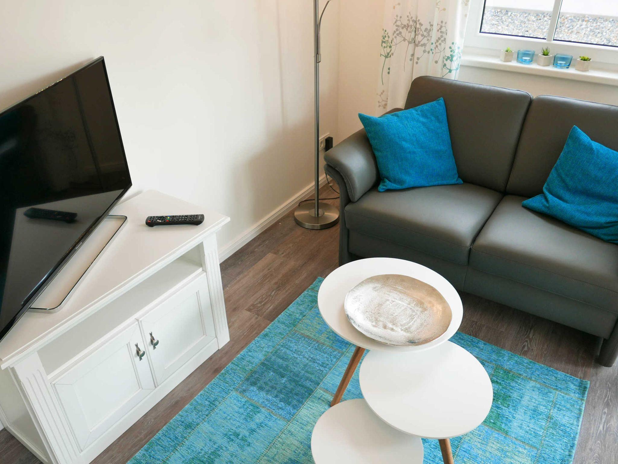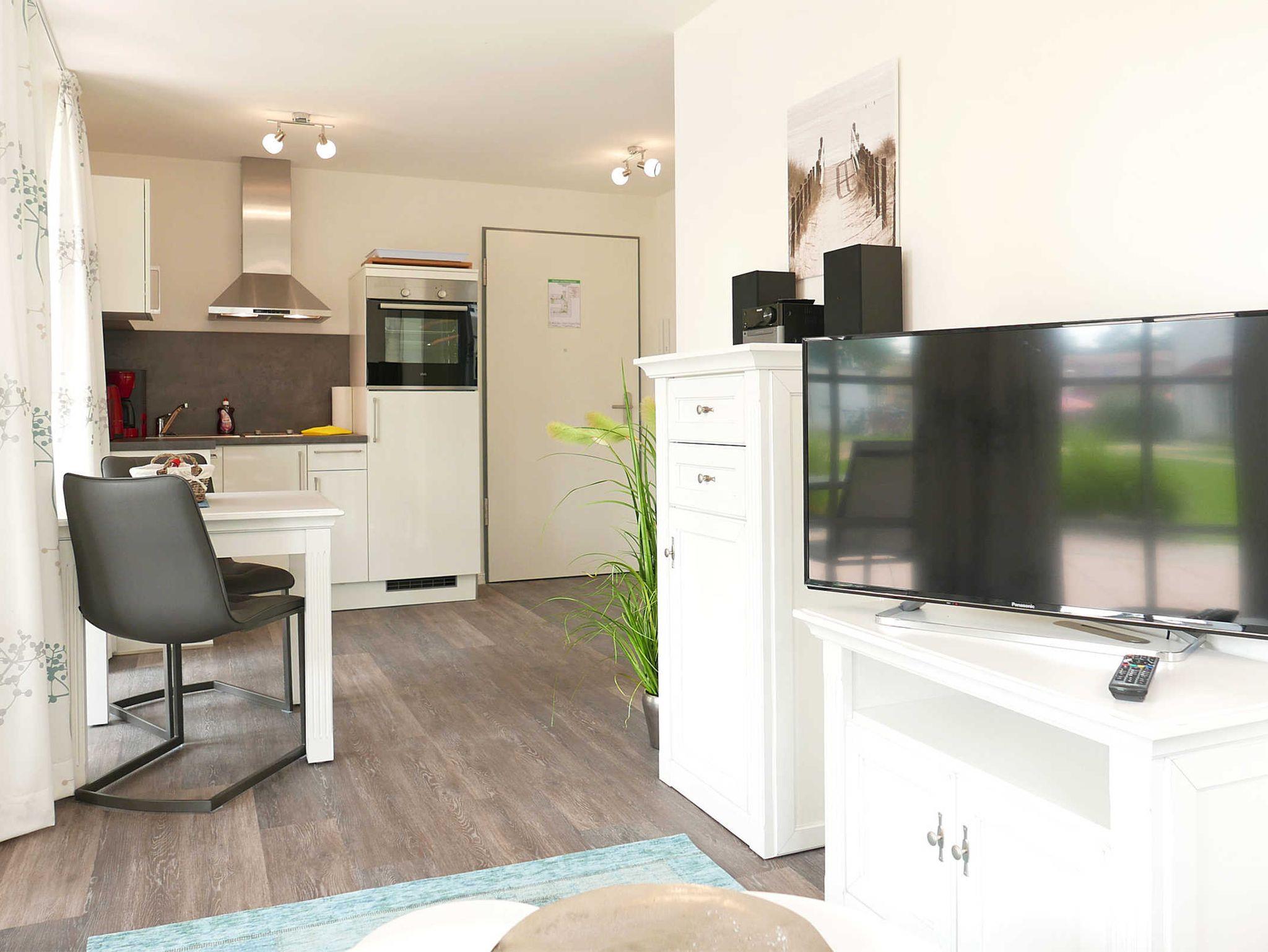 Die 2-Zimmer-Ferienwohnung für 2 Personen liegt im Erdgeschoss des Hauses. Von hier haben Sie einen direkten Zugang zum Strand. Das Schlafzimmer ist mit einem hochwertigen Boxspringbett (180 x 200 cm) ausgestattet. Der Wohn-/Essbereich verfügt über eine moderne Küchenzeile, einem Essplatz sowie einem gemütlichen Sofabereich. Auf der großzügigen Terrasse lässt sich herrlich frühstücken. Die Wohnung ist stufenfrei und allergikerfreundlich.