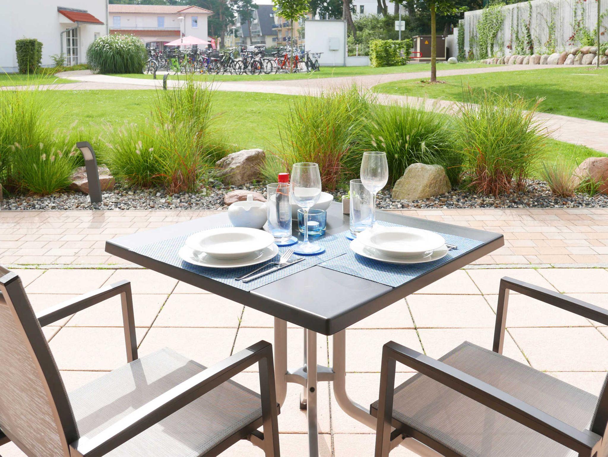 Moderne 2-Zimmer-Ferienwohnung für 2 Personen mit gemütlichem Sofabereich, hochwertiger Ausstattung und großzügiger Terrasse im Haus Meeresblick. Von hier haben Sie einen direkten Zugang zum Strand. Das Haus ist mit einem Fahrstuhl, einer Tiefgarage und einem großen Wellnessbereich mit Schwimmbad (ca. 8,00 m x 4,00 m - 1,35 m tief), zwei Saunen (eine finnische Sauna/eine Bio-Sauna) und einem Massagebereich ausgestattet.