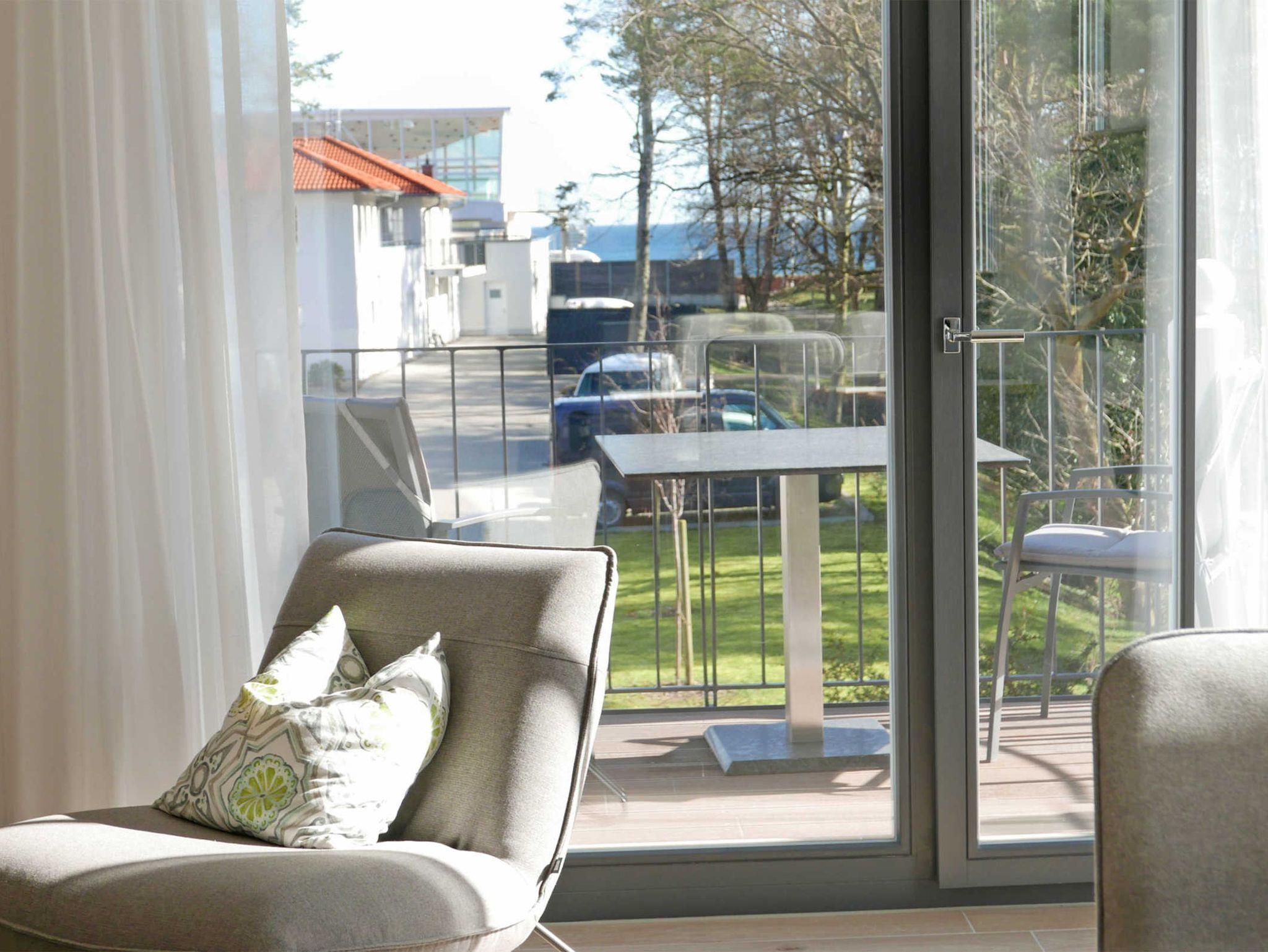 Die bodentiefen Fenster im Wohnbereich bieten einen Blick bis zum Meer. Auf dem Balkon befinden sich Stühle und Tische, auf denen Sie den Blick aufs Meer genießen können.