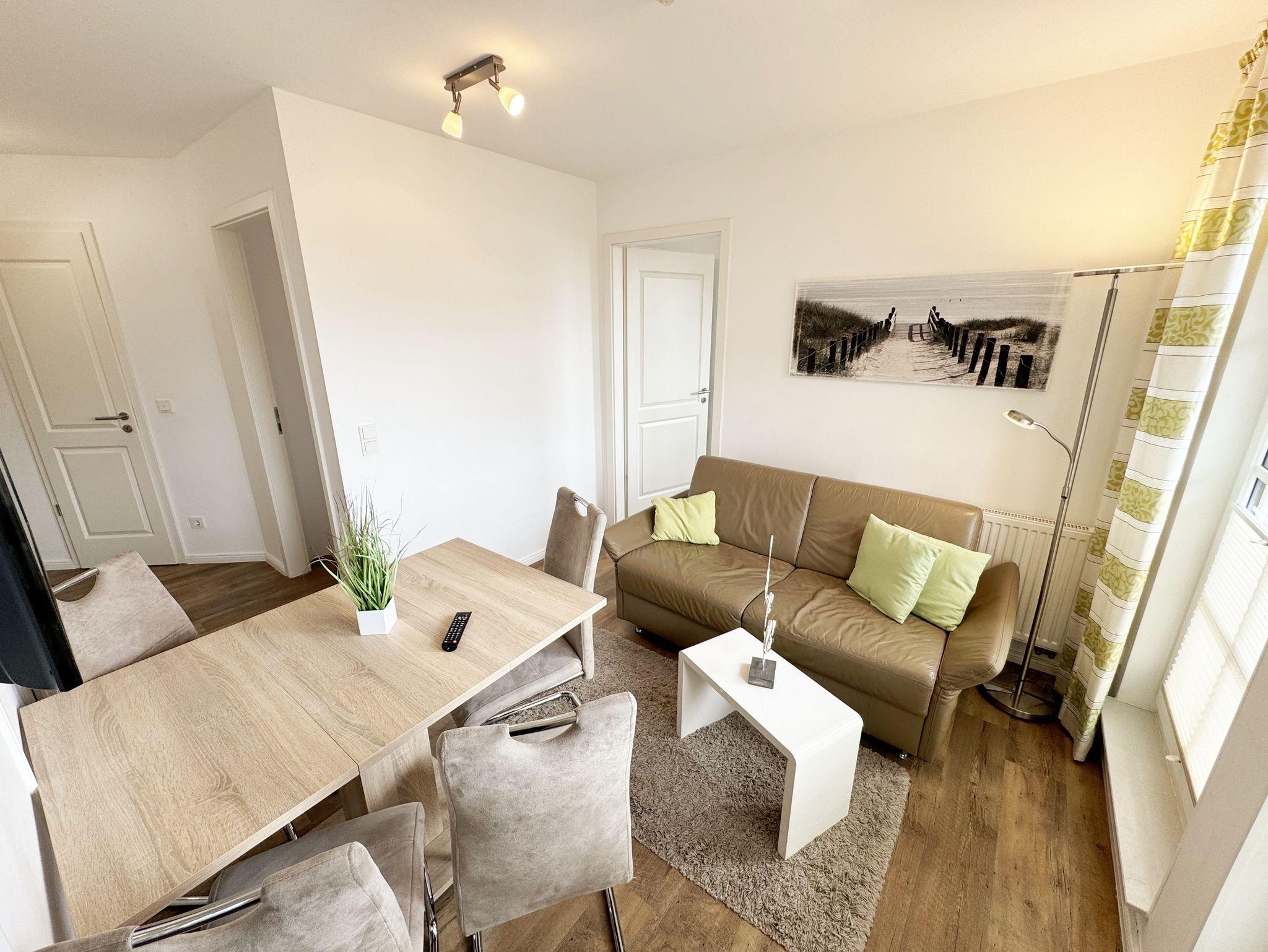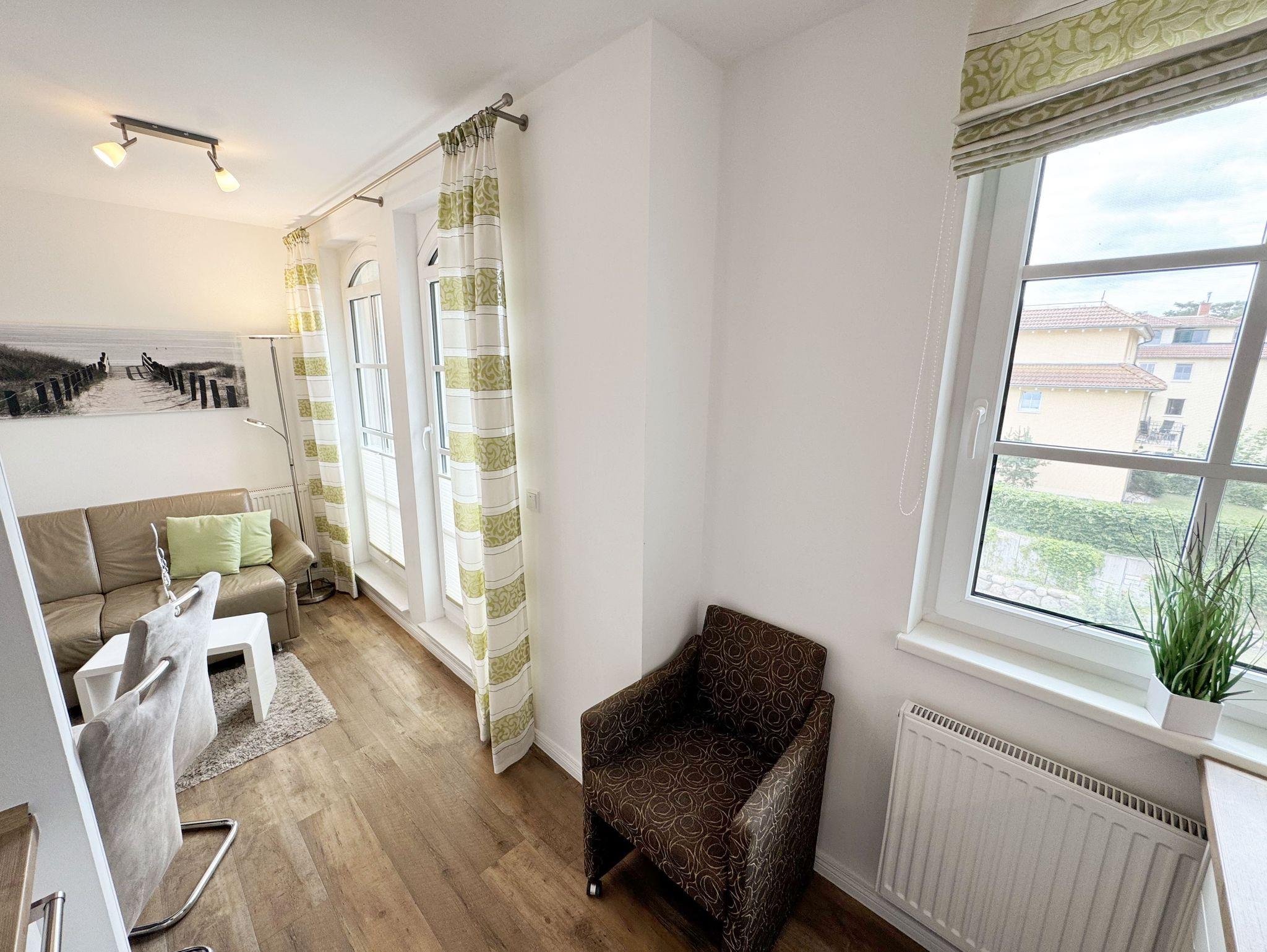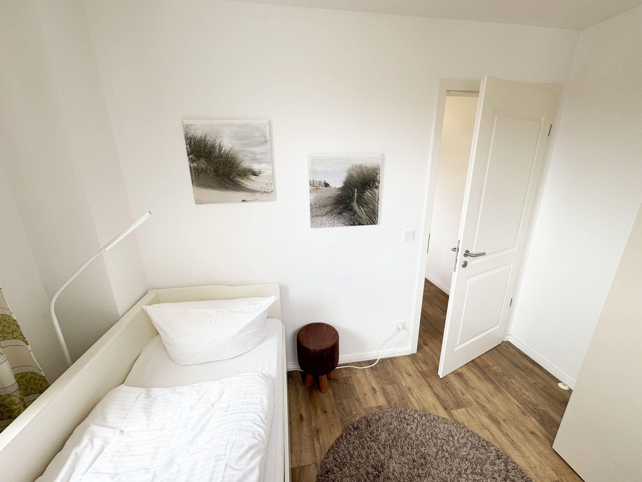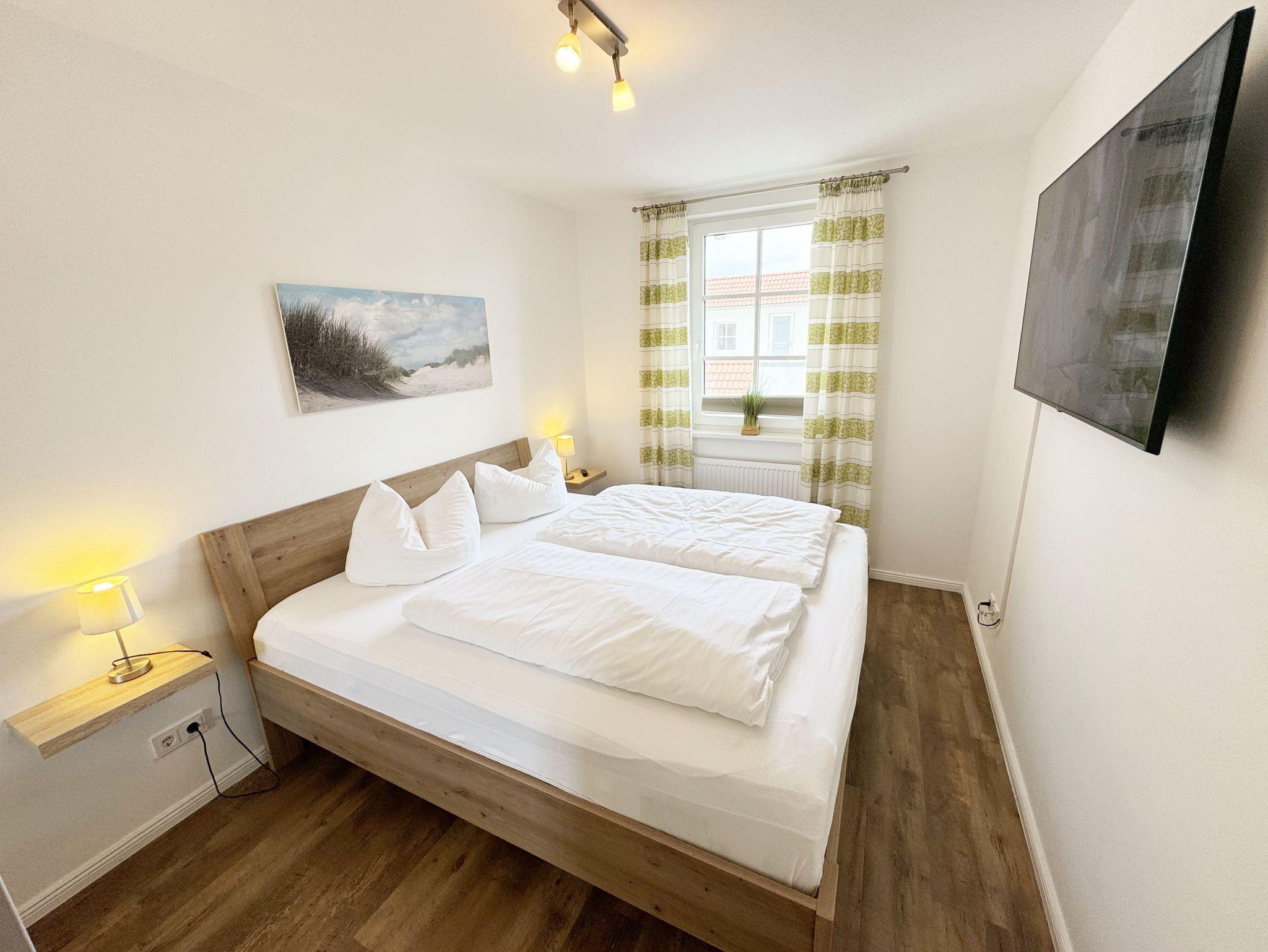 Herzlich Willkommen in Ihrer Nichtraucher/Ferienwohnung, die mit viel Liebe zum Detail ausgestattet und eingerichtet worden ist. Sie wohnen in einer 3-Zimmer Wohnung (ca. 44 qm), die für 2 bis 4 Personen ausgelegt ist. Die Wohnung A 3.19 befindet sich in der 2. Etage und ist per Fahrstuhl vom Haupthaus durch den Flur bequem zu erreichen. In der hellen Wohnung finden Sie einen kombinierten Wohn-, Koch- und Essbereich. Die moderne integrierte Küchenzeile lässt keine Wünsche offen. Eine Mikrowelle mit Grillfunktion, Ceranfeld, moderne Abzugshaube, Spülmaschine, Kühlschrank mit Gefrierfach, Kaffeemaschine und andere praktische Helfer lassen beim Kochen keine Wünsche offen. Ein Essplatz mit 4 Stühlen ist im Küchenbereich integriert. In dem sich anschließenden Wohnbereich ist eine gemütliche Couch, eine Leselampe, LCD-TV, und ein DAB-Radio vorhanden. Auch auf einen Internetanschluss (WLAN) müssen Sie im Urlaub nicht verzichten. Dieser ist für Sie inklusive! Durch die großen lichtdurchfluteten Balkonfenster gelangen Sie direkt auf den bestuhlten Balkon mit Sonnenschirm, der mit einer Südausrichtung zum Kurpark und Inselparadies einlädt. Das 1. Schlafzimmer der Wohnung ist mit einem Doppelbett (1,80 m x 2,00 m), Nachttischkonsolen, Kleiderschrank, Smart-TV, Insektenschutzgitter und Verdunklungsplissees liebevoll eingerichtet. Das 2. Schlafzimmer verfügt über ein Kojen Bett (gesamte Liegefläche 1,60 m x 2,00 m für 1 bis 2 Personen) mit hochwertigen Matratzen, welches einfach und bequem zu bedienen ist. Verdunklungsplissees und Fliegenschutzgitter runden den Komfort im 2. Schlafzimmer ab. Das moderne Bad ist mit einer ebenerdigen Dusche mit Klarglasfront, Waschtisch, WC, Haartrockner und einem Handtuchheizkörper ausgestattet. Für unsere kleinen Gäste haben Sie 1x Kinderhochstuhl in der Wohnung inklusive. Ein eigener PKW-Stellplatz (123, Einfahrtshöhe 2,00m) befindet sich in der Tiefgarage des Hauses. Im Keller des Hauses haben Sie die Möglichkeit eine Waschmaschine/Trockner gegen Gebühr zu nutzen. Mit dem Fahrstuhl des Hauses A gelangen sie in das Untergeschoss der Meeresblickanlage, wo Sie ein großzügiger und heller Wellnessbereich erwartet. Hier können sie in einem Pool kleine Bahnen schwimmen, in 2 Saunen Ihren Kreislauf in Schwung bringen, in einem dazugehörigen Ruheraum Ihren Körper wieder beruhigen, in einer Schneckendusche sowie weiteren Duschen das kühle Nass genießen und auf einer Außenterrasse mit Außendusche die frische Luft einatmen. Die Erstausstattung eines Wäschepaketes (komplette Bettwäsche, 1 Duschhandtuch, 2 kleine Handtücher) können Sie bis 14 Tage vor Anreise gegen einen Aufpreis dazu buchen oder durch eigene ergänzen. Ab 2 gebuchten Paketen erhalten Sie einmalig 1 Geschirrhandtuch und 1 Duschvorleger hinzu.