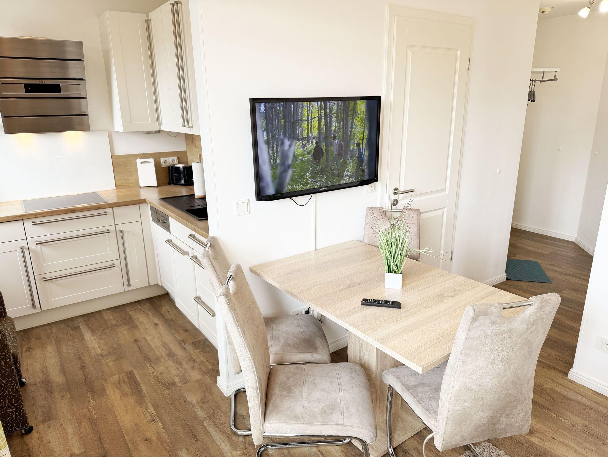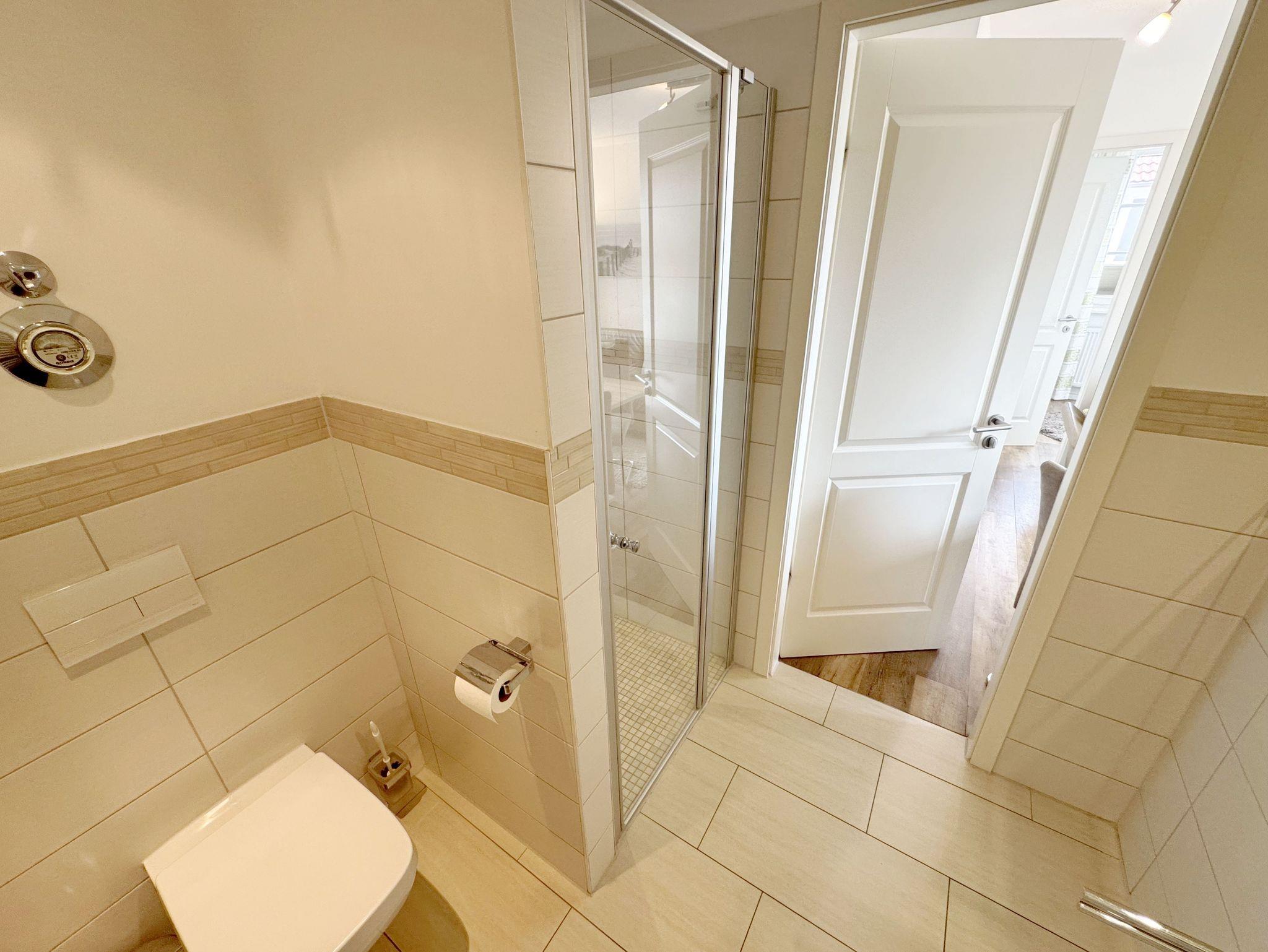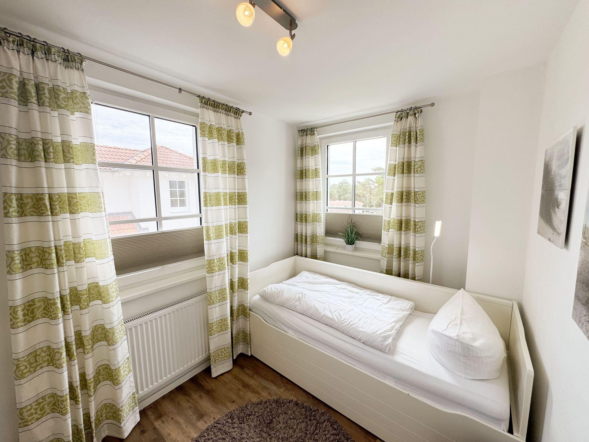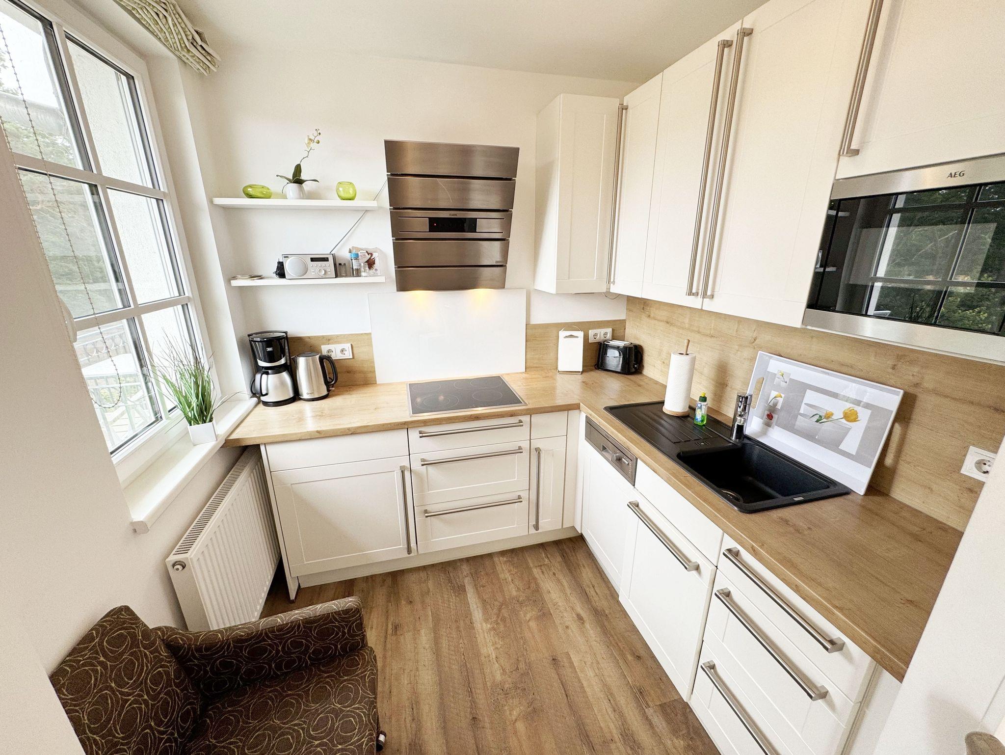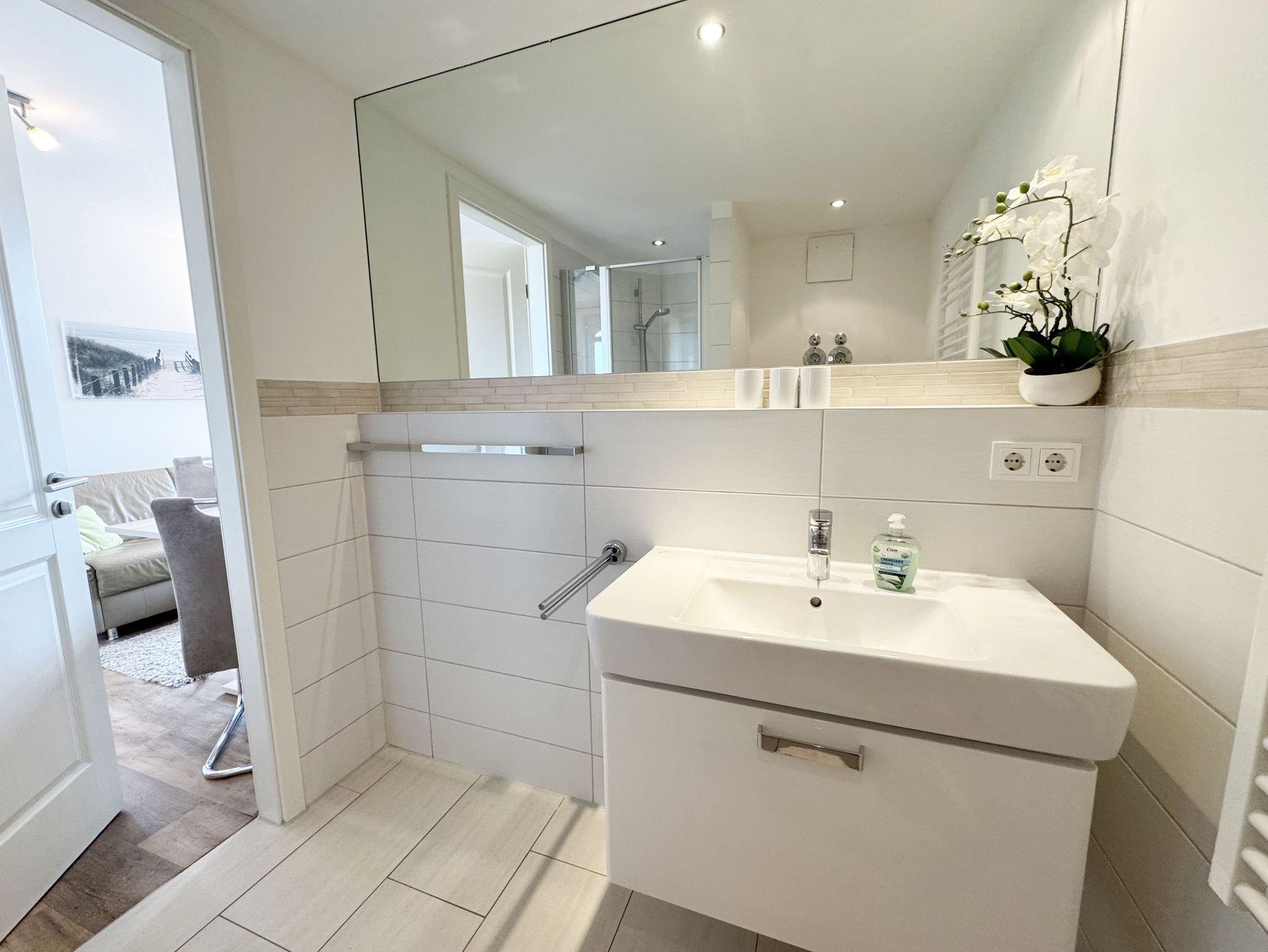 Herzlich Willkommen in Ihrer Nichtraucher/Ferienwohnung, die mit viel Liebe zum Detail ausgestattet und eingerichtet worden ist. Sie wohnen in einer 3-Zimmer Wohnung (ca. 44 qm), die für 2 bis 4 Personen ausgelegt ist. Die Wohnung A 3.19 befindet sich in der 2. Etage und ist per Fahrstuhl vom Haupthaus durch den Flur bequem zu erreichen. In der hellen Wohnung finden Sie einen kombinierten Wohn-, Koch- und Essbereich. Die moderne integrierte Küchenzeile lässt keine Wünsche offen. Eine Mikrowelle mit Grillfunktion, Ceranfeld, moderne Abzugshaube, Spülmaschine, Kühlschrank mit Gefrierfach, Kaffeemaschine und andere praktische Helfer lassen beim Kochen keine Wünsche offen. Ein Essplatz mit 4 Stühlen ist im Küchenbereich integriert. In dem sich anschließenden Wohnbereich ist eine gemütliche Couch, eine Leselampe, LCD-TV, und ein DAB-Radio vorhanden. Auch auf einen Internetanschluss (WLAN) müssen Sie im Urlaub nicht verzichten. Dieser ist für Sie inklusive! Durch die großen lichtdurchfluteten Balkonfenster gelangen Sie direkt auf den bestuhlten Balkon mit Sonnenschirm, der mit einer Südausrichtung zum Kurpark und Inselparadies einlädt. Das 1. Schlafzimmer der Wohnung ist mit einem Doppelbett (1,80 m x 2,00 m), Nachttischkonsolen, Kleiderschrank, Smart-TV, Insektenschutzgitter und Verdunklungsplissees liebevoll eingerichtet. Das 2. Schlafzimmer verfügt über ein Kojen Bett (gesamte Liegefläche 1,60 m x 2,00 m für 1 bis 2 Personen) mit hochwertigen Matratzen, welches einfach und bequem zu bedienen ist. Verdunklungsplissees und Fliegenschutzgitter runden den Komfort im 2. Schlafzimmer ab. Das moderne Bad ist mit einer ebenerdigen Dusche mit Klarglasfront, Waschtisch, WC, Haartrockner und einem Handtuchheizkörper ausgestattet. Für unsere kleinen Gäste haben Sie 1x Kinderhochstuhl in der Wohnung inklusive. Ein eigener PKW-Stellplatz (123, Einfahrtshöhe 2,00m) befindet sich in der Tiefgarage des Hauses. Im Keller des Hauses haben Sie die Möglichkeit eine Waschmaschine/Trockner gegen Gebühr zu nutzen. Mit dem Fahrstuhl des Hauses A gelangen sie in das Untergeschoss der Meeresblickanlage, wo Sie ein großzügiger und heller Wellnessbereich erwartet. Hier können sie in einem Pool kleine Bahnen schwimmen, in 2 Saunen Ihren Kreislauf in Schwung bringen, in einem dazugehörigen Ruheraum Ihren Körper wieder beruhigen, in einer Schneckendusche sowie weiteren Duschen das kühle Nass genießen und auf einer Außenterrasse mit Außendusche die frische Luft einatmen. Die Erstausstattung eines Wäschepaketes (komplette Bettwäsche, 1 Duschhandtuch, 2 kleine Handtücher) können Sie bis 14 Tage vor Anreise gegen einen Aufpreis dazu buchen oder durch eigene ergänzen. Ab 2 gebuchten Paketen erhalten Sie einmalig 1 Geschirrhandtuch und 1 Duschvorleger hinzu.