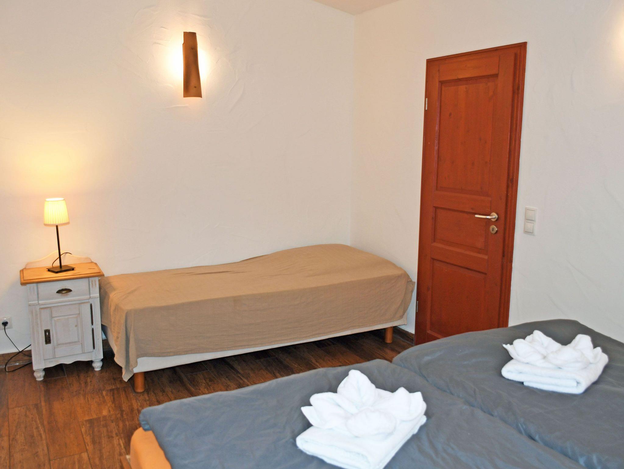 Im Schlafzimmer stehen ein bequemes Doppelbett mit Nachttischen und Leselampen sowie ein Kleiderschrank und ein Einzelbett.