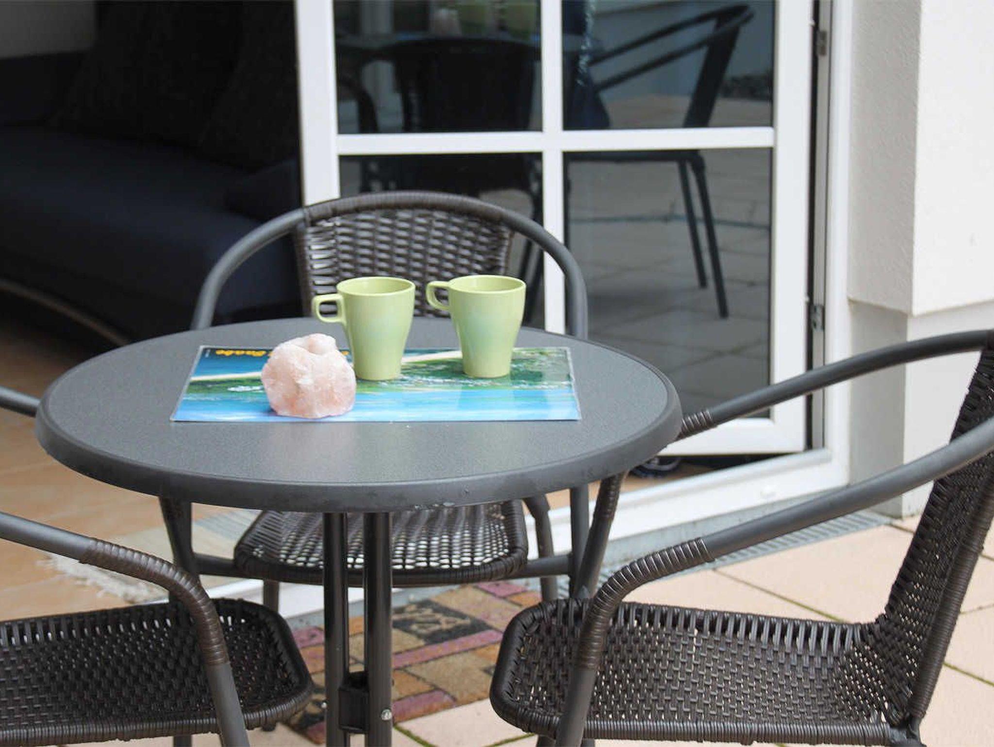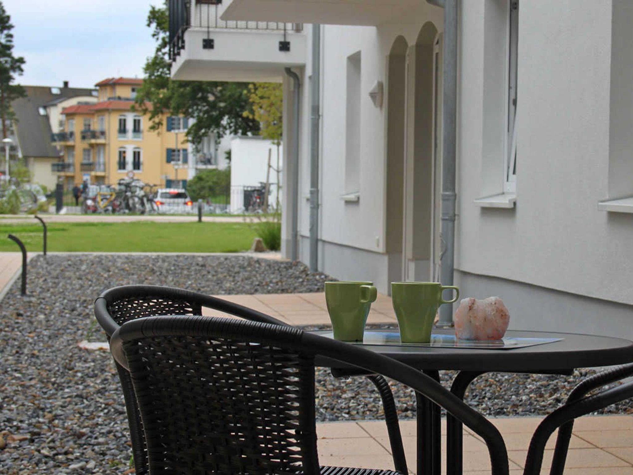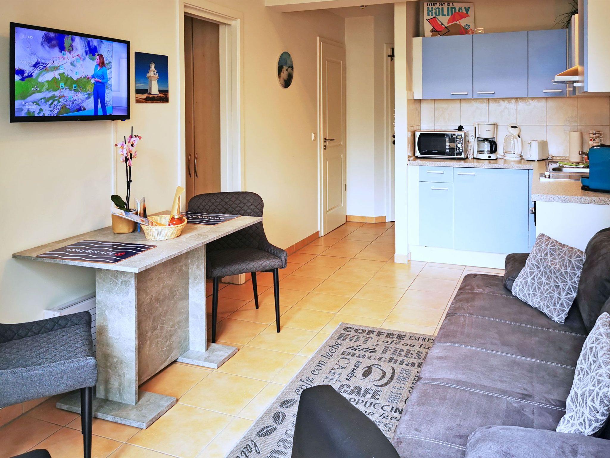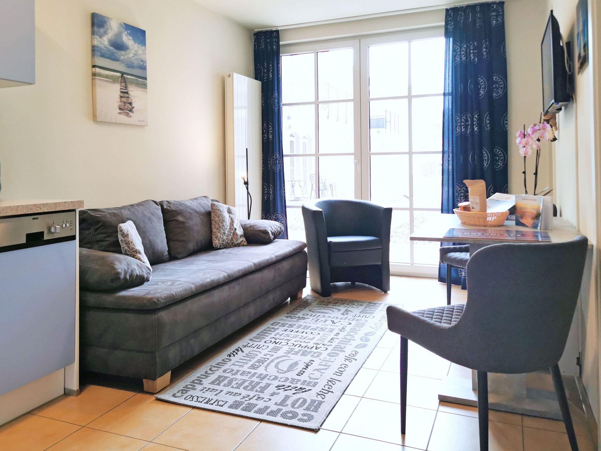 Die Nichtraucher-Ferienwohnung ist für bis zu drei Personen eingerichtet. Sie befindet sich im Erdgeschoss der Residenz. Von der zu einem Innenhof gelegenen Terrasse schauen Sie auf die Grünanlage vor dem Haus. Das Doppelschlafzimmer ist zusätzlich zum Wohnzimmer mit einem zweiten Fernseher ausgestattet. Im Wohnraum, der mit dem Koch- und Essbereich kombiniert ist, befindet sich ein Schlafsofa für die dritte Person.