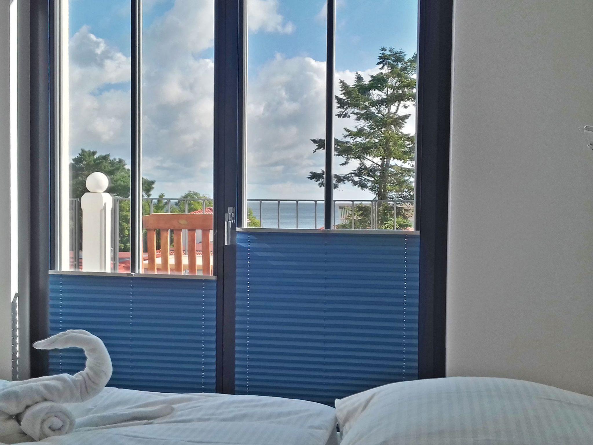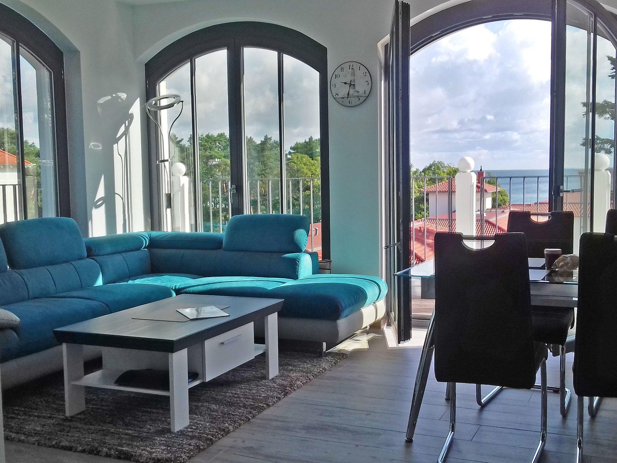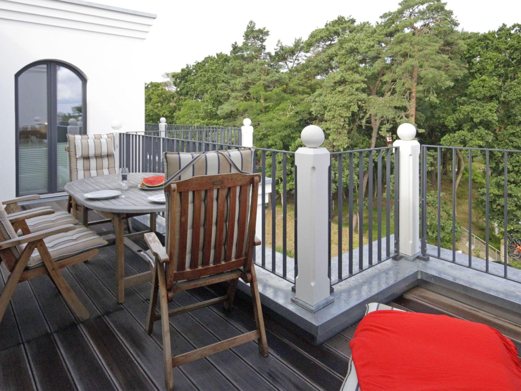 Vis a vis dem Strand, Luxus pur: 98 qm große Penthouse Ferienwohnung mit herrlichen Meerblick an der Promenade von Baabe für 4 Personen mit 2 Schlafzimmern, 2 Bädern und 2 großen Balkonen. Die Villa Andrea liegt in bester Lage zum Strand, verfügt über Lift, WLAN, Tiefgaragenstellplatz und einer Gemeinschaftssauna im Souterrain. Ein schön angelegter Garten umgibt das Haus. Die Wohnung ist ebenfalls gut geeignet für bewegungseingeschränkte Personen, da auch das Duschbad ebenerdig ist.