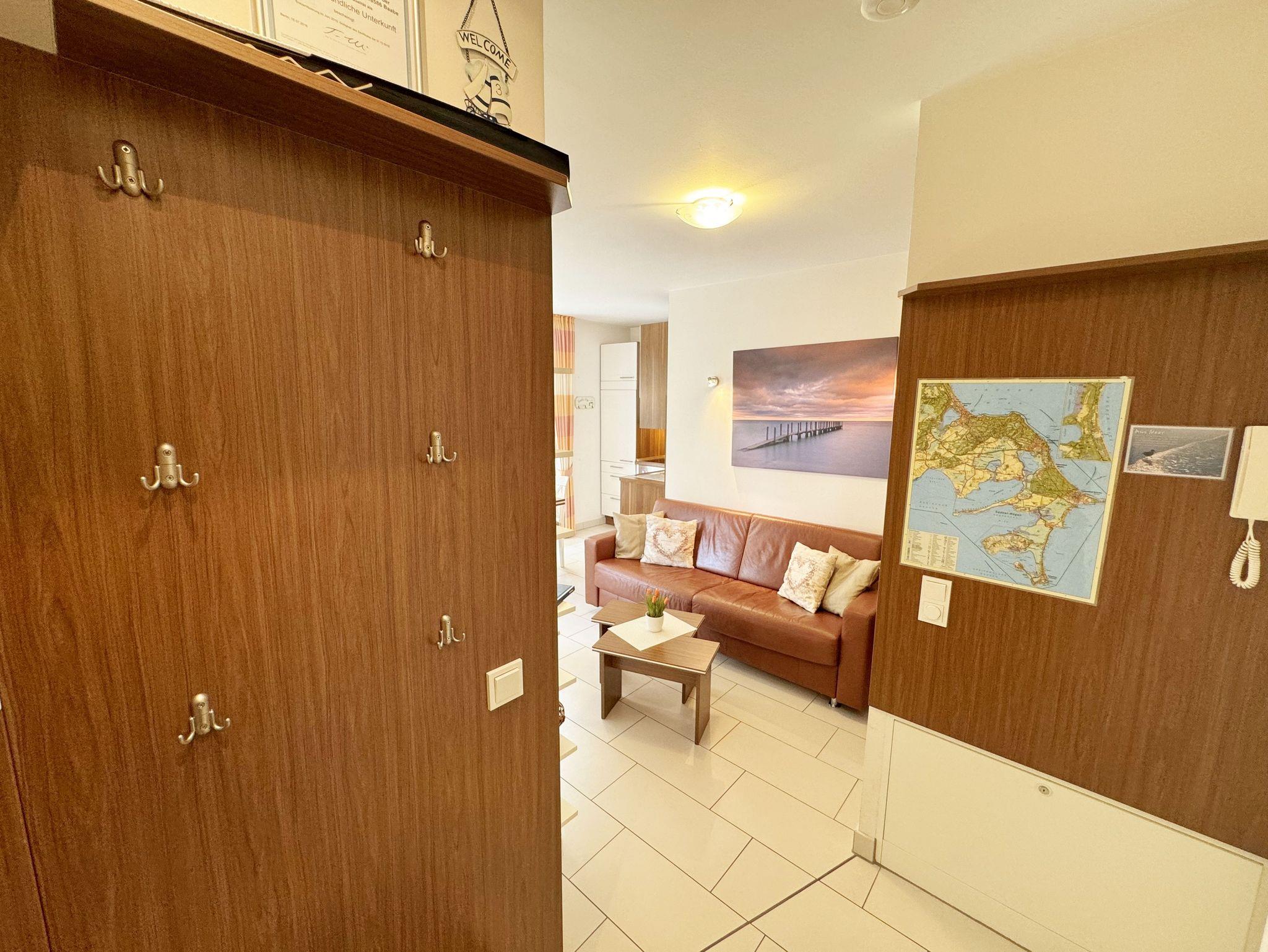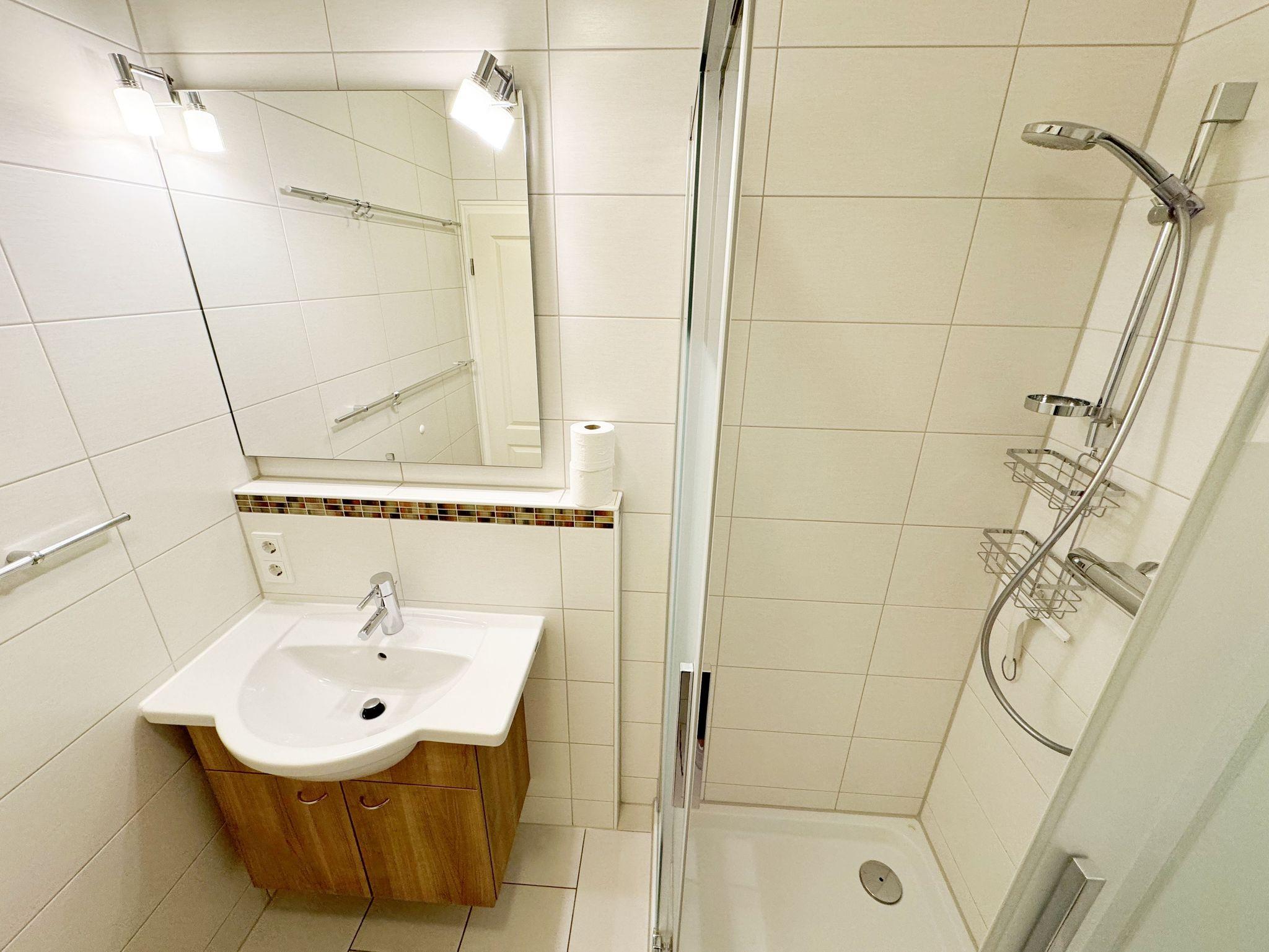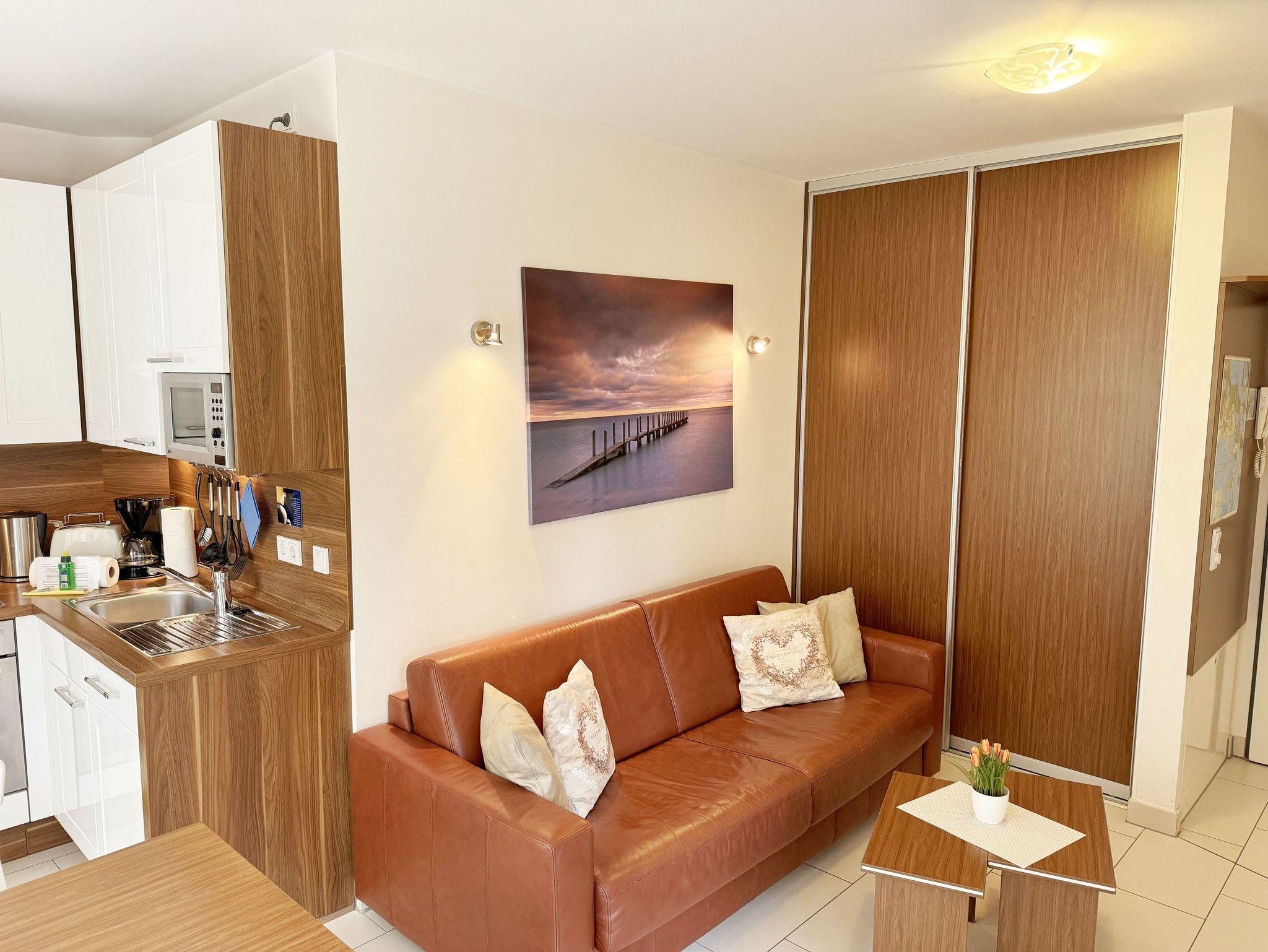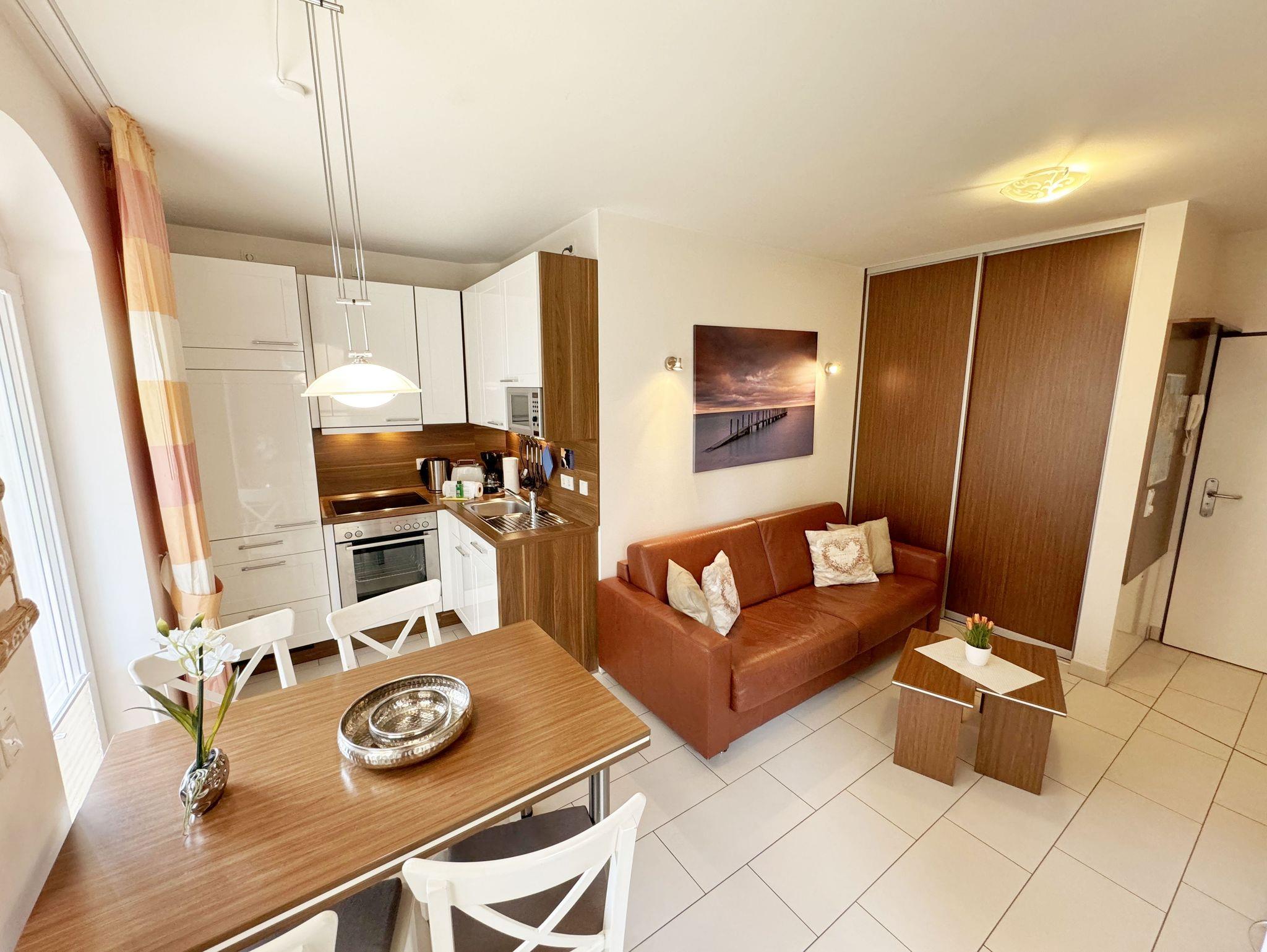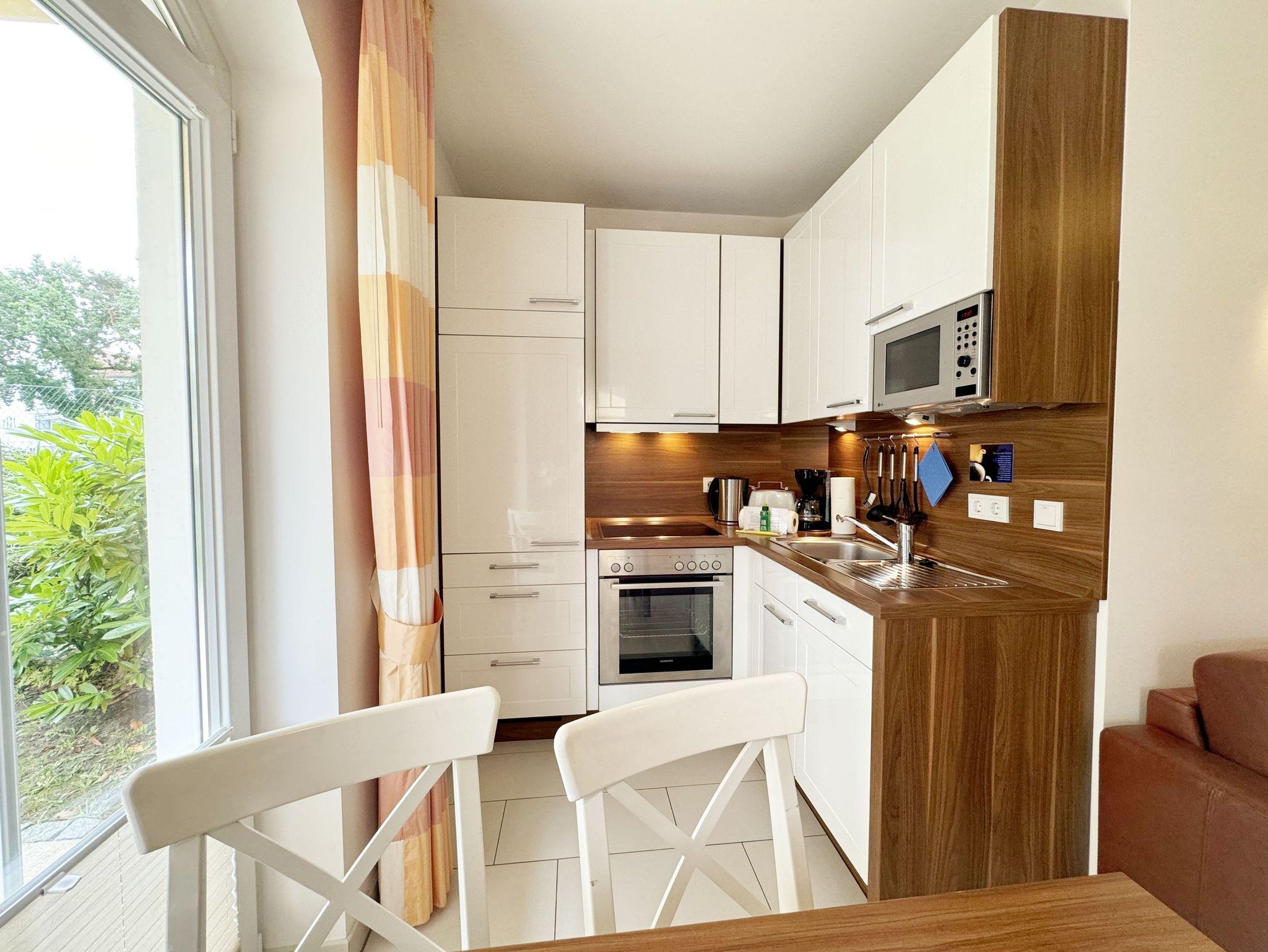 Das Bernsteinchen im Erdgeschoss der Kurparkresidenz Baabe, mit seinen ca. 40 qm, ist geräumiger als man denkt. Die mit viel Liebe zum Detail konzipierte Ferienwohnung ist von hoher Funktionalität und für max. 2 Erwachsene sowie 1 Kleinkind bis 3 Jahre vorgesehen. Nach Strandspaziergängen laden ein großzügiges Ledersofa, 2 kleine Couchtische und eine Anrichte mit einer klangvollen Mini-Stereo-Anlage mit Kassetten-Rekorder und CD-Player zum Relaxen ein. Der inklusive Internetanschluss (WLAN) und der HD-Flachbild-TV runden das Angebot ab. Die angrenzende hochwertige Einbauküche lässt keine Wünsche offen: sie ist ausgestattet mit Spülmaschine, Backofen und 4 Zonen-Ceranfeld, Dunstabzugshaube, Kühlschrank mit Gefrierfach, Mikrowelle, Kaffeemaschine, nickelfreiem Wasserkocher, Toaster, Handmixer inkl. Pürierstab und weiteren Küchenutensilien. Die beiden bestuhlten Terrassen (Ost-/Süd-Seite) sind vom lichtdurchfluteten Essbereich mit Essecke zu erreichen. Hochwertige Bodenfliesen mit Fußbodenheizung sorgen im gesamten Appartement für eine wohlige Raumatmosphäre. Viel Stauraum schaffen im Wohnbereich der maßangefertigte Einbauschrank mit deckenhohen Schiebetüren sowie der begehbare, großzügige Kleiderschrank mit großem Spiegelelement im Schlafzimmer. Hier bieten Ihnen sowohl das Doppelbett (1,60 m x 2,00 m) mit Qualitäts-Latexmatratzen und verstellbaren Lattenrosten, Nachttischablagen, dimmbares Licht, Lesebeleuchtungen sowie auch die Verdunklungsplissees und das Insektenschutzgitter alle Voraussetzungen für einen ruhigen Schlaf. Das Badezimmer verfügt über eine geräumige Dusche mit Eckeinstieg, WC, Fön, Waschtisch und eine Handtuchheizung. Plissee´s und Insektenschutzgitter finden sie auch im Wohnbereich. Für unsere kleinen Gäste stehen 1x Hochstuhl und 1x Kinderreisebett (ohne Zusatzmatratze und ohne Bett-Inlett) inklusive zur Verfügung. Ein eigener PKW-Stellplatz (Nr. 03) in der Tiefgarage, mit einer Einfahrtshöhe von 1,95 m, ist für Sie inklusive. Eine Waschmaschine und einen Trockner können Sie gegen eine Extragebühr im Keller nutzen. Von hier haben Sie die direkte Möglichkeit den Fahrstuhl bis zur Wohnung zu nutzen. Aufgrund der Allergikerfreundlichkeit versteht es sich von selbst, dass weder das Mitbringen von Haustieren noch das Rauchen in der Wohnung erlaubt sind. Die Erstausstattung eines Wäschepaketes (komplette Bettwäsche, 1 Duschhandtuch, 1 kleines Handtuch) können Sie bis 14 Tage vor Anreise gegen einen Aufpreis dazu buchen oder durch eigene ergänzen. Ab 2 gebuchten Paketen erhalten Sie einmalig 1 Geschirrhandtuch und 1 Duschvorleger hinzu.