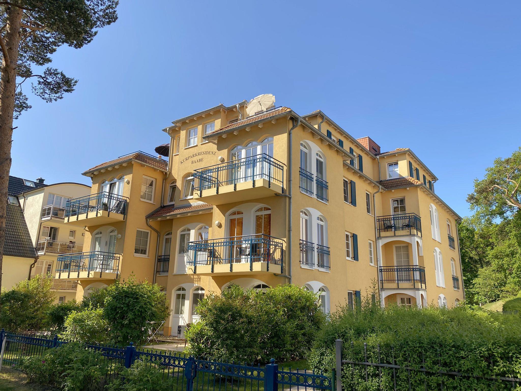 Die gepflegte, kleine Appartementanlage Kurparkresidenz Baabe mit ihren 17 Ferienwohnungen befindet sich in erstklassiger Lage im Südosten Rügens. Ein Fußweg durch den Kurpark führt Sie nach 70 Metern direkt zum ebenerdigen, feinsandigen Ostseestrand, der sich kilometerweit in Nord- (Sellin) und Südrichtung (Göhren) erstreckt. Die im Winter beheizbare PKW-Zufahrt zu Ihrem kostenlosen Tiefgarageneckstellplatz (Nr. 3 / Höhe: 1,95 m) liegt auf der Westseite der Kurparkresidenz. Ihre autolärmfreie Wohnung 3 im Erdgeschoss erreichen Sie bequem und wetterunabhängig mit dem Fahrstuhl. Fußläufig erreichen Sie in 2 Minuten die zentrale Strandstraße mit Restaurants, Cafés und Geschäften sowie das Haus des Gastes. In unmittelbarer Nachbarschaft können Sie frische Backwaren, Eis, Literatur und Ähnliches erwerben. Dem lichtdurchfluteten Bernsteinchen schließen sich zwei eigene, überdachte Terrassen (Meerseite) mit Blick zum Kurpark in Richtung Ostsee an, Meeresrauschen inbegriffen.