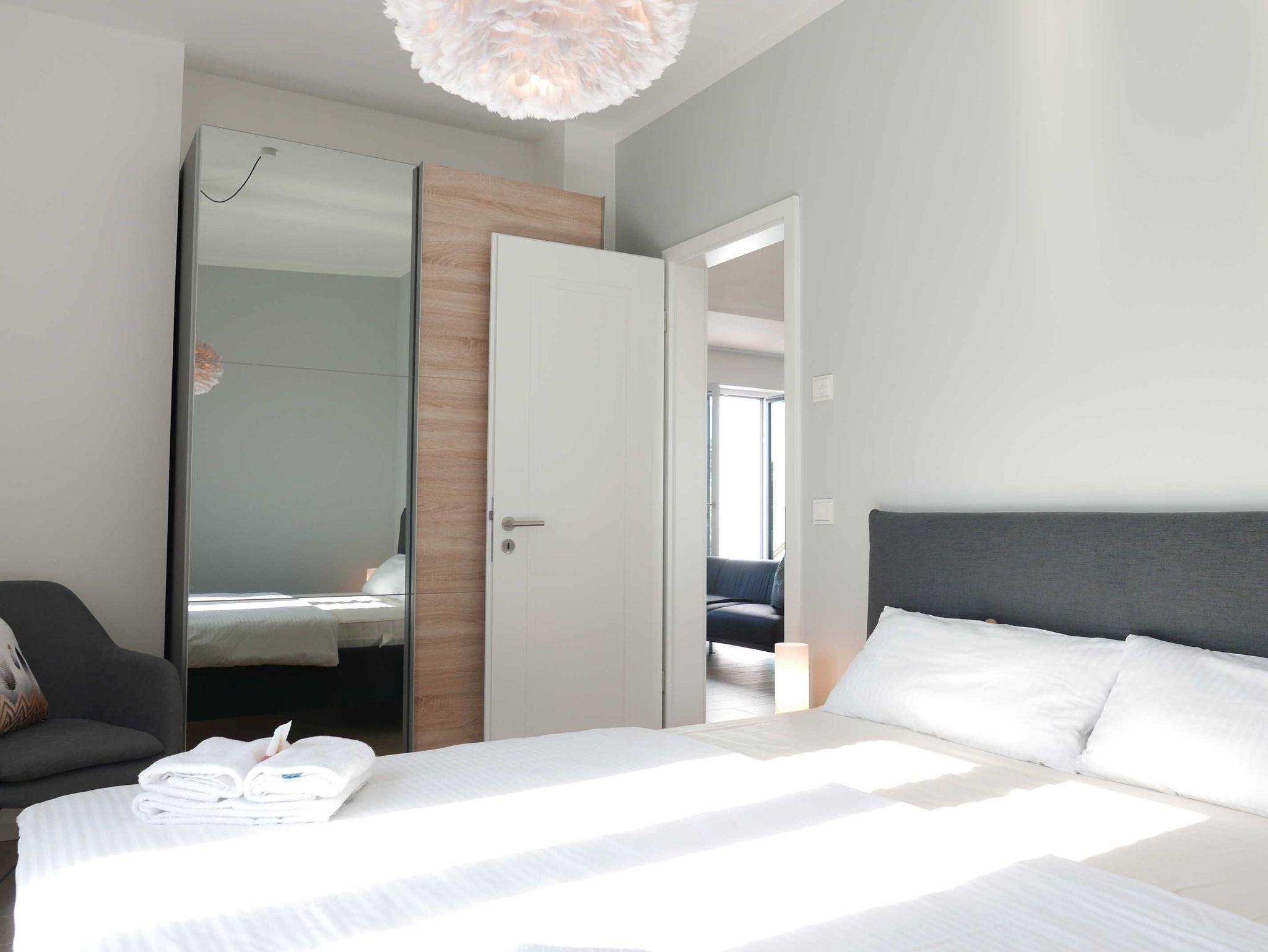 Beide Schlafzimmer sind mit einem Doppelbett ausgestattet; eines mit den Maßen 180 x 200 cm, das andere mit den Maßen 160 x 200 cm. Auch können Gäste sich über Kleiderschränke mit bodentiefen Spiegelfronten freuen. In einem der Schlafzimmer befindet sich zudem ein Schaukelstuhl sowie ein weiterer Fernseher.