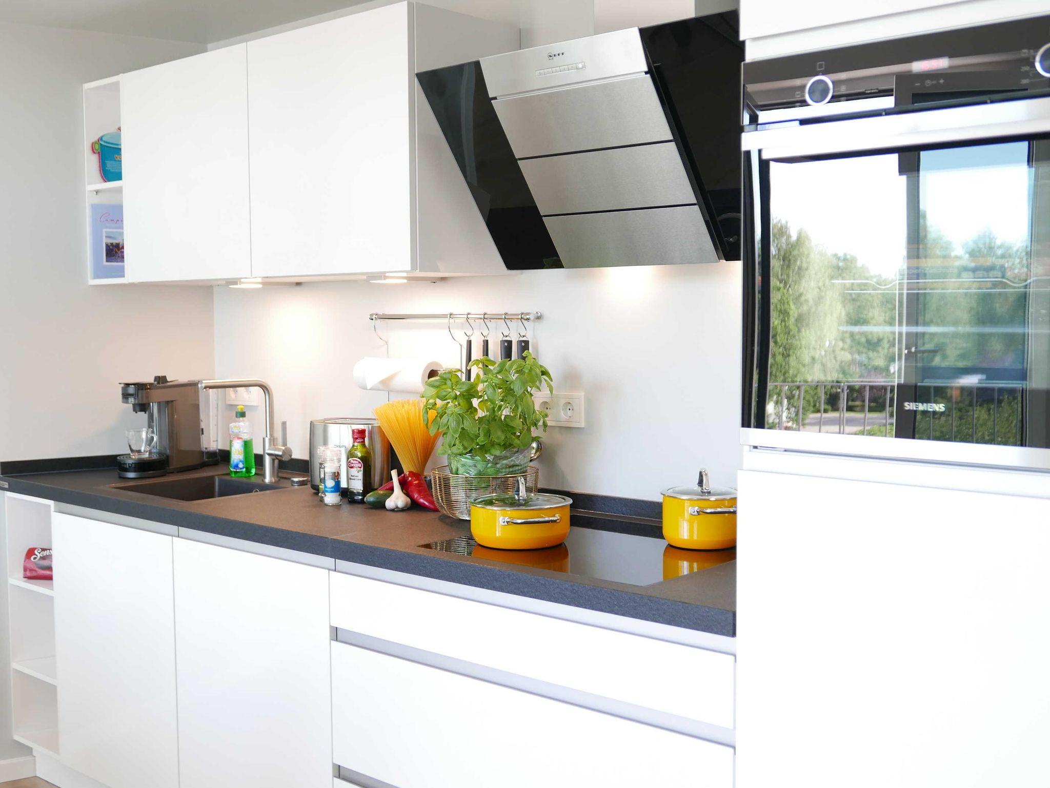 Die integrierte Küchenzeile ist gut ausgestattet mit 4-Platten-Induktionsherd, Kühlschrank (inkl. Gefrierfach), Backofen, Geschirrspülmaschine, kombinierte Pad-/Filterkaffeemaschine, und Toaster.