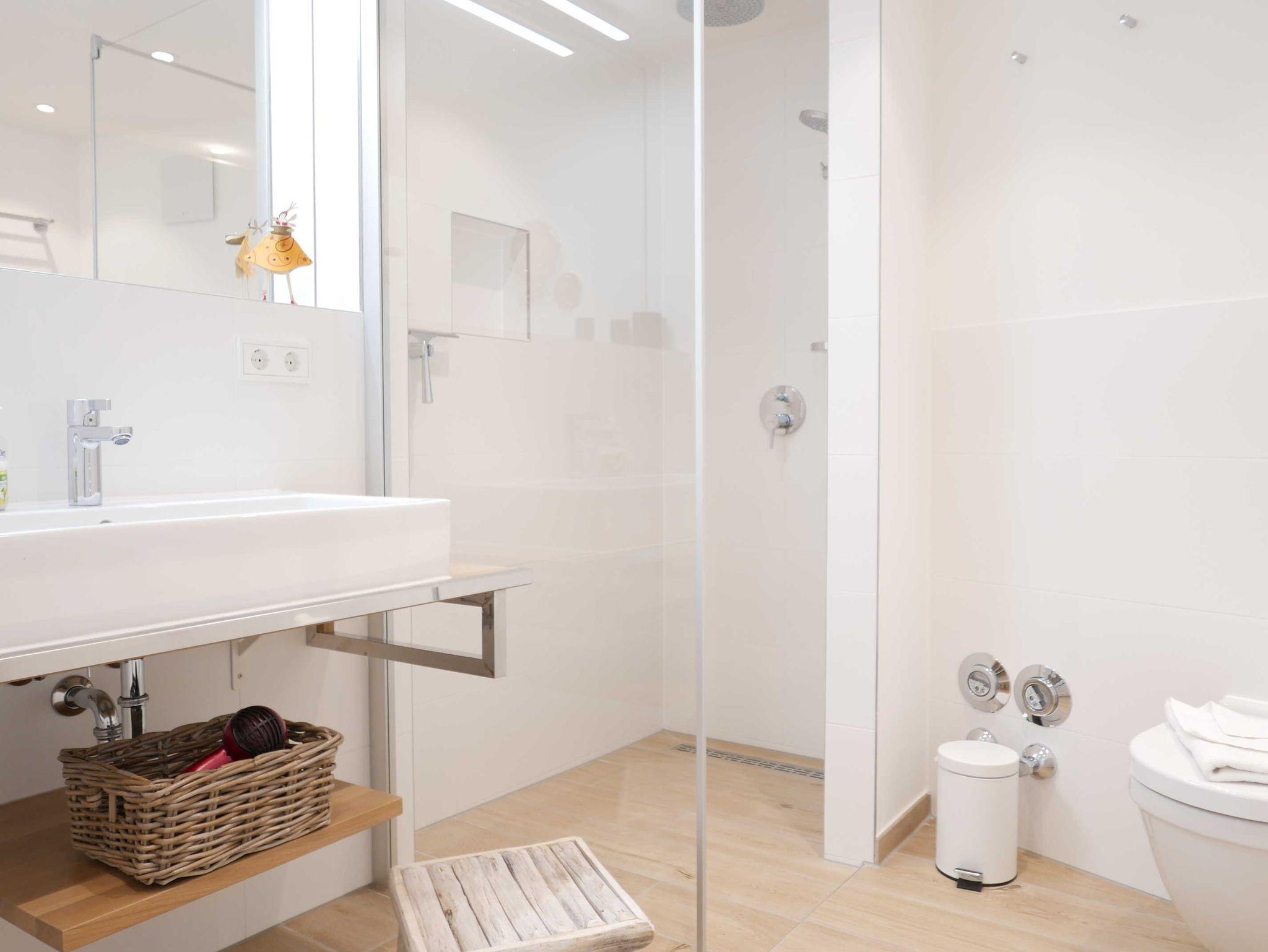 Ein Badezimmer mit ebenerdiger Dusche, Kosmetikspiegel, und Fön, sowie ein weiteres Gäste-WC, sind ebenfalls vorhanden.
