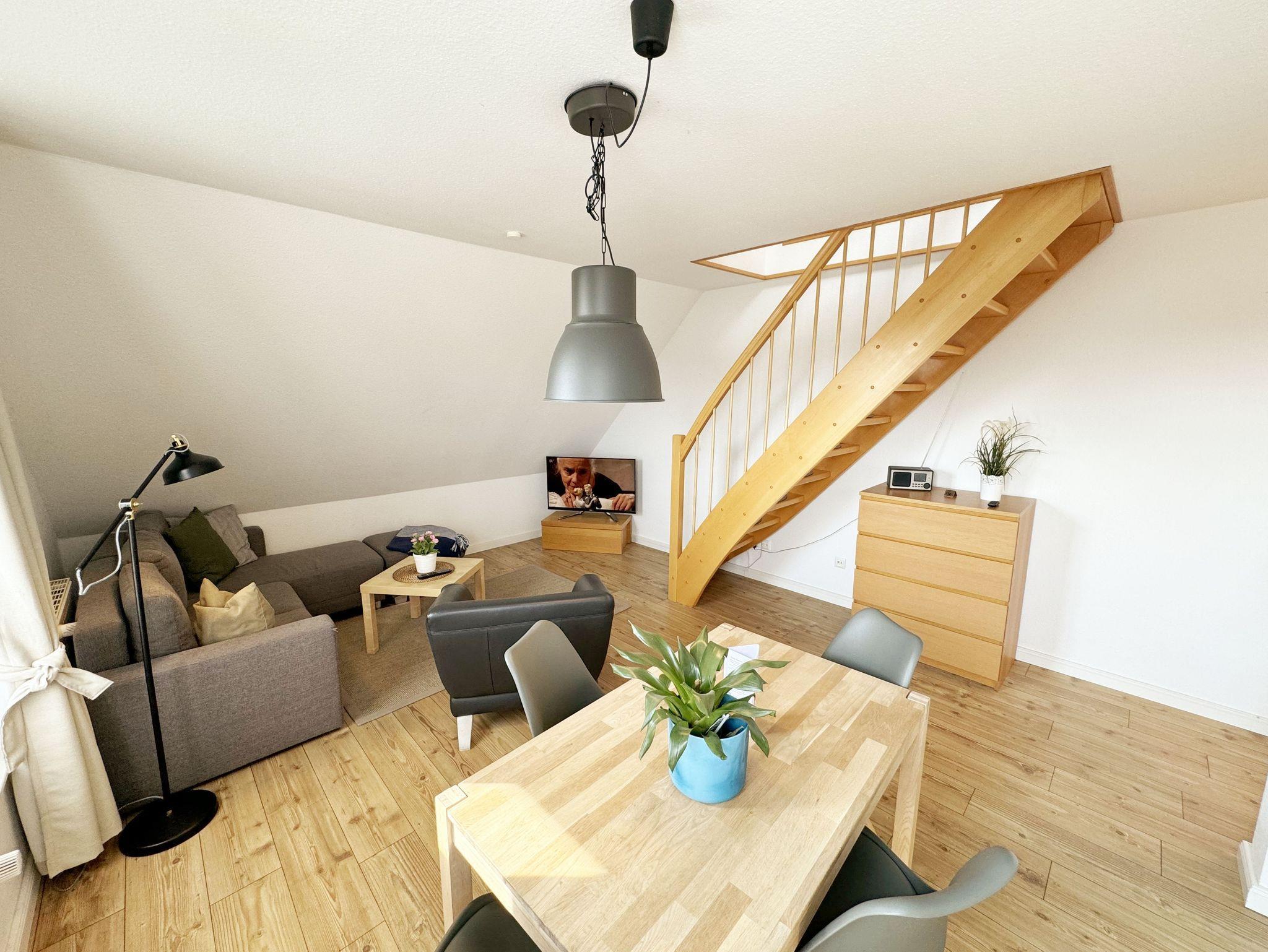 Die 70 qm Nichtraucher-Maisonette-Wohnung ist modern und hell im skandinavischen Stil eingerichtet und bietet Platz für max. 4 Erwachsene + 1 Kleinkind bis 3 Jahre im Kinderreisebett. Fotografien der Insel lassen Sie beim Eintreten auf der Insel ankommen. Über einen kleinen Flur mit Garderobe gelangen Sie direkt in den großen Wohn- und Essbereich mit Einbauküche. Die bodentiefen Fenster mit Absturzsicherung und Insektenschutzgittern sorgen für viel Tageslicht. Der Wohnbereich ist gemütlich gestaltet und lädt zum Entspannen ein. Er verfügt über eine bequeme Eckcouch mit variablem Fußteil, ein Couchtisch, einen Sessel und eine Stehlampe. Hier können Sie es sich gemütlich machen, einen Film auf dem 32-Zoll-Smart-TV genießen oder der Musik aus dem Bluetooth-Radio lauschen. Ein WLAN-Anschluss rundet den technischen Bereich ab. In dem Sideboard finden Sie ausreichend Stauraum für Ihre persönlichen Gegenstände. Zusätzlich befindet sich dort eine Spielesammlung für die ganze Familie sowie eine kleine Auswahl an Büchern. Die Einbauküche beinhaltet alles, was Sie zur Zubereitung Ihrer Mahlzeiten benötigen. Wie ein Induktionsherd, ein Kühlschrank mit Gefrierfach, eine Mikrowelle und ein Geschirrspüler. Darüber hinaus steht Ihnen sowohl eine Filter-Kaffeemaschine als auch eine Nespresso-Kapselmaschine, ein Wasserkocher, ein Toaster, ein Messerblock sowie viele Kochutensilien zur Verfügung. Ein Esstisch rundet den Küchenbereich ab. Von hier aus gelangen Sie über eine Treppe in den oberen Schlafbereich. Hier befinden sich zwei Einzelbetten (je 0,90m x 2,00m), die auch zu einem Doppelbett verschoben werden können, verstellbare Lattenroste, zwei Nachttischablagen mit Leseleuchten, ein Kleiderschrank sowie ein Verdunklungsrollo. Der Raum bietet dazu Platz, um ein Kinderreisebett aufzustellen. Die Treppe ist dazu durch ein Treppenschutzgitter gesichert. Das unter Schlafzimmer verfügt über ein komfortables Doppelbett (1,60m x 2,00m) mit Wand-Nachttischlampe, verstellbare Lattenroste sowie ein geräumiger Kleiderschrank. Die bodentiefen Fenster sind mit Verdunklungsvorhängen und Insektenschutzgitter ausgestattet, um Ihnen einen erholsamen Schlaf zu ermöglichen. Das kompakte Tageslicht-Bad ist funktional gestaltet und verfügt über eine Eck-Dusche, ein Fön, ein WC, ein Waschplatz und ein Insektenschutzgitter. Eine Ablage bietet Platz für Kosmetikutensilien und ein beleuchteter Spiegel sorgt für die richtige Ausleuchtung. Ebenso finden Sie in Ihrer Wohnung einen Wäscheständer, Reinigungsutensilien und einen Standventilator vor. Wenn es Sie nach draußen zieht, so steht Ihnen ein 2500 qm großer Gemeinschaftsgarten zur Verfügung, der zum Verweilen einlädt. Dort finden Sie Strandkörbe Sitzgelegenheiten sowie einen Grillplatz, den Sie gemeinsam mit anderen Gästen nutzen können. Ein Haustier ist gegen eine Gebühr ein gern gesehener Gast. Ihre mitgebrachten oder geliehenen Fahrräder können Sie auf dem Grundstück abstellen. Ein PKW-Stellplatz befindet sich direkt am Haus. Die Erstausstattung eines Wäschepaketes (komplette Bettwäsche, 1 Duschhandtuch, 2 kleine Handtücher) können Sie bis 14 Tage vor Anreise gegen einen Aufpreis dazu buchen oder durch eigene ergänzen. Ab 2 gebuchten Paketen erhalten Sie einmalig 1 Geschirrhandtuch und 1 Duschvorleger hinzu.