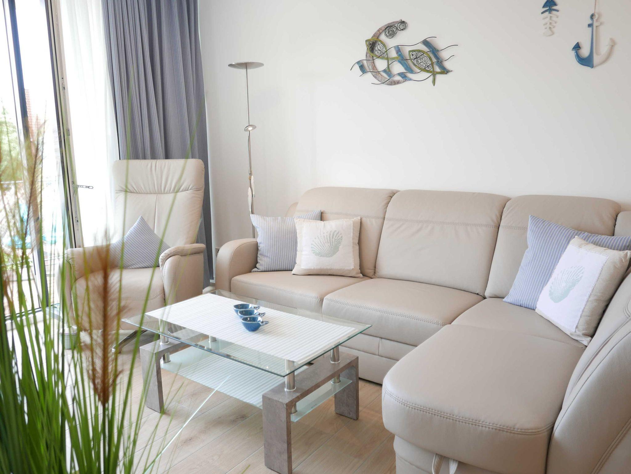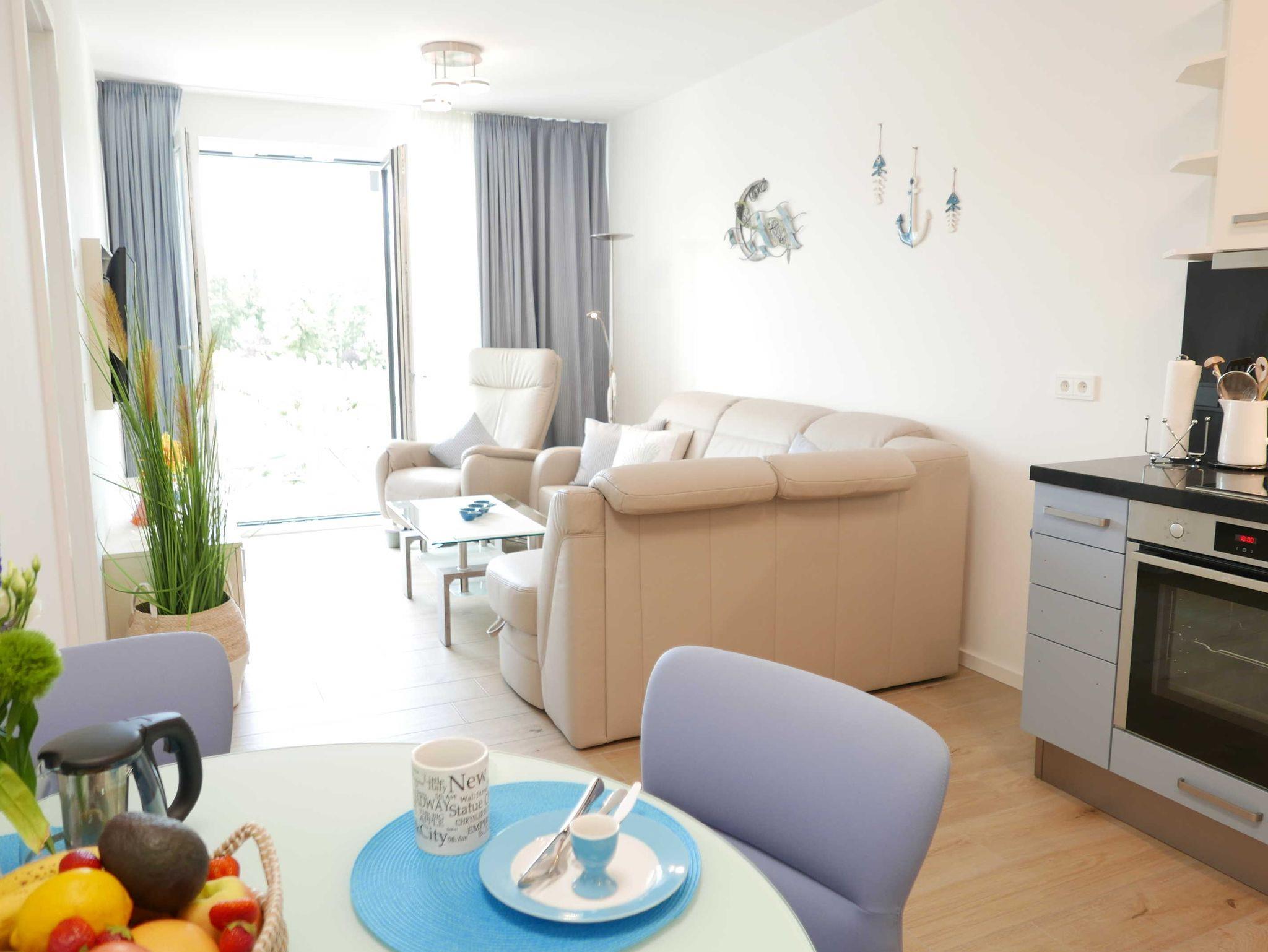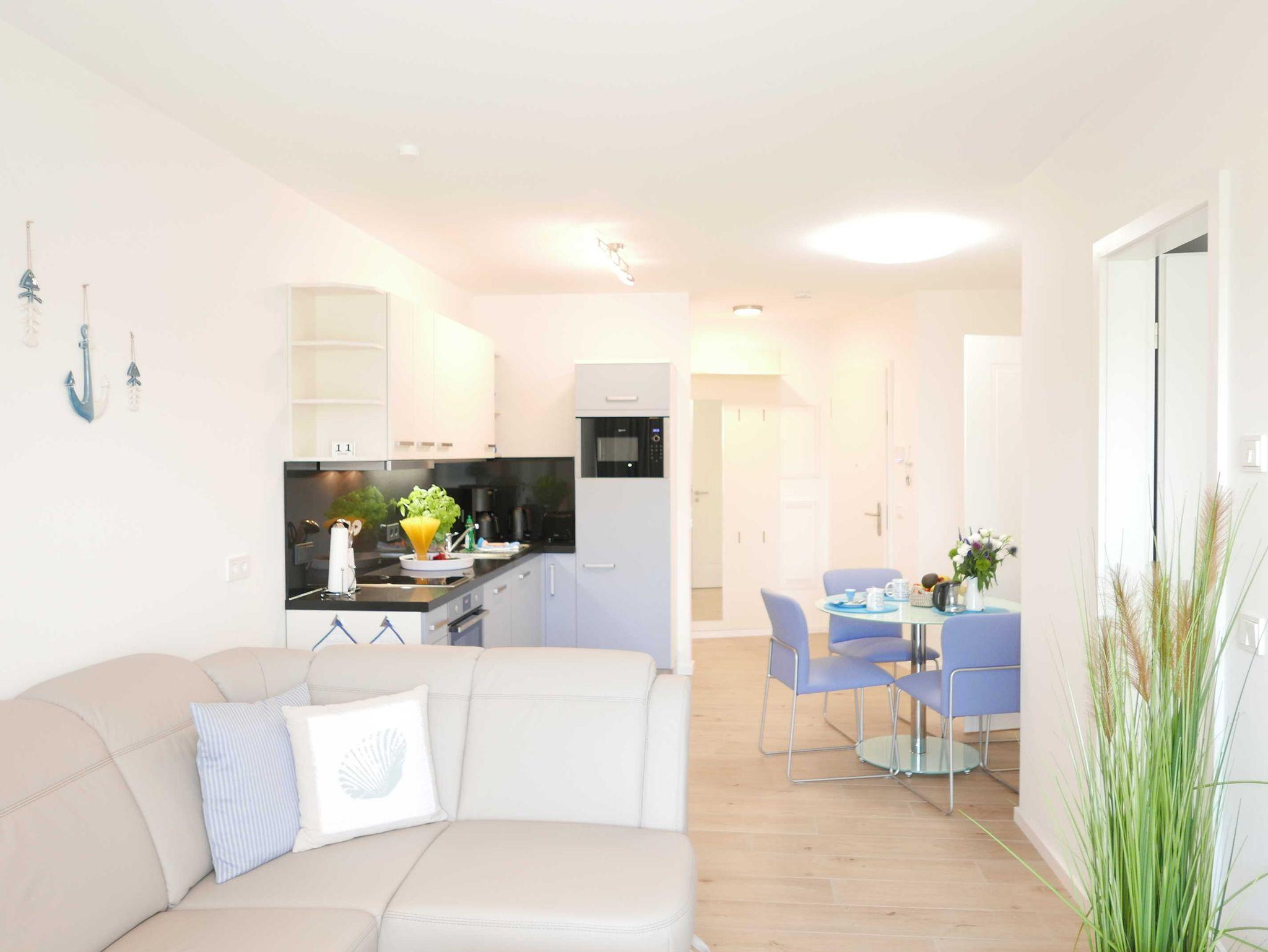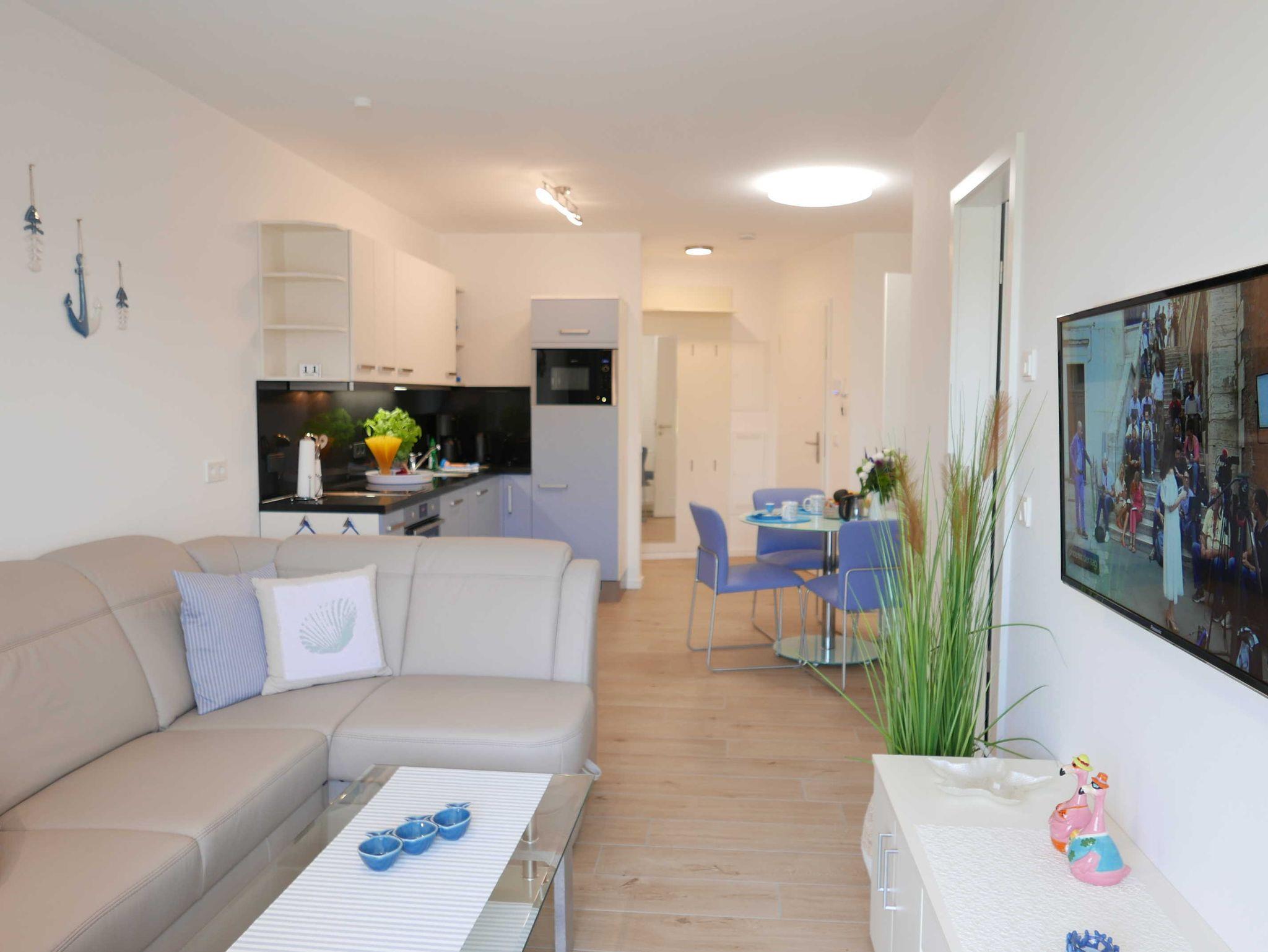 Moderne 2 Zimmer Ferienwohnung mit seitlichen Meerblick vom Balkon für bis zu 3 Personen. WLAN vorhanden. Die Blaue Lagune ist exklusiv eingerichtet. Im Wohnbereich befindet sich die integrierte Küchenzeile. Diese bietet allen Komfort mit Geschirrspülmaschine, Backofen, Induktionsherd sowie viele weitere Details. Bodentiefe Fenster geben ein schönes Ambiente und die Fußbodenheizung hält eine gemütliche Wärme vor.