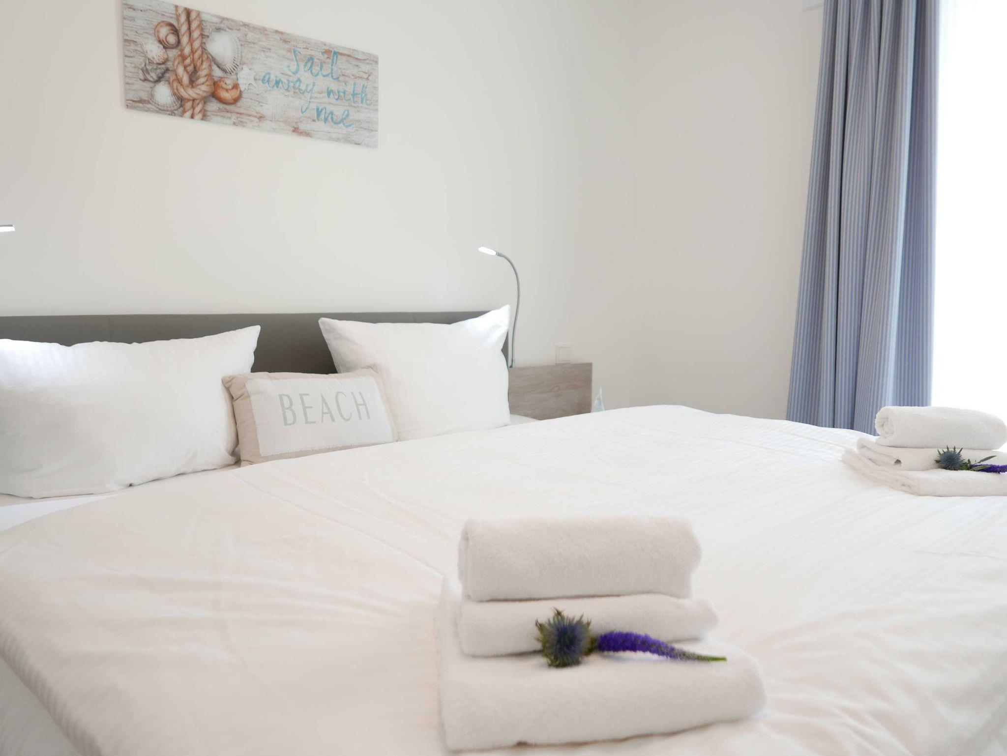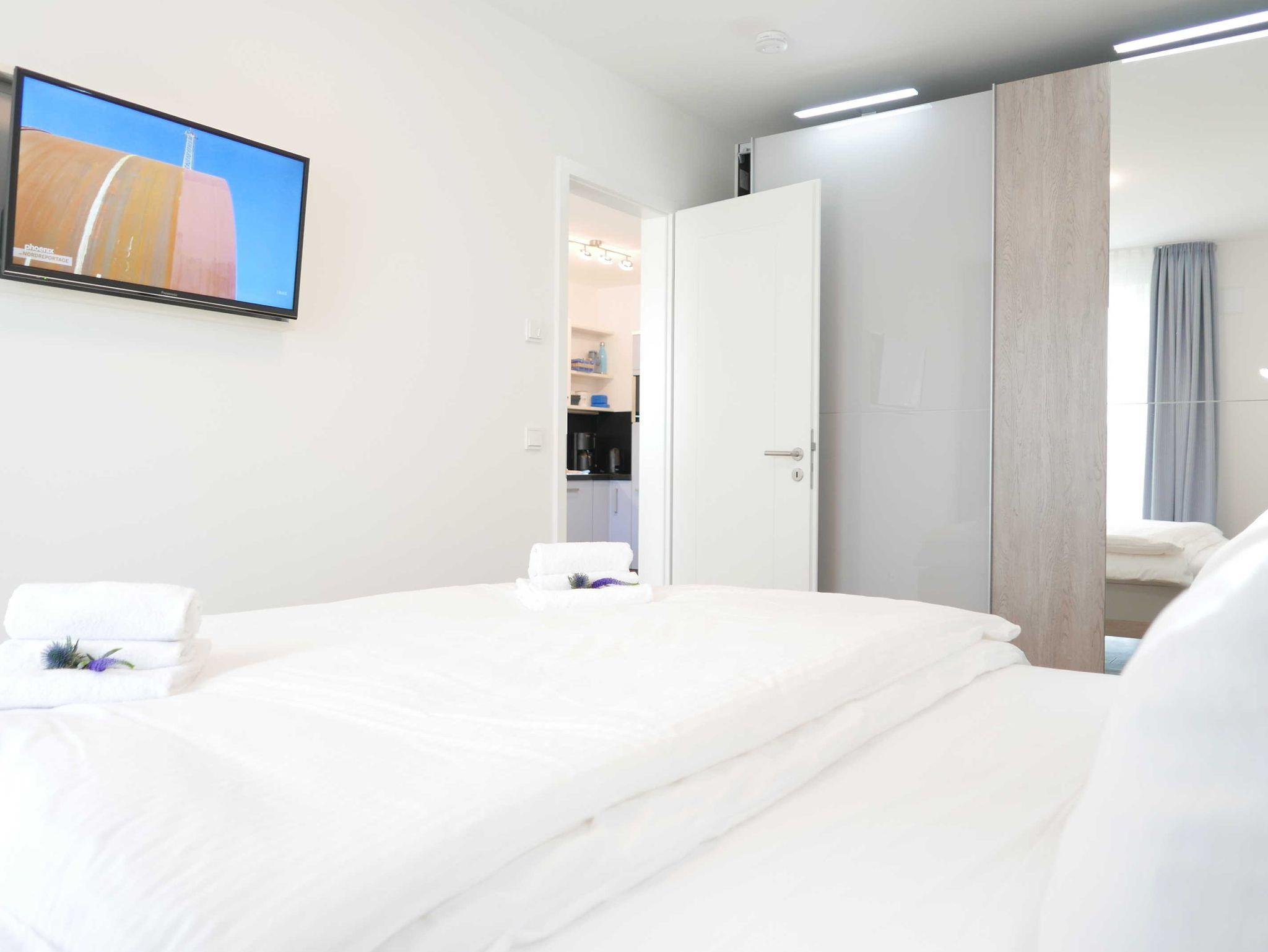 Das moderne Schlafzimmer hat ein Doppelbett von 180x200 cm sowie einen LED-Fernseher. Genügend Ablagefläche ist vorhanden. Die Wohnung ist barrierefreundlich und hat eine bodengleiche Dusche.