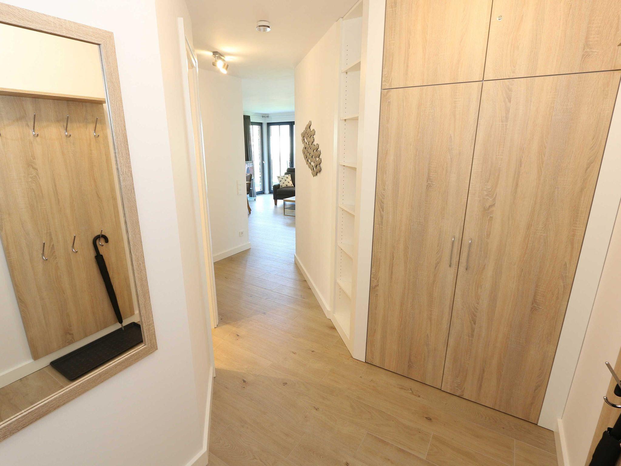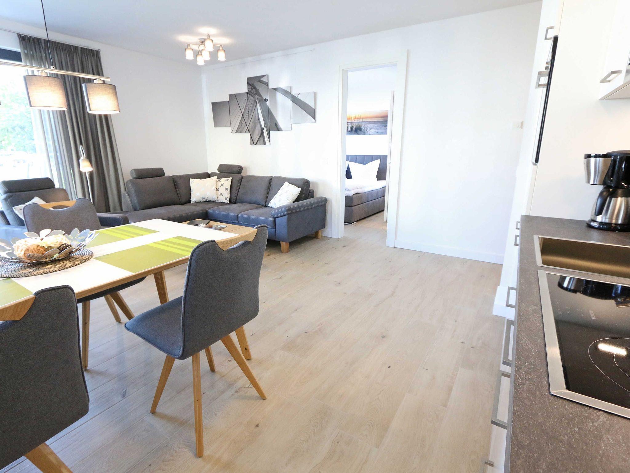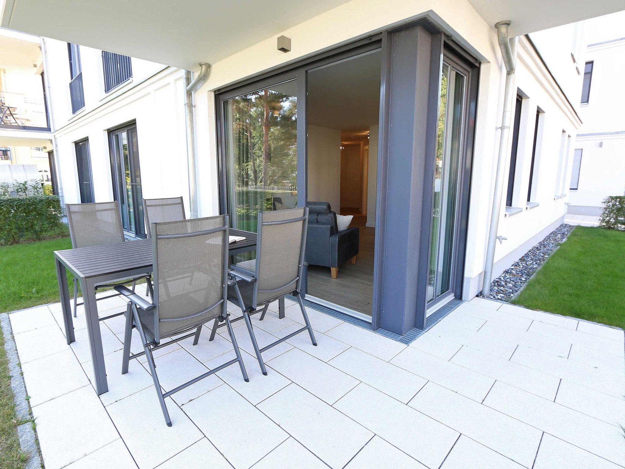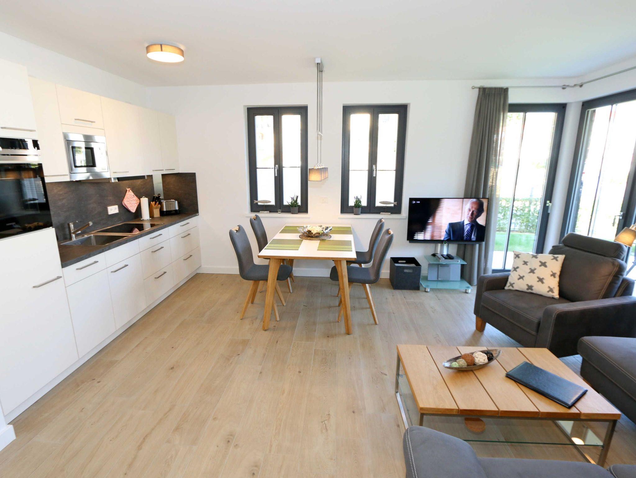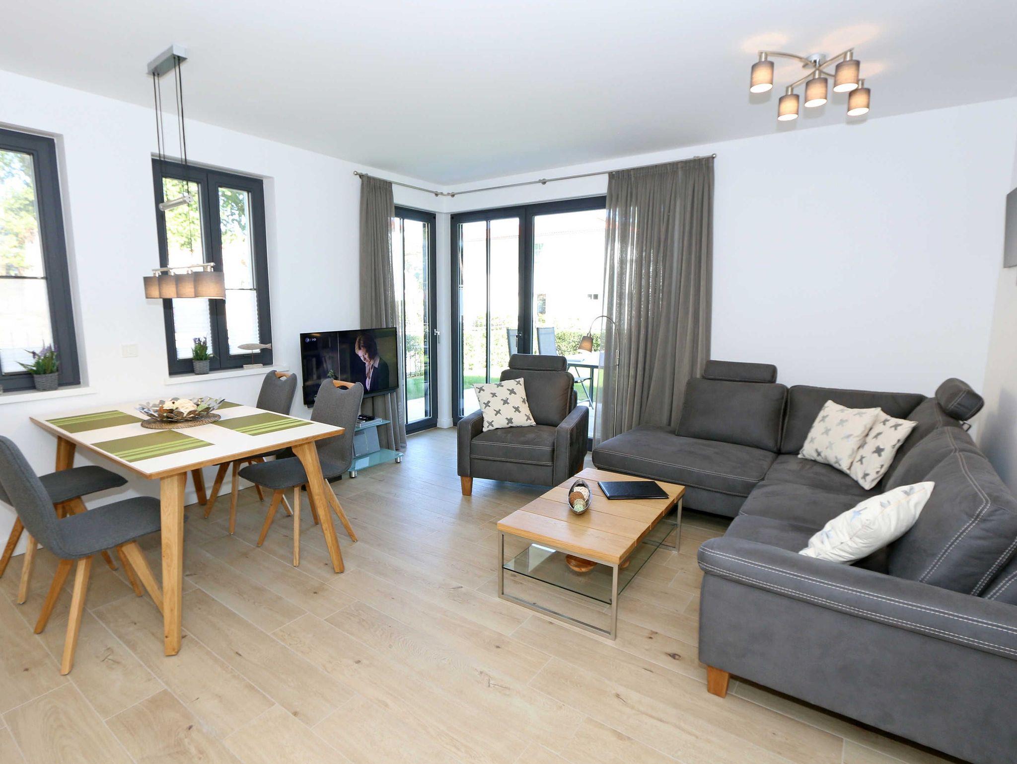 Die 68 m² große Nichtraucherwohnung ?Küstensegler? befindet sich im Erdgeschoss und wurde liebevoll für Sie ausgestattet. Sie bietet eine sehr schöne Raumaufteilung und hochwertige Ausstattung für einen erholsamen Urlaub für max. 2 bis 4 Erwachsenen. In der kalten Jahreszeit verteilt sich über die Fußbodenheizung eine wohlige Wärme in der Wohnung. Im freundlichen Wohn-/Esszimmer können Sie es sich auf der Couch mit Couchtisch, Leselampe und Sessel bequem machen. Ein 43 Zoll-Ultra HD Smart-TV, Blu-Ray Player und ein DAB-Radio mit CD-Player, Bluetooth und USB-Anschluss sorgen für Ihre Unterhaltung. Ein WLAN-Zugang steht selbstverständlich zur kostenfreien Nutzung für Sie bereit. Aber auch eine kleine Auswahl an Gesellschaftsspielen und Bücher steht Ihnen zur Verfügung. Der Esstisch für 4 Personen befindet sich neben der komfortabel gestalteten und umfangreich ausgestatteten Küchenzeile und lädt zum Verweilen ein. Ein Geschirrspüler, ein 4 Zonen-Ceranfeld, ein Backofen, ein Kühlschrank mit Gefrierfach, eine Mikrowelle, eine Kaffeemaschine mit Thermoskanne, eine Tassimo-Kapselmaschine, ein Toaster, ein Wasserkocher sowie ein Eierkocher komplettieren diese. Natürlich sind auch viele große und kleine Küchenutensilien vorhanden. Vom Wohnbereich gelangen Sie auf die überdachte und bestuhlte Terrasse (Osten) der Ihnen einen Blick auf den kleinen Kurpark von Baabe ermöglicht. Genießen Sie Ihr Frühstück in der Morgensonne oder ein gemütliches Glas Wein beim letzten Sonnenstrahl des Tages. Zudem kann ein eigener kleiner Gartenanteil (mit Abgrenzung durch Hecke/Zaun) von Ihnen genutzt werden. Beide Schlafzimmer sind mit bequemen Boxspringbetten (je 1,80m x 2,00m, mit durchgehende Topper, ein Schlafzimmer Härtegrad H2, das zweite Schlafzimmer Härtegrad H3), einem Nachttisch und Kleiderschrank für Ihre Urlaubsgarderobe ausgestattet. In beiden Schlafzimmern stehen Ihnen Full HD Smart-TV zur Verfügung. Das Aufstellen eines Reisebettes ist in den Schlafzimmern nicht möglich. Eines der beiden Schlafzimmer verfügt über ein eigenes Duschbad mit ebenerdiger Regendusche, Waschtisch, Ablage, WC, elektrischen Handtuchtrockner und einen Fön. Ein weiteres Duschbad mit ebenerdiger Regendusche, Waschbecken, Ablage, WC, elektrischem Handtuchtrockner, Kosmetikspiegel und Fön ist vom Flur erreichbar. Für einen erholsamen Schlaf sorgen die Außenjalousien, die in der ganzen Wohnung durchgängig vorhanden sind. In beiden Schlafräumen sowie im Essbereich befinden sich Insektenschutzgitter in einigen Fenstern. Ein Wäscheständer, ein Bügelbrett, ein Bügeleisen sowie ein Staubsauger stehen bei Bedarf zur Nutzung bereit. Über eine beheizbare Rampe erreichen Sie mit Ihrem PKW die Tiefgarage. Von Ihrem Tiefgaragenstellplatz (Nr.01, Einfahrtshöhe 2,00m) gelangen Sie bequem mit dem Aufzug zu Ihrer Ferienwohnung. Im Haus können Sie eine Waschmaschine und einen Trockner mit Münzautomaten nutzen. Eine münzbetriebene Sauna mit Duschbereich sowie kleinem Ruheraum befinden sich ebenfalls im Haus und laden zur Entspannung ein. Ihre mitgebrachten oder im Ort geliehenen Fahrräder können Sie im schön angelegten und eingezäunten Außenbereich im dafür vorgesehen Fahrradhaus (mit Steckdosen für E-Bikes) abstellen. Haustiere sind nicht erlaubt. Die Erstausstattung eines Wäschepaketes (komplette Bettwäsche, 1 Duschhandtuch, 2 kleine Handtücher) können Sie bis 14 Tage vor Anreise gegen einen Aufpreis dazu buchen oder durch eigene ergänzen. Ab 2 gebuchten Paketen erhalten Sie einmalig 1 Geschirrhandtuch und 1 Duschvorleger hinzu.