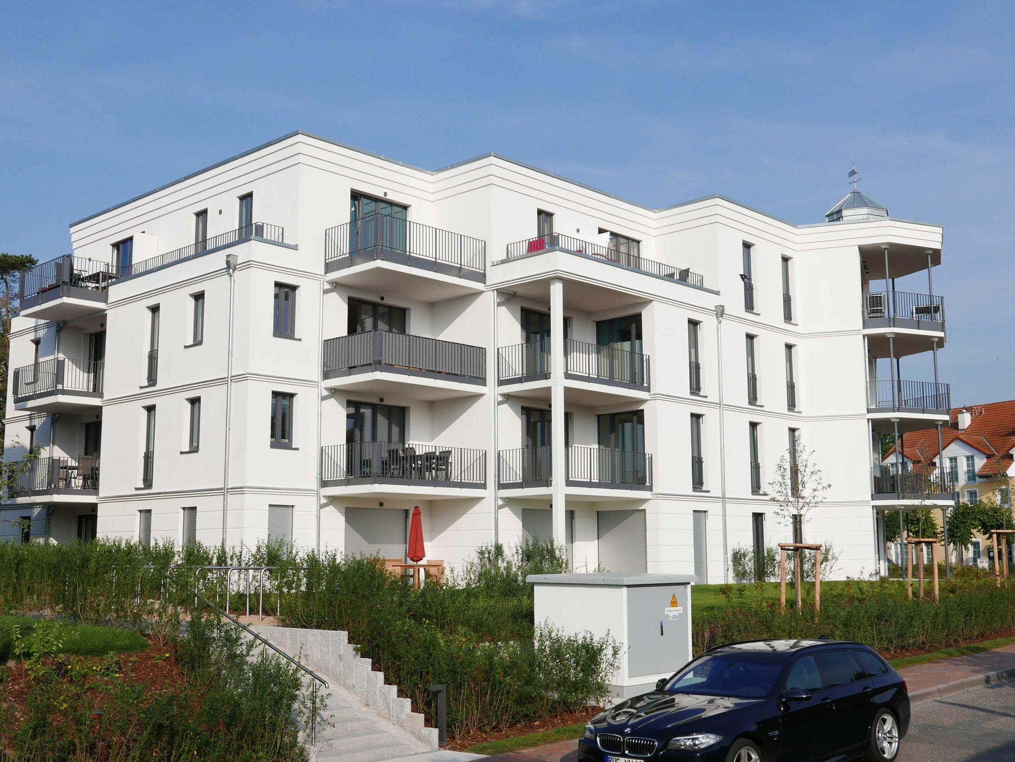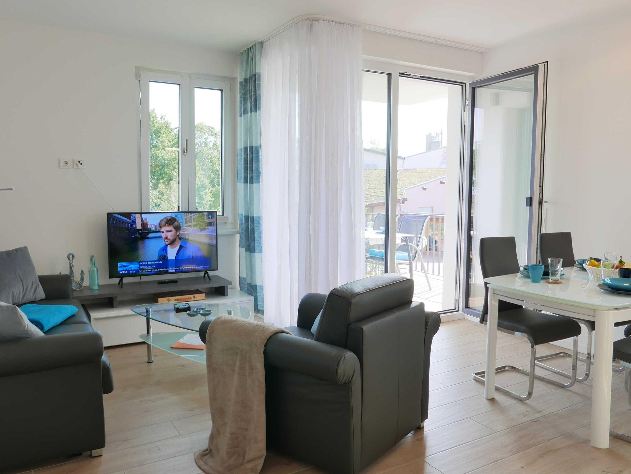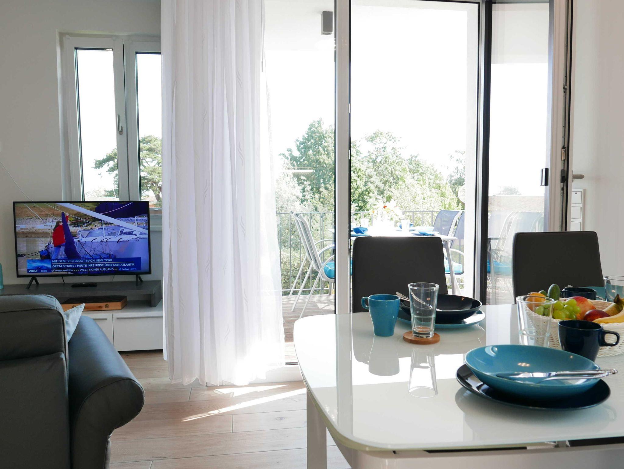 Helle moderne Ferienwohnung mit Meerblick vom Balkon für 4 Personen vis a vis dem Meer und Strand. Sie ist gelegen im ersten Obergeschoss der Villa Strandläufer vom Villen-Ensemble Baabe.