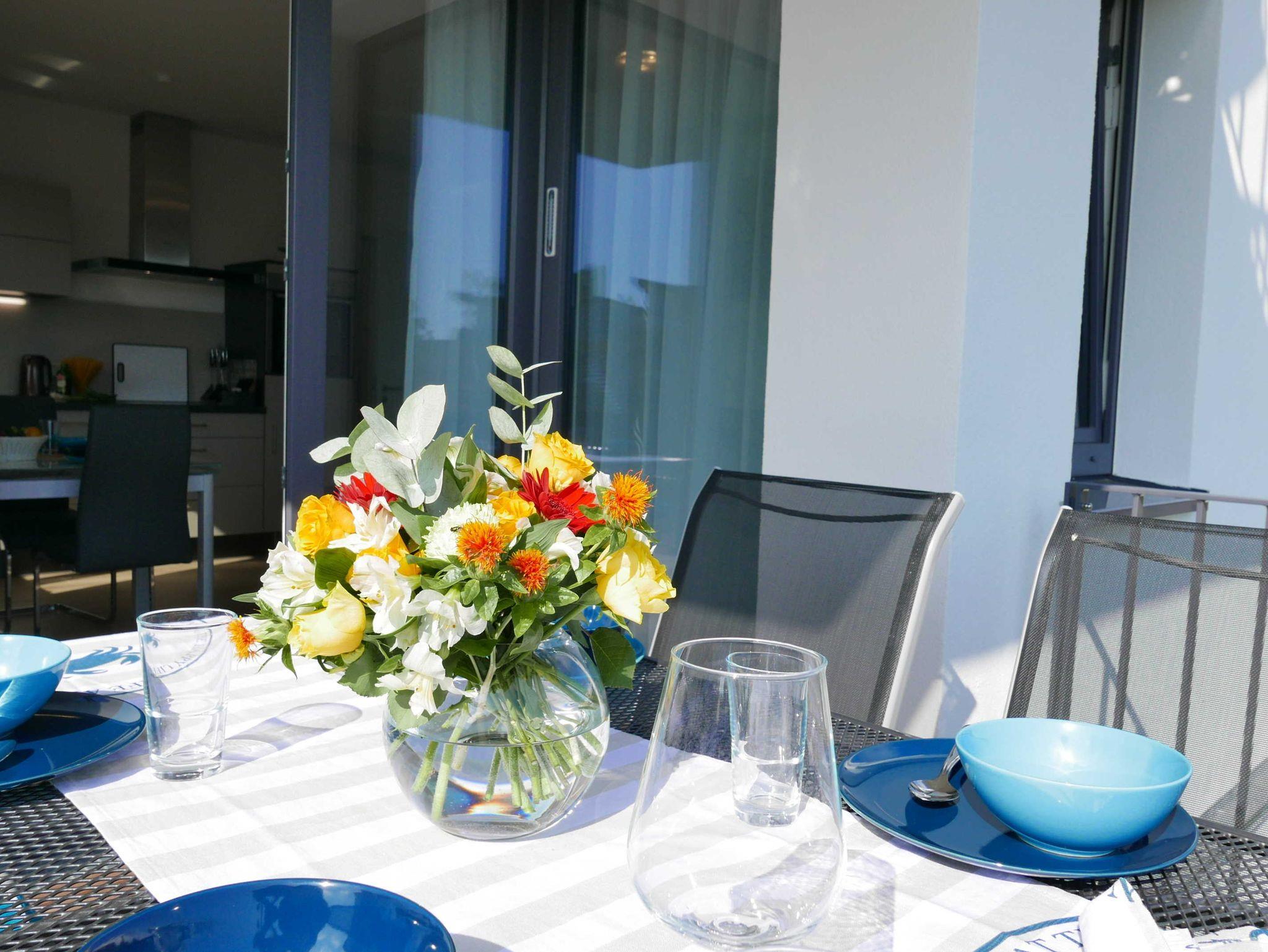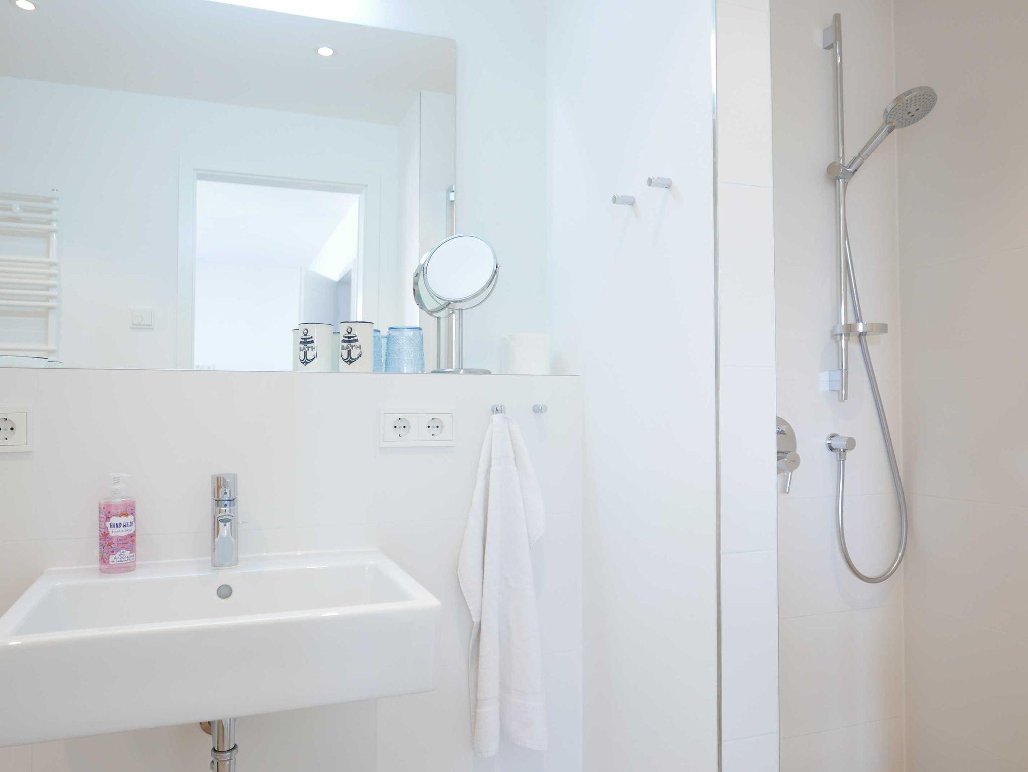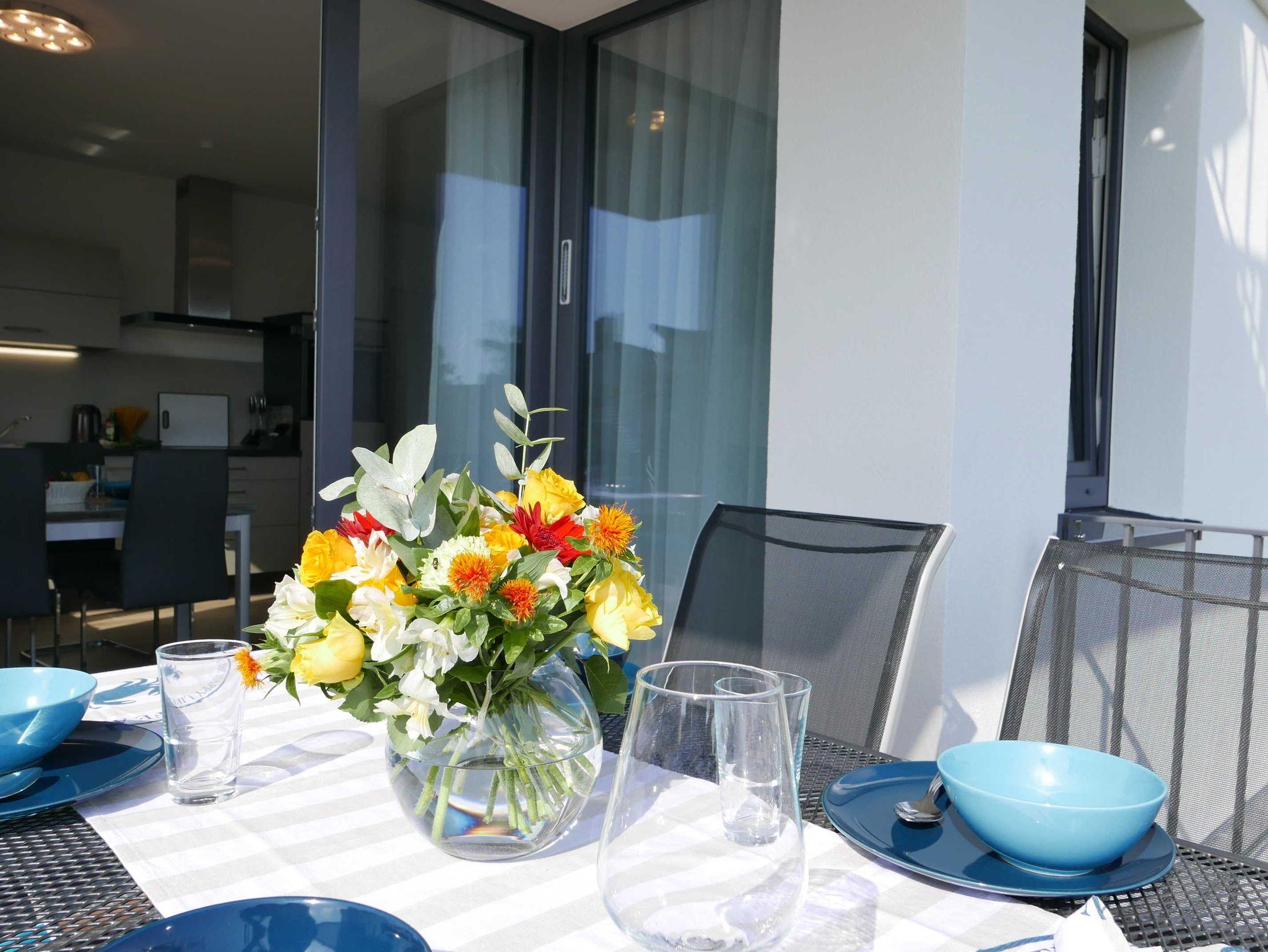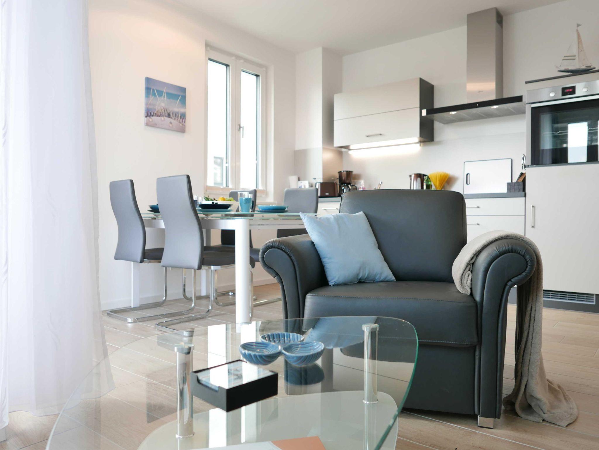 Helle moderne Ferienwohnung mit Meerblick vom Balkon für 4 Personen vis a vis dem Meer und Strand. Sie ist gelegen im ersten Obergeschoss der Villa Strandläufer vom Villen-Ensemble Baabe.