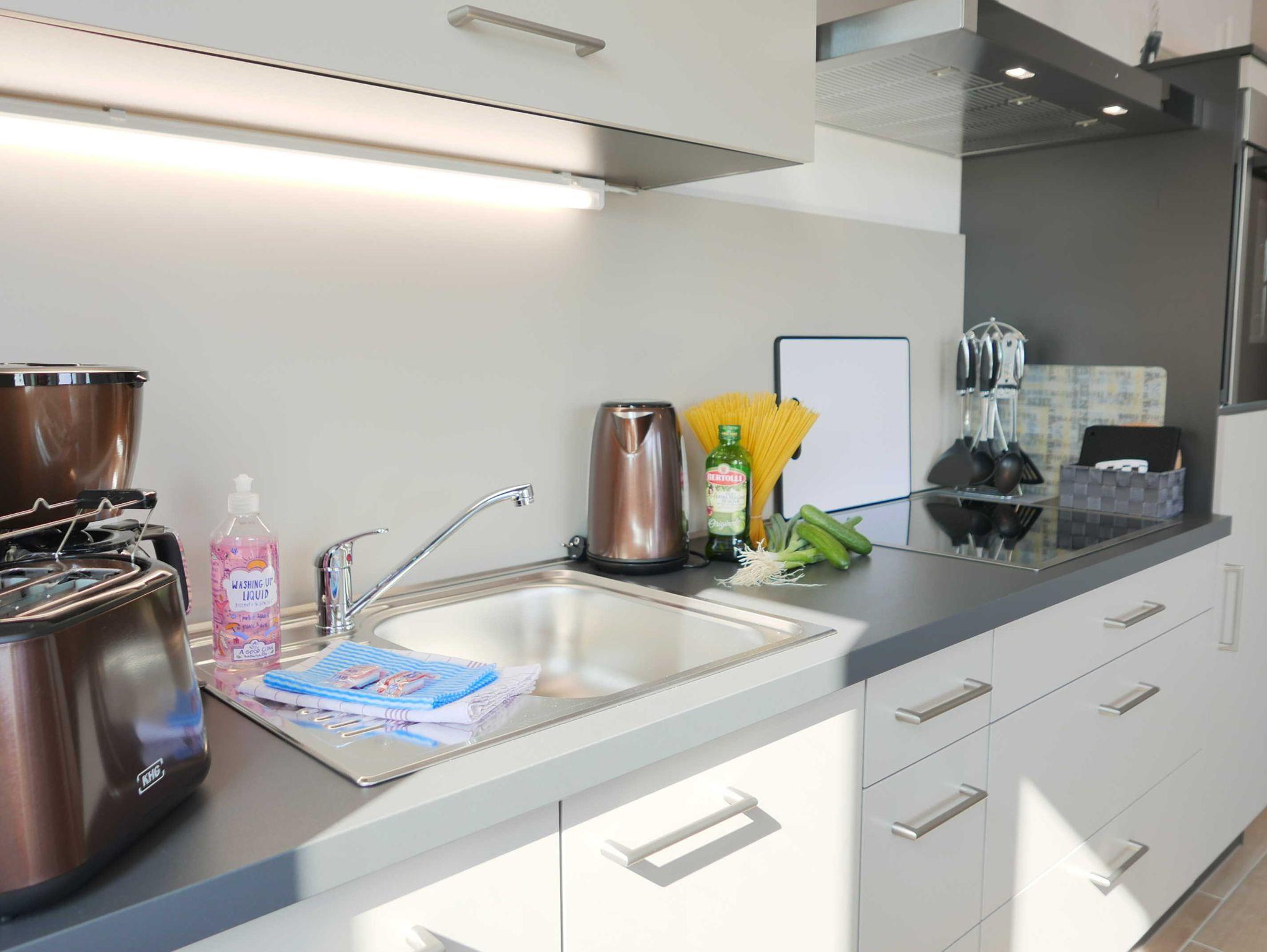 Im Wohnbereich befindet sich ein bequemes Schlafsofa mit einer Liegefläche von 150 x 200 cm. Hier können 2 weitere Personen bequem schlafen mit ausgestatteter Küchenzeile mit Geschirrspülmaschine, Backofen und vielen mehr.