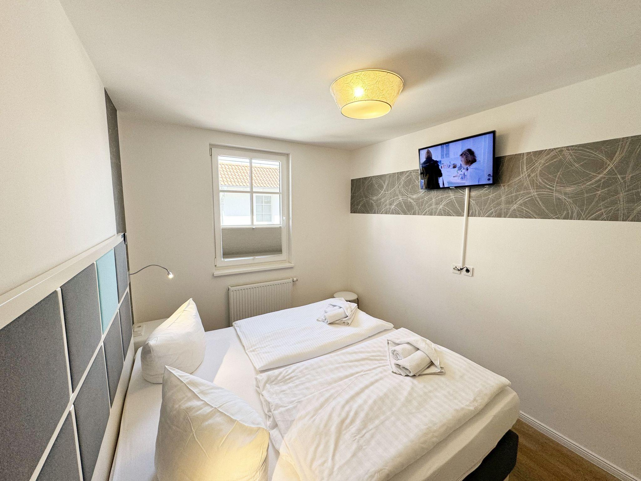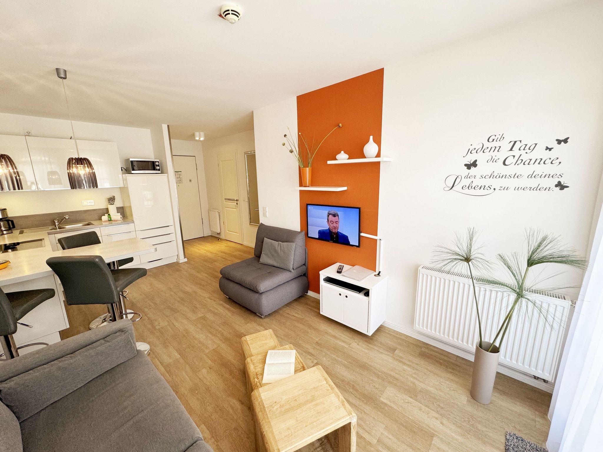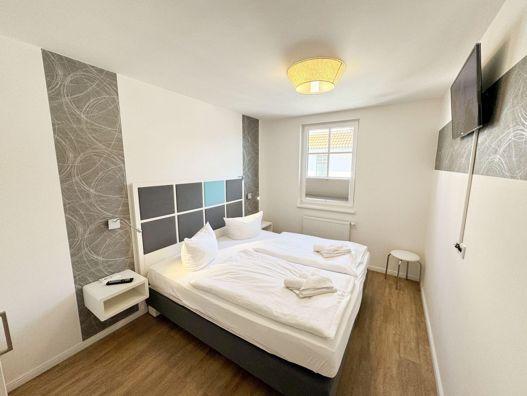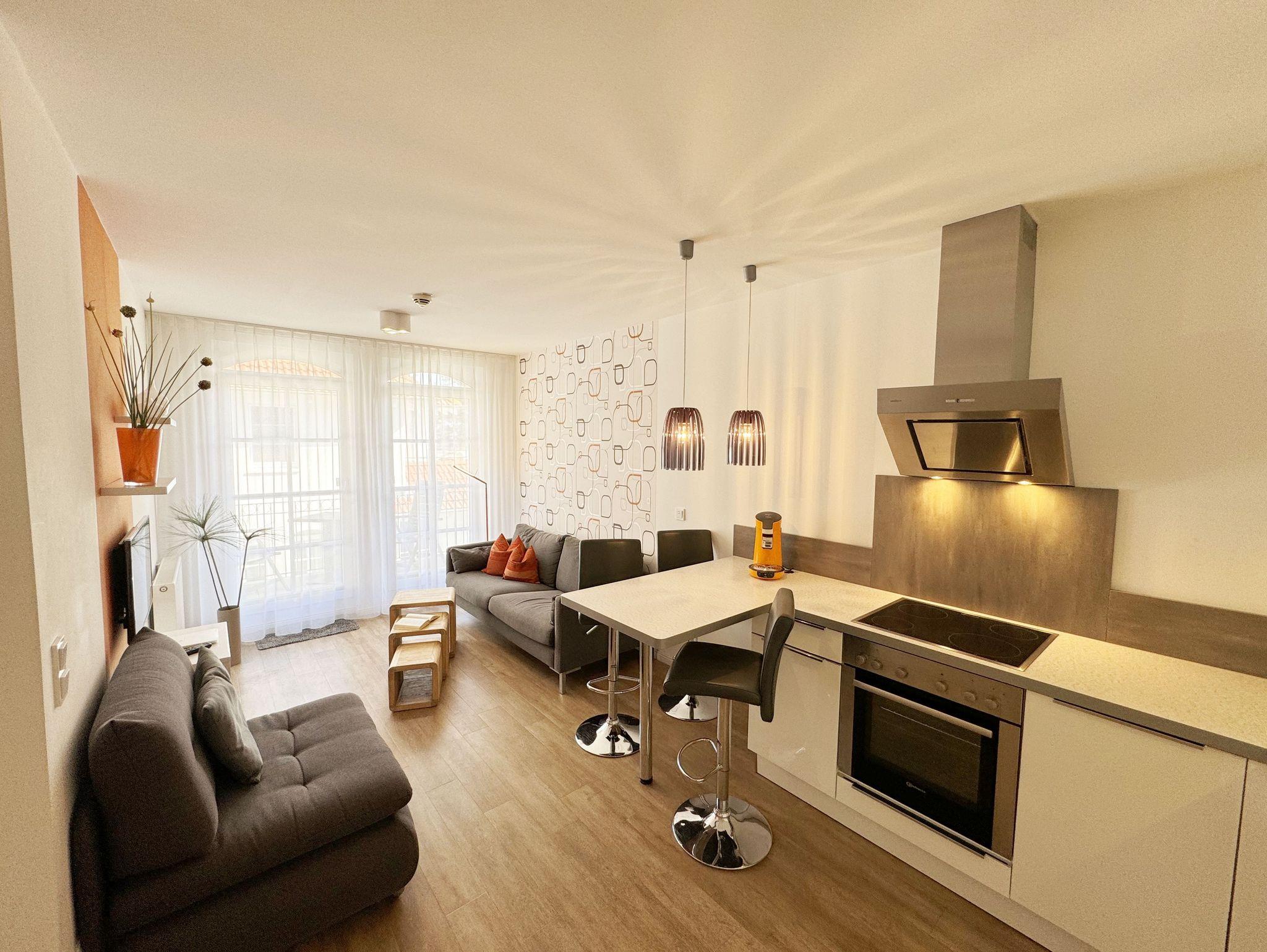 Ihre Nichtraucher/Ferienwohnung ist mit viel Liebe zum Detail ausgestattet und eingerichtet. Sie wohnen in einer ca. 40 m² 2-Zimmerwohnung, die ideal für 2 Personen ist. Die Wohnung A 2.05 befindet sich in der 2. Etage und ist per Fahrstuhl bequem zu erreichen. In der Wohnung finden Sie einen kombinierten Wohn-/Koch- und Essbereich. Die integrierte Küchenzeile lässt mit Mikrowelle, Backofen, Ceranfeld, Spülmaschine, Kühlschrank mit Gefrierfach, Kaffeemaschine, Toaster, Wasserkocher und anderen praktischen Helfern keine Wünsche offen. Im Wohnbereich ist weiterhin eine Essecke sowie eine gemütliche Couch mit LED-TV und DVD-Player. Auch auf einen Internetanschluss (WLAN/LAN) müssen Sie nicht verzichten! Dieser ist für Sie inklusive. Der Balkon ist vom Wohn-/Essbereich begehbar und komplett möbliert. Von hier aus haben Sie einen Blick in Richtung Inselparadies und teilweise Meerblick. Das Schlafzimmer ist mit einem Boxspringbett (1,80 m x 2,00 m), Nachttischkonsolen, einem Kleiderschrank und LED-TV ausgestattet. Das Bad verfügt über eine ebenerdige Dusche, Waschbecken, Fön, WC und Handtuchheizkörper. Im kleinen Abstellraum befinden sich unteranderem Reinigungsutensilien sowie ein Wäscheständer. Ein eigener PKW-Stellplatz Nr. 71 (Einfahrtshöhe 2,00m) befindet sich in der Tiefgarage des Hauses. Im Keller des Hauses haben Sie die Möglichkeit eine Waschmaschine/Trockner gegen Gebühr zu nutzen. Ein Haustier ist gegen eine Gebühr ein gern gesehener Gast, dazu stehen ein Hundenapf sowie ein Schlafplatz zur Verfügung. Mit dem Fahrstuhl des Hauses A gelangen sie in das Untergeschoss der Meeresblickanlage, wo Sie ein großzügiger und heller Wellnessbereich erwartet. Hier können sie in einem Pool kleine Bahnen schwimmen, in 2 Saunen Ihren Kreislauf in Schwung bringen, in einem dazugehörigen Ruheraum Ihren Körper wieder beruhigen, in einer Schneckendusche sowie weiteren Duschen das kühle Nass genießen und auf einer Außenterrasse mit Außendusche die frische Luft einatmen. Die Erstausstattung eines Wäschepaketes (komplette Bettwäsche, 1 Duschhandtuch, 2 kleine Handtücher) können Sie bis 14 Tage vor Anreise gegen einen Aufpreis dazu buchen oder durch eigene ergänzen. Ab 2 gebuchten Paketen erhalten Sie einmalig 1 Geschirrhandtuch und 1 Duschvorleger hinzu.