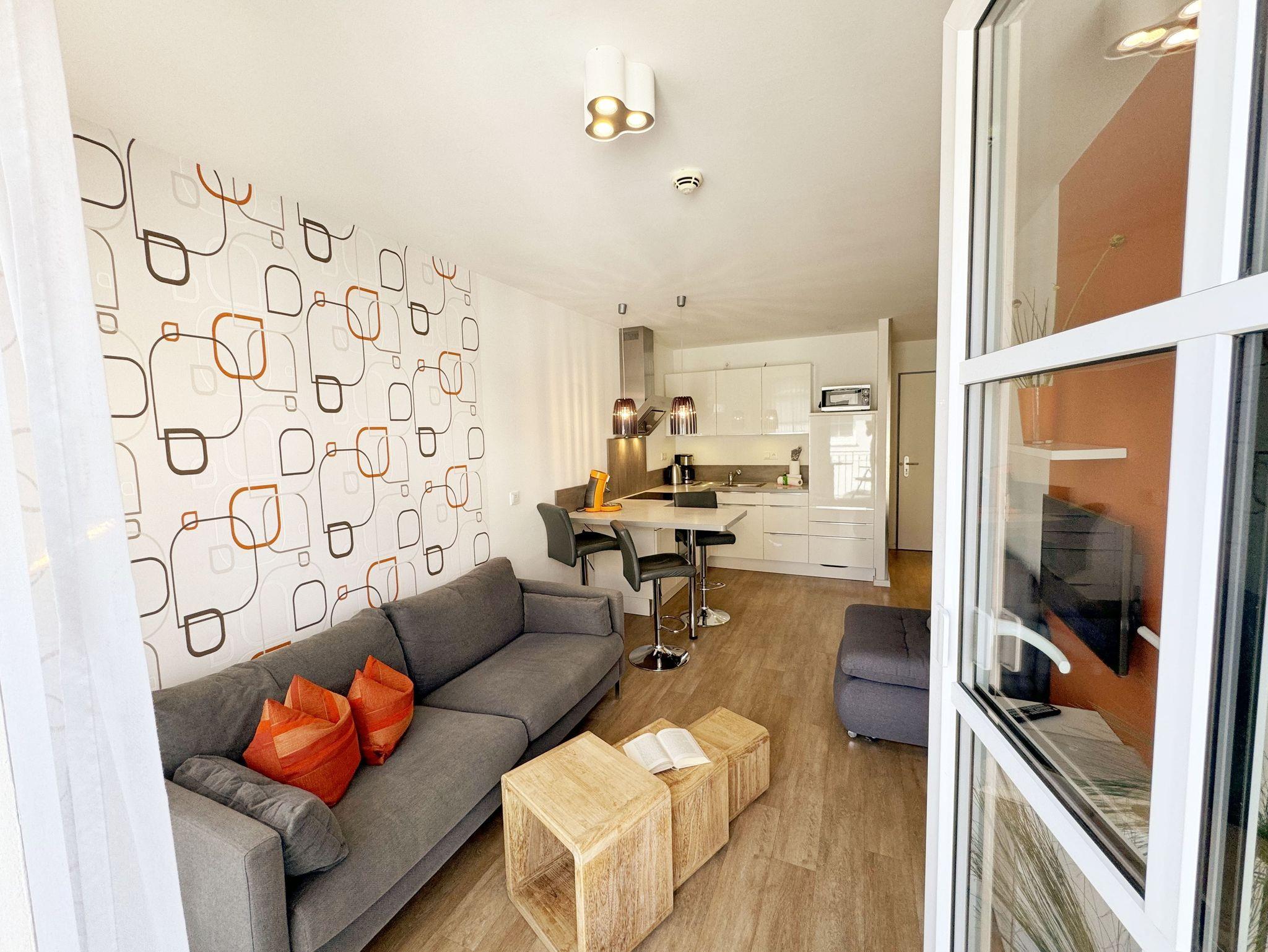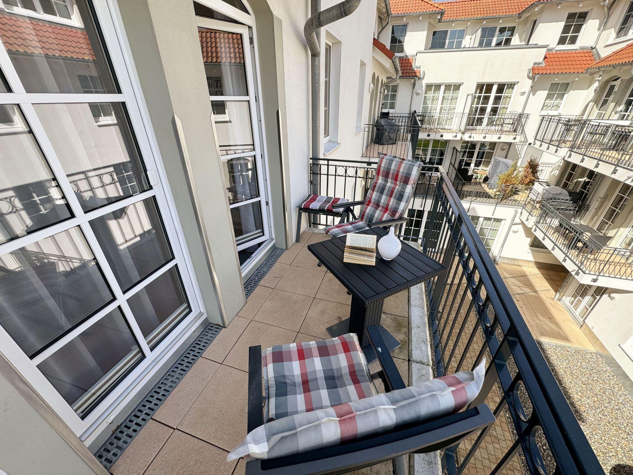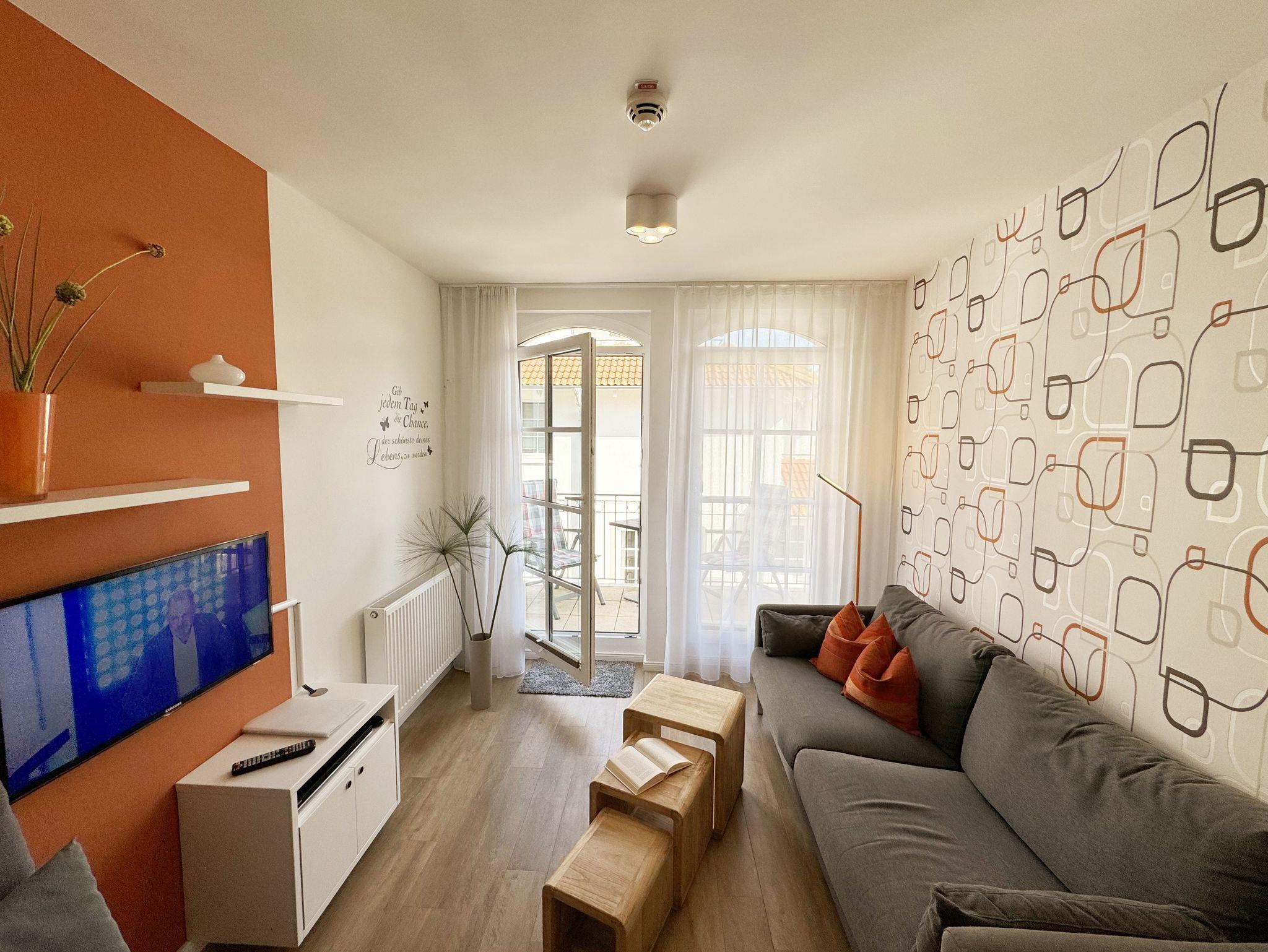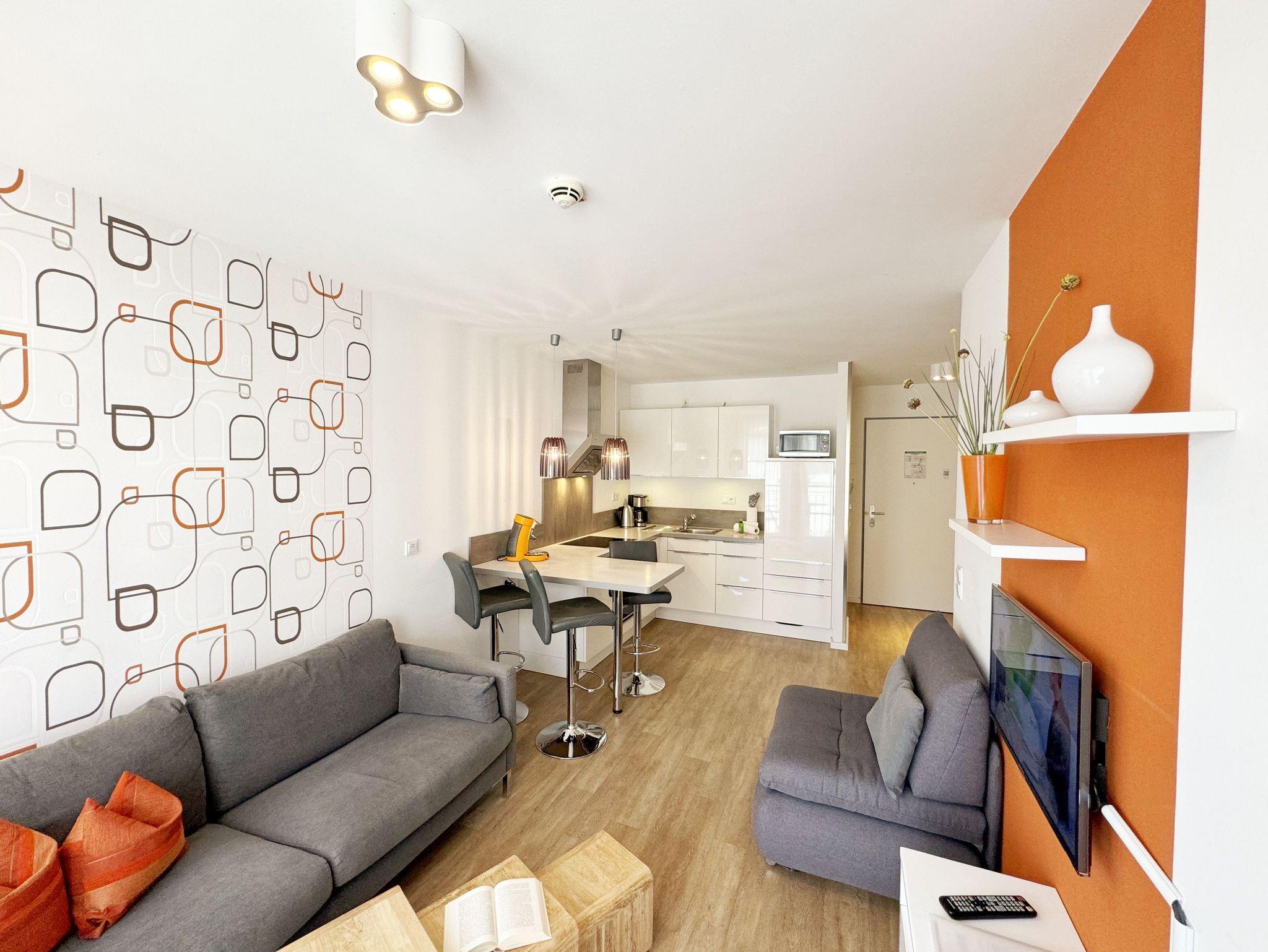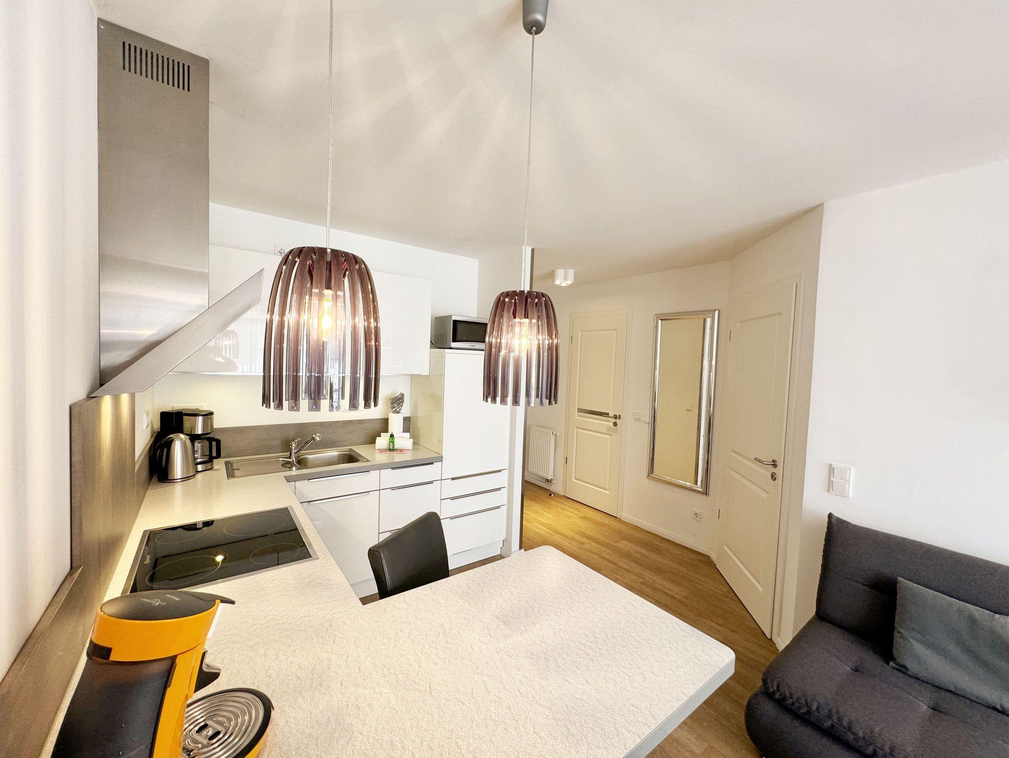 Ihre Nichtraucher/Ferienwohnung ist mit viel Liebe zum Detail ausgestattet und eingerichtet. Sie wohnen in einer ca. 40 m² 2-Zimmerwohnung, die ideal für 2 Personen ist. Die Wohnung A 2.05 befindet sich in der 2. Etage und ist per Fahrstuhl bequem zu erreichen. In der Wohnung finden Sie einen kombinierten Wohn-/Koch- und Essbereich. Die integrierte Küchenzeile lässt mit Mikrowelle, Backofen, Ceranfeld, Spülmaschine, Kühlschrank mit Gefrierfach, Kaffeemaschine, Toaster, Wasserkocher und anderen praktischen Helfern keine Wünsche offen. Im Wohnbereich ist weiterhin eine Essecke sowie eine gemütliche Couch mit LED-TV und DVD-Player. Auch auf einen Internetanschluss (WLAN/LAN) müssen Sie nicht verzichten! Dieser ist für Sie inklusive. Der Balkon ist vom Wohn-/Essbereich begehbar und komplett möbliert. Von hier aus haben Sie einen Blick in Richtung Inselparadies und teilweise Meerblick. Das Schlafzimmer ist mit einem Boxspringbett (1,80 m x 2,00 m), Nachttischkonsolen, einem Kleiderschrank und LED-TV ausgestattet. Das Bad verfügt über eine ebenerdige Dusche, Waschbecken, Fön, WC und Handtuchheizkörper. Im kleinen Abstellraum befinden sich unteranderem Reinigungsutensilien sowie ein Wäscheständer. Ein eigener PKW-Stellplatz Nr. 71 (Einfahrtshöhe 2,00m) befindet sich in der Tiefgarage des Hauses. Im Keller des Hauses haben Sie die Möglichkeit eine Waschmaschine/Trockner gegen Gebühr zu nutzen. Ein Haustier ist gegen eine Gebühr ein gern gesehener Gast, dazu stehen ein Hundenapf sowie ein Schlafplatz zur Verfügung. Mit dem Fahrstuhl des Hauses A gelangen sie in das Untergeschoss der Meeresblickanlage, wo Sie ein großzügiger und heller Wellnessbereich erwartet. Hier können sie in einem Pool kleine Bahnen schwimmen, in 2 Saunen Ihren Kreislauf in Schwung bringen, in einem dazugehörigen Ruheraum Ihren Körper wieder beruhigen, in einer Schneckendusche sowie weiteren Duschen das kühle Nass genießen und auf einer Außenterrasse mit Außendusche die frische Luft einatmen. Die Erstausstattung eines Wäschepaketes (komplette Bettwäsche, 1 Duschhandtuch, 2 kleine Handtücher) können Sie bis 14 Tage vor Anreise gegen einen Aufpreis dazu buchen oder durch eigene ergänzen. Ab 2 gebuchten Paketen erhalten Sie einmalig 1 Geschirrhandtuch und 1 Duschvorleger hinzu.