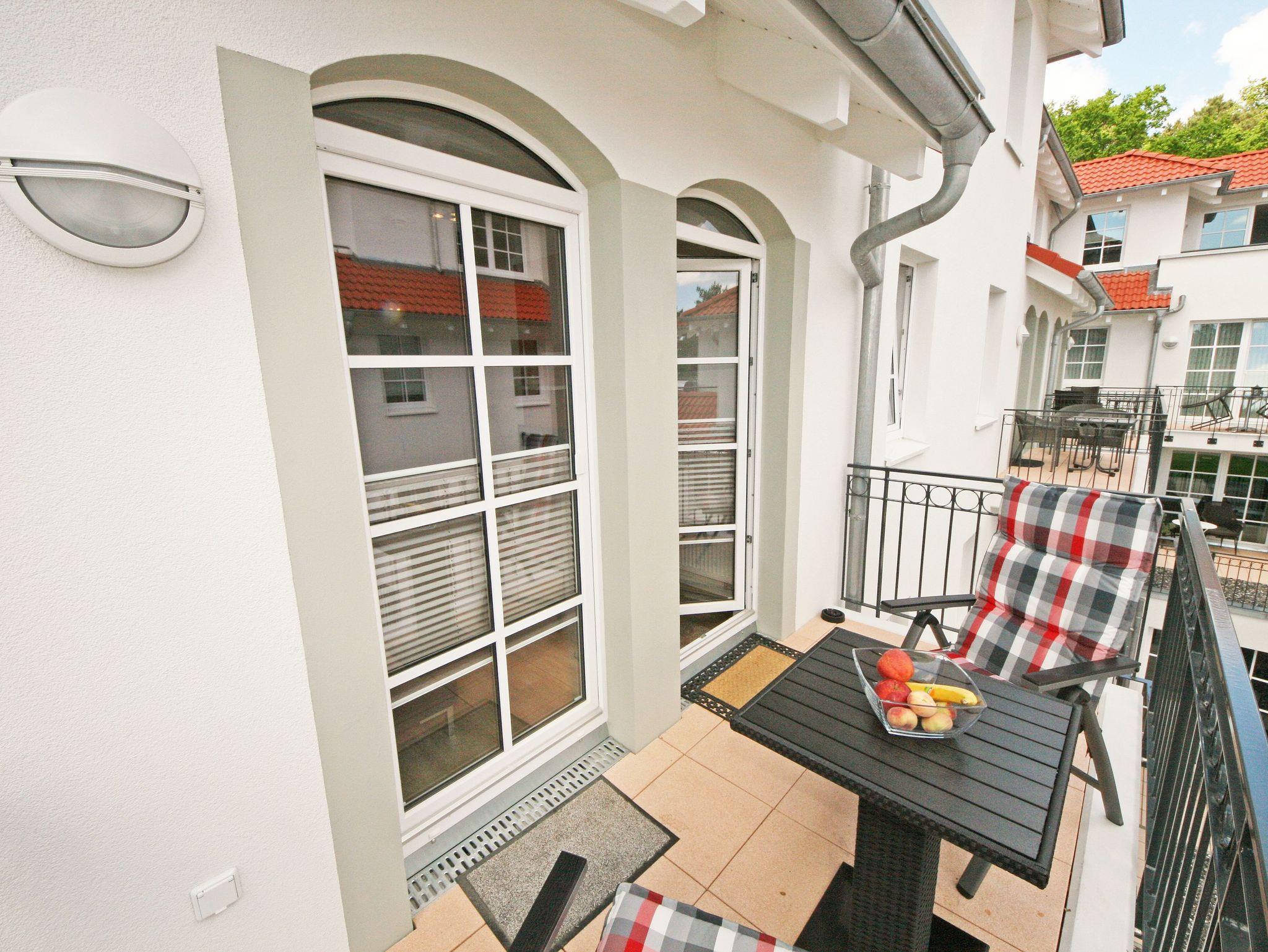 Unmittelbar am Kurpark des Ostseebades Baabe, umgeben von Kiefern befindet sich die neue Appartementanlage Meeresblick. Die Ferienanlage besteht aus 3 freistehenden Häusern und ist nur ca. 80 Meter vom feinen Sandstrand entfernt. An die hiesige Bäderarchitektur angelehnt fügt sich die Meeresblickanlage wohltuend in die Umgebung ein. Die Ferienwohnungen verfügen über einen hohen Komfort und lassen Ihren Urlaubstraum wahr werden. Im Haupthaus befindet sich ein Wellnessbereich mit Innenpool, Sauna und Ruheraum (inklusive) der zur Entspannung einlädt. Eine hauseigene Tiefgarage sorgt dafür, dass Ihr PKW sicher untergebracht ist. Cafés und Restaurants laden in der Anlage zum Verweilen ein. Ein weiteres Highlight ist der Müther Schalenbau (Restaurant Inselparadies Baabe), welches saniert, restauriert und in die Meeresblickanlage liebevoll integriert wurde. Die Wohnung (A 2.05) befindet sich im Haupthaus A im 2. Obergeschoss und verfügt über einen Balkon mit Blick Richtung Inselparadies und etwas Meerblick.