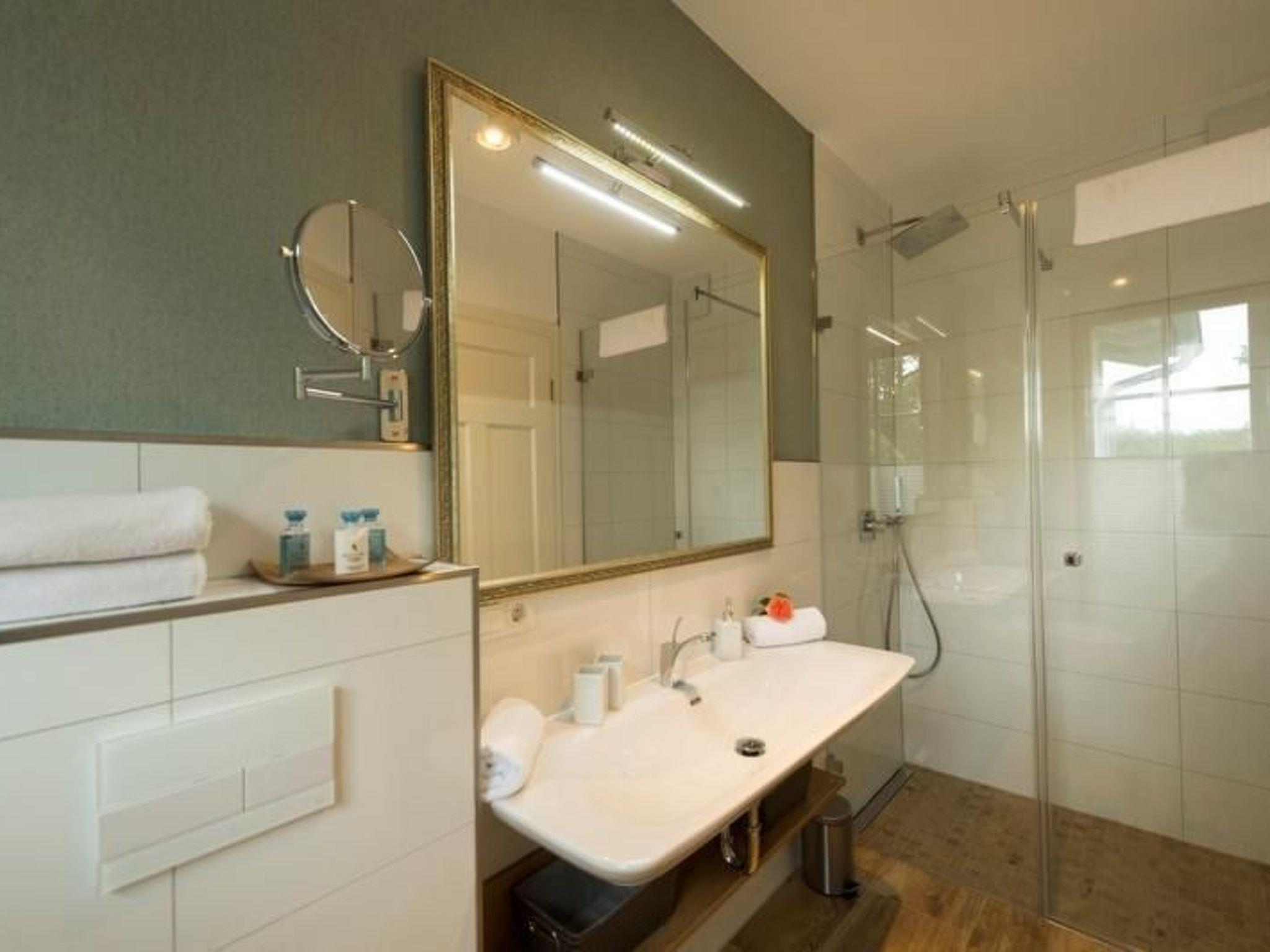 - 1 bedroom with a comfort double bed (180 x 200 cm), 2 bedside tables with bedside lamps and large built-in wardrobe, 1 small linen cupboard, 1 mute servant flat screen TV with radio function (32 inch), radio alarm clock, access to the small balcony - 1 bathroom with large walk-in shower, double washbasin, 1 free-standing bathtub, WC, hairdryer, shower stool, make-up mirror, sauna, small flat screen TV with radio function (22 inch) and window (The bathroom can be reached from the hallway as well as from the bedroom.) - 1 bedroom with a comfortable double bed (180 x 200 cm), 2 bedside tables with bedside lamps and large built-in wardrobe, 1 mute servant, 1 flat-screen TV with radio function (32 inch), radio alarm clock - 1 bathroom with walk-in shower, washbasin, WC, hairdryer, make-up mirror and window (The bathroom can be reached from the bedroom.) - 1 large balcony with garden furniture for 4 people and 1 beach chair - 1 small balcony with garden furniture for 2 people - 1 small utility room with: 1 ironing board and 1 iron. 1 washing machine with tumble dryer (free of charge) 1 hoover, 1 broom, 1 dustpan set, 1 mop 1 clothes horse with clamps - The entire flat is equipped with underfloor heating - Blackout curtains - Non-smoking!
