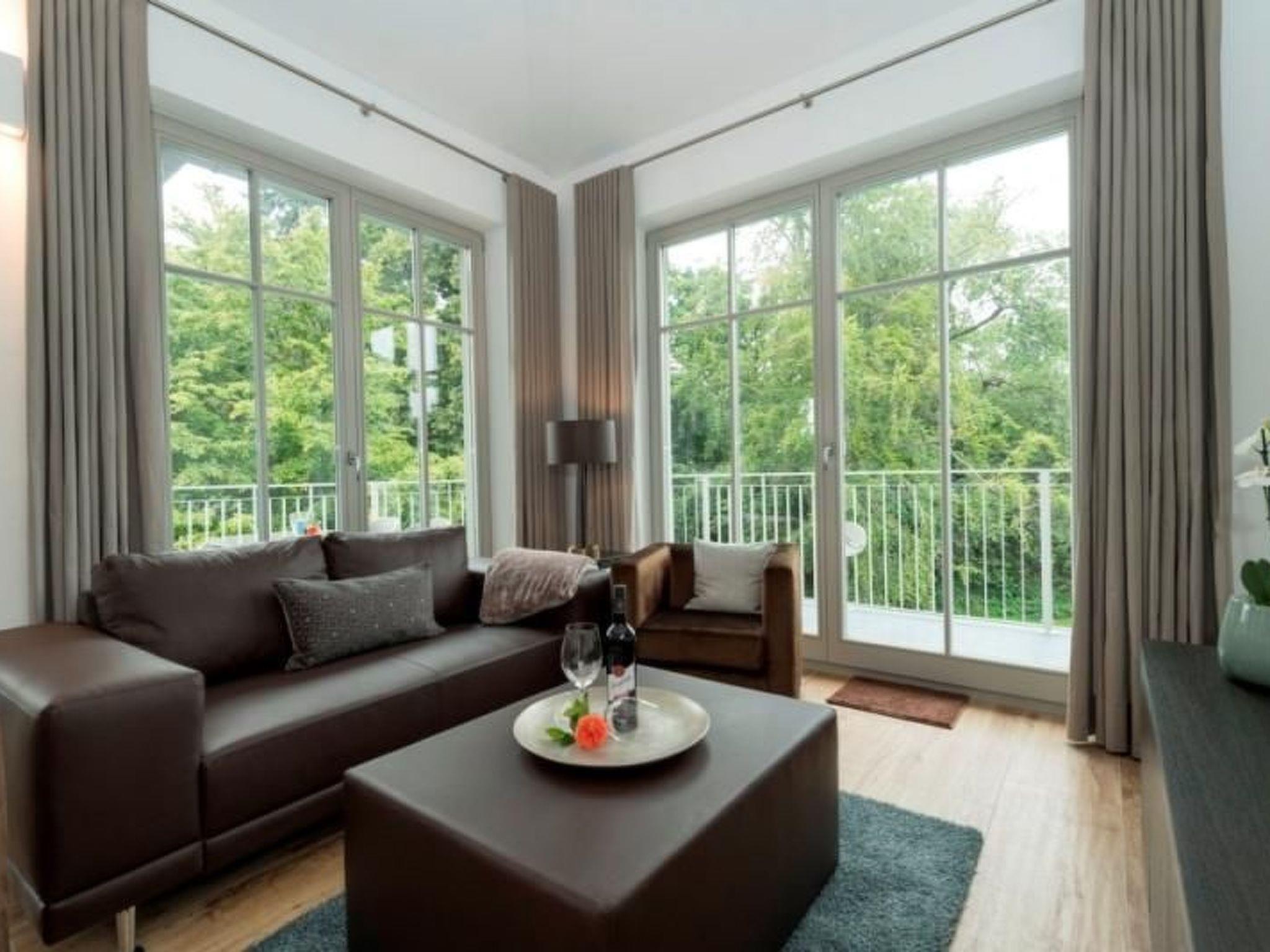 Our newly built Villa Pauline (August 2016) is situated in an exposed and idyllic location directly on the forest promenade on the high shore in the Baltic seaside resort of Göhren. The spacious 3-room holiday flat is perfect for families and individual travellers. The exclusive 3-room holiday flat is modern and furnished to a high standard and has a large balcony and a small balcony to enjoy the good Baltic Sea air and sunshine on Rügen at any time. The fine sandy north beach with the amber promenade is about 400 metres away and the natural beach (south beach) can be reached comfortably in about 10 minutes on foot or in even less time by bike. Incidentally, you can park your bike directly in your own bike shed at the house. Do you also like to be online on holiday? You'll find free Wi-Fi in the holiday flat. Holiday flat in the Villa Pauline in Göhren on Rügen 3-room holiday flat with 2 balconies, 2nd floor Entire flat with large windows at ground level Fantastic view of the forest promenade on the high shore Distance to the north beach approx. 400 metres and south beach approx. 10 minutes' walk to the town centre Free Wi-Fi in the flat Barrier-free Sauna in the flat Lift in the house with fireplace 2 free parking spaces available directly at the house Bicycle storage available Non-smoking flat! Pets not permitted 3-room flat no. 8 with 2 balconies, 2nd floor.