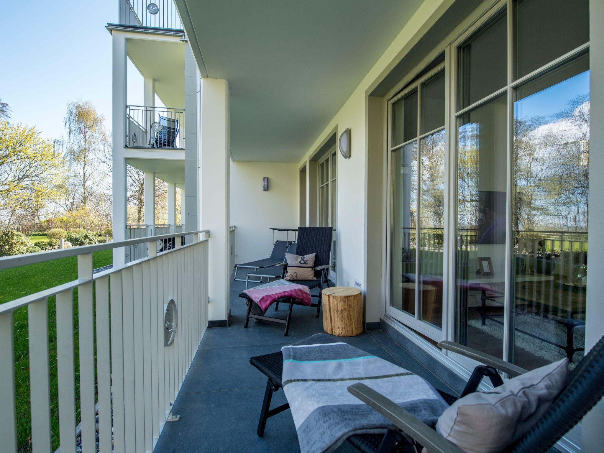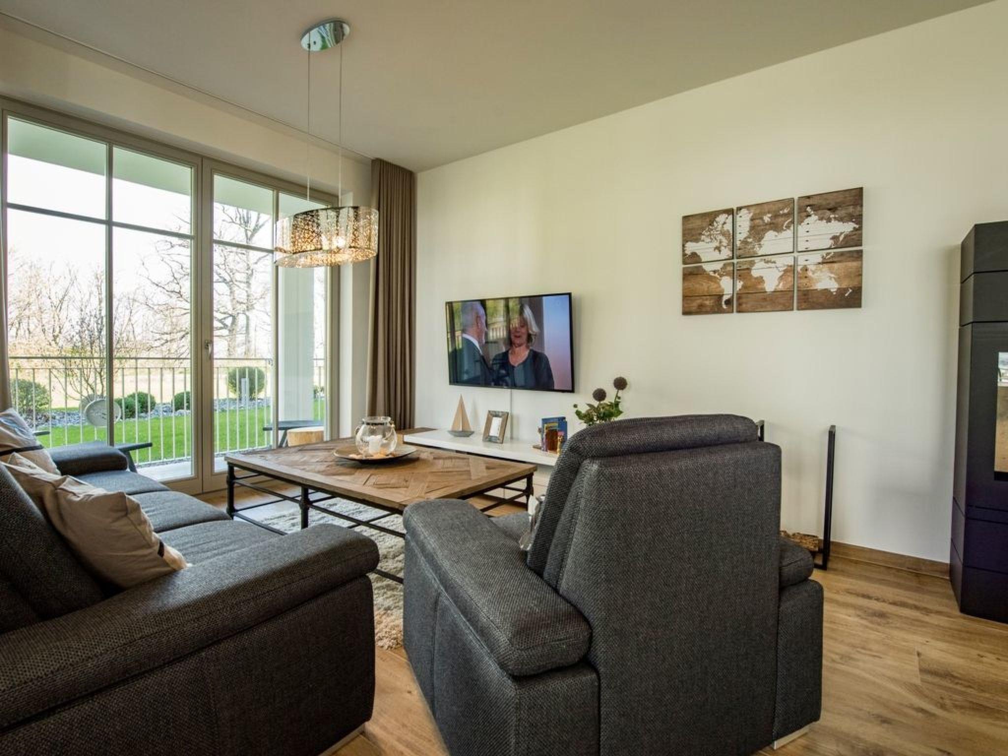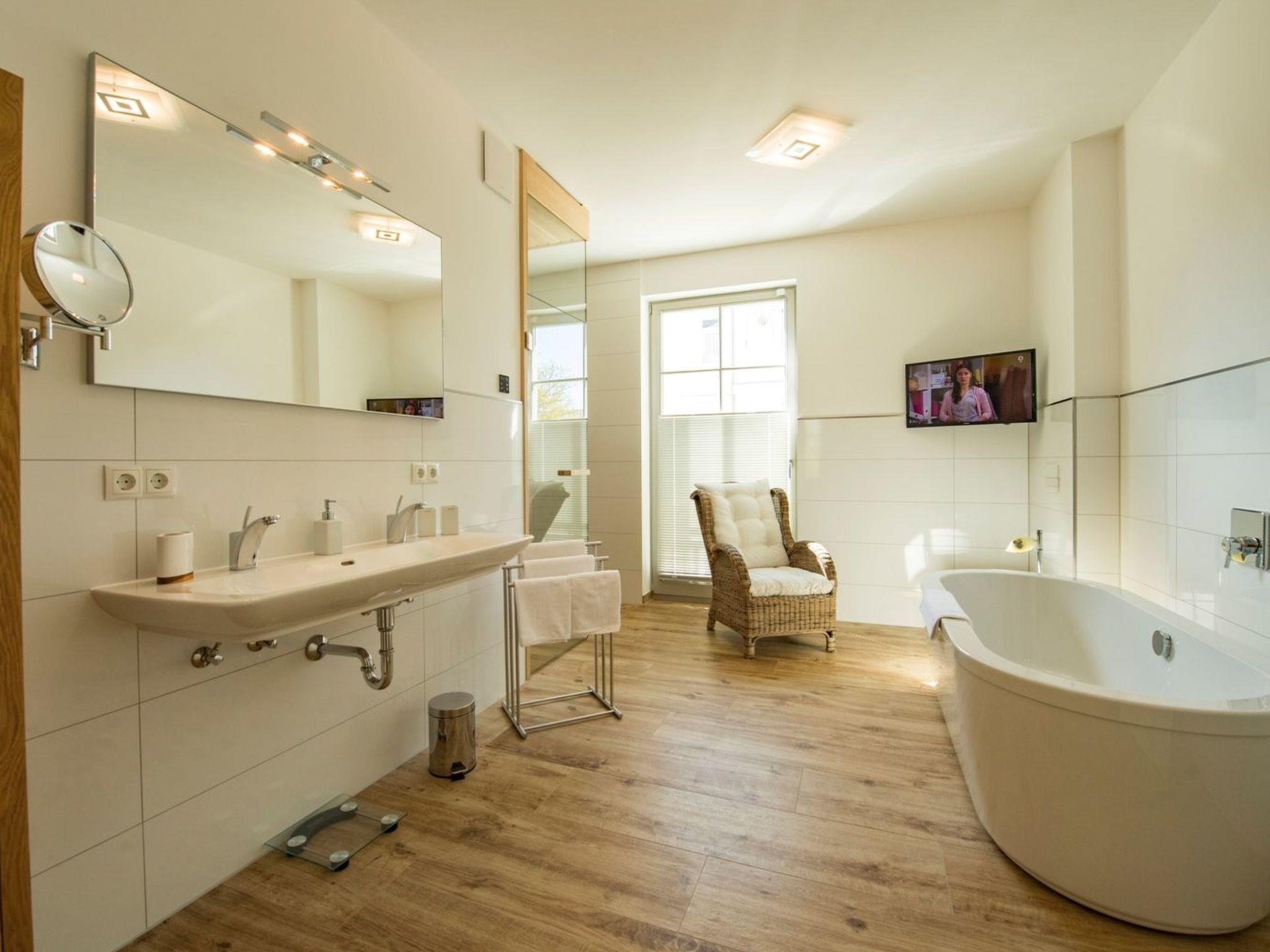- Living space: 108 m² - 3-room flat with 2 fenced terraces - Large entrance area with cloakroom and built-in shoe cabinet as well as intercom system, small safe - Spacious living area with 1 large couch, 1 armchair and 1 coffee table, sideboard with large flat screen TV with radio function (55 inch), dining table with 4 chairs, fireplace, reading corner with armchair and desk, access to the large balcony - Fitted kitchen integrated in the living room, equipped with: - 4-plate ceramic hob - large oven - 1 fridge-freezer combination - dishwasher - toaster - coffee machine - kettle - and kitchen utensils. - 1 bedroom with a comfortable double bed (180 x 200 cm), 2 bedside tables with bedside lamps and large wardrobe, mute servant flat screen TV with radio function (32 inch), access to the small terrace - 1 bathroom with large walk-in shower, double washbasin, 1 free-standing bath, WC, hairdryer, large wicker chair, shower stool, make-up mirror, sauna, small flat screen TV with radio function (22 inch) and window (The bathroom can be reached from the hallway and from the bedroom.) - 1 bedroom with a comfortable double bed (180 x 200 cm), 2 bedside tables with bedside lamps and large wardrobe, 2 armchairs and 1 small table, 1 flat-screen TV with radio function (32 inch), access to the large balcony - 1 bathroom with walk-in shower, washbasin, WC, hairdryer, make-up mirror and window, bath stool (The bathroom can be reached from the bedroom.) - 1 large enclosed terrace with garden furniture for 4 people and 4 sun loungers - 1 small terrace with garden furniture for 4 people - 1 small utility room with: 1 ironing board and 1 iron. 1 washing machine with tumble dryer (free of charge) 1 hoover, 1 broom, 1 dustpan set, 1 mop 1 clothes horse with pegs - The entire flat is equipped with underfloor heating. - Blackout curtains - Non-smoking! - 2 free parking spaces at the house - 1 bicycle shed - free W-LAN - barrier-free/disabled-friendly - lift in the house - no pets allowed!!!