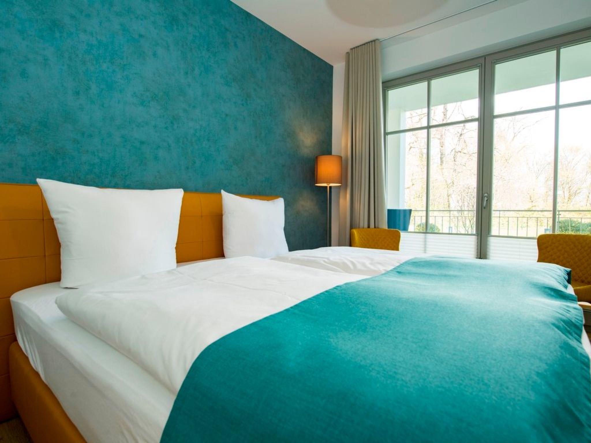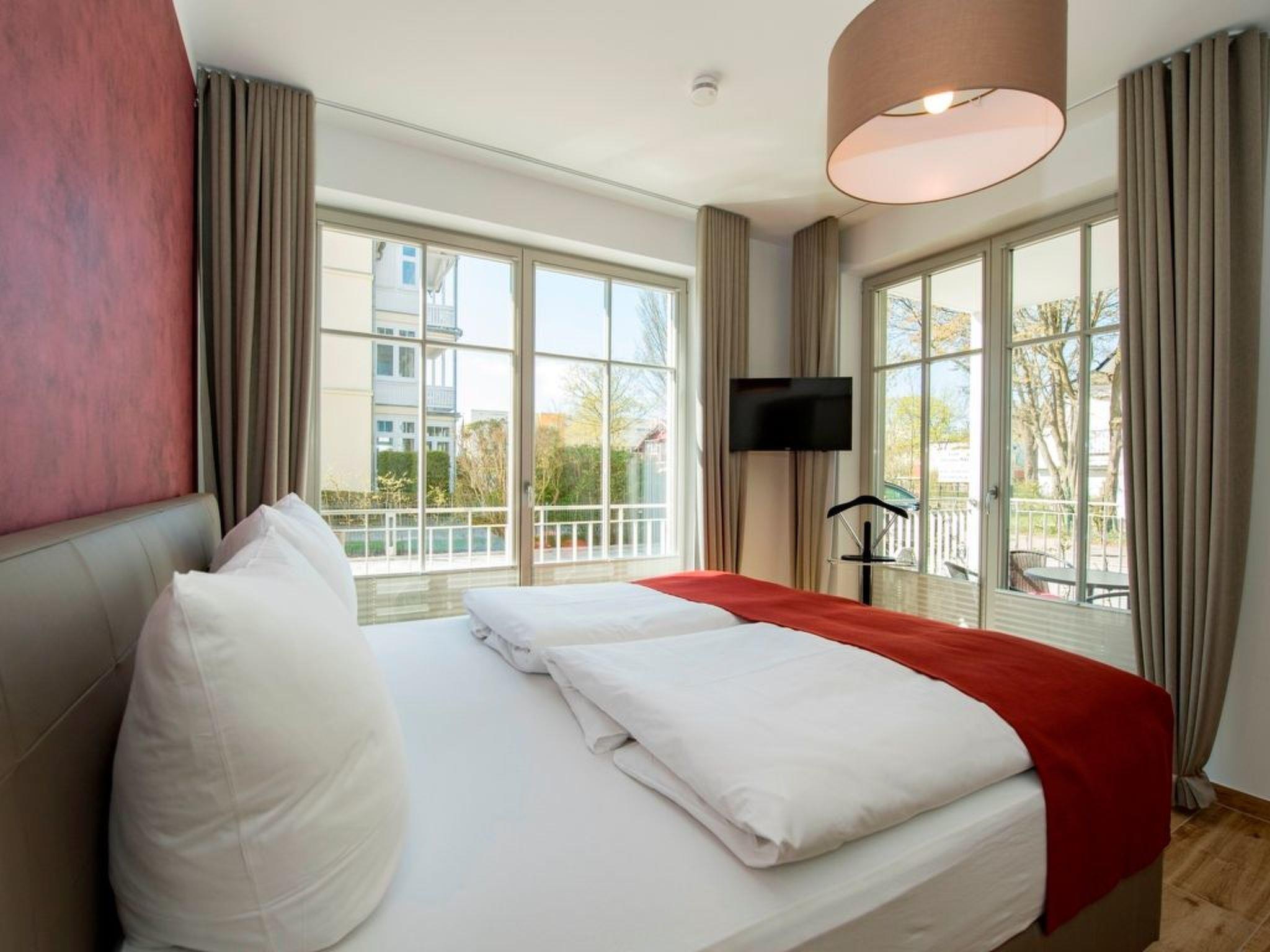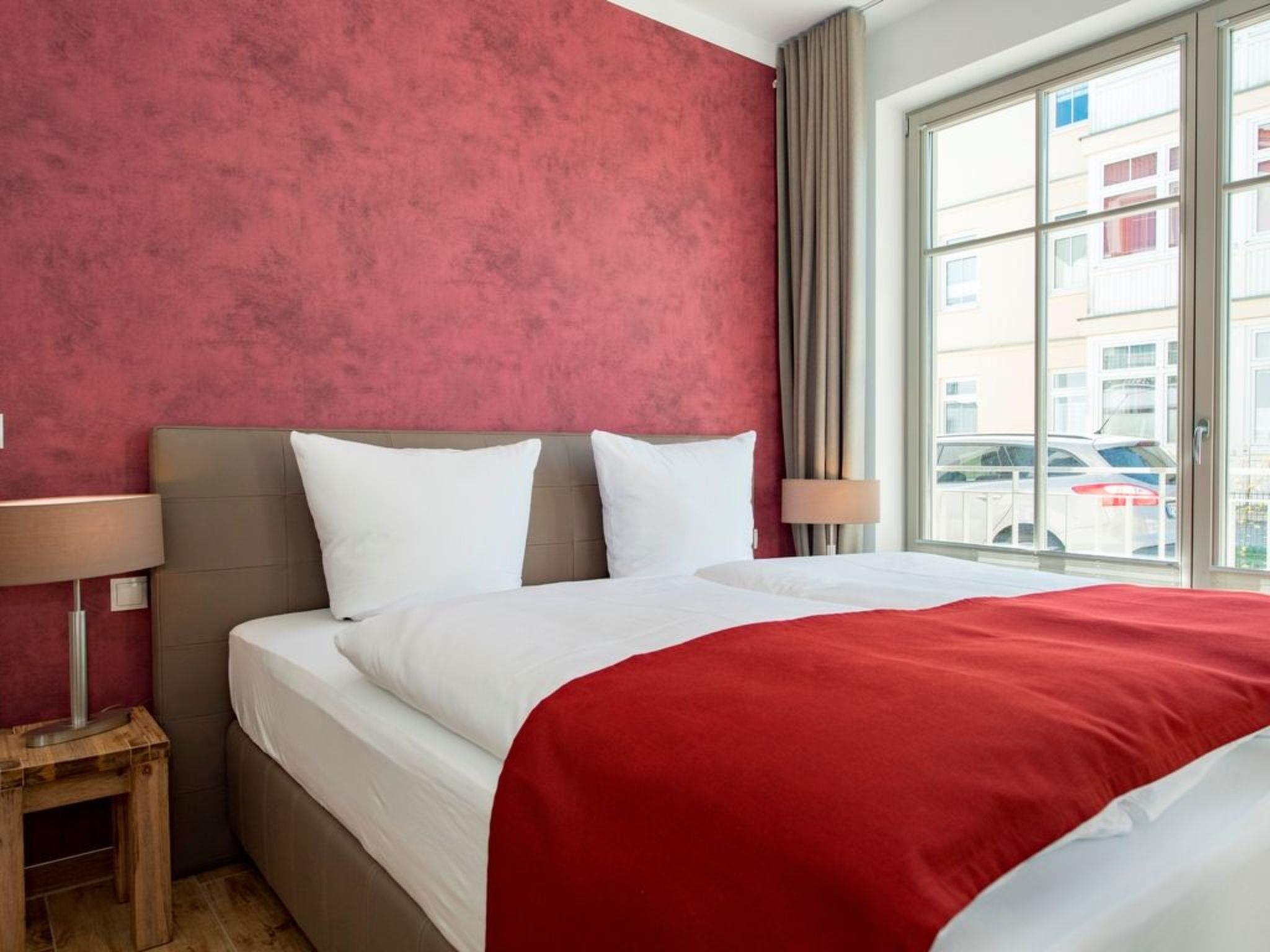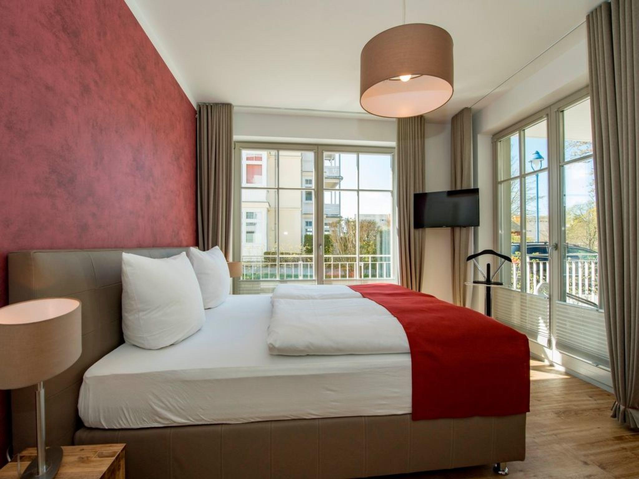- Living space: 108 m² - 3-room flat with 2 fenced terraces - Large entrance area with cloakroom and built-in shoe cabinet as well as intercom system, small safe - Spacious living area with 1 large couch, 1 armchair and 1 coffee table, sideboard with large flat screen TV with radio function (55 inch), dining table with 4 chairs, fireplace, reading corner with armchair and desk, access to the large balcony - Fitted kitchen integrated in the living room, equipped with: - 4-plate ceramic hob - large oven - 1 fridge-freezer combination - dishwasher - toaster - coffee machine - kettle - and kitchen utensils. - 1 bedroom with a comfortable double bed (180 x 200 cm), 2 bedside tables with bedside lamps and large wardrobe, mute servant flat screen TV with radio function (32 inch), access to the small terrace - 1 bathroom with large walk-in shower, double washbasin, 1 free-standing bath, WC, hairdryer, large wicker chair, shower stool, make-up mirror, sauna, small flat screen TV with radio function (22 inch) and window (The bathroom can be reached from the hallway and from the bedroom.) - 1 bedroom with a comfortable double bed (180 x 200 cm), 2 bedside tables with bedside lamps and large wardrobe, 2 armchairs and 1 small table, 1 flat-screen TV with radio function (32 inch), access to the large balcony - 1 bathroom with walk-in shower, washbasin, WC, hairdryer, make-up mirror and window, bath stool (The bathroom can be reached from the bedroom.) - 1 large enclosed terrace with garden furniture for 4 people and 4 sun loungers - 1 small terrace with garden furniture for 4 people - 1 small utility room with: 1 ironing board and 1 iron. 1 washing machine with tumble dryer (free of charge) 1 hoover, 1 broom, 1 dustpan set, 1 mop 1 clothes horse with pegs - The entire flat is equipped with underfloor heating. - Blackout curtains - Non-smoking! - 2 free parking spaces at the house - 1 bicycle shed - free W-LAN - barrier-free/disabled-friendly - lift in the house - no pets allowed!!!