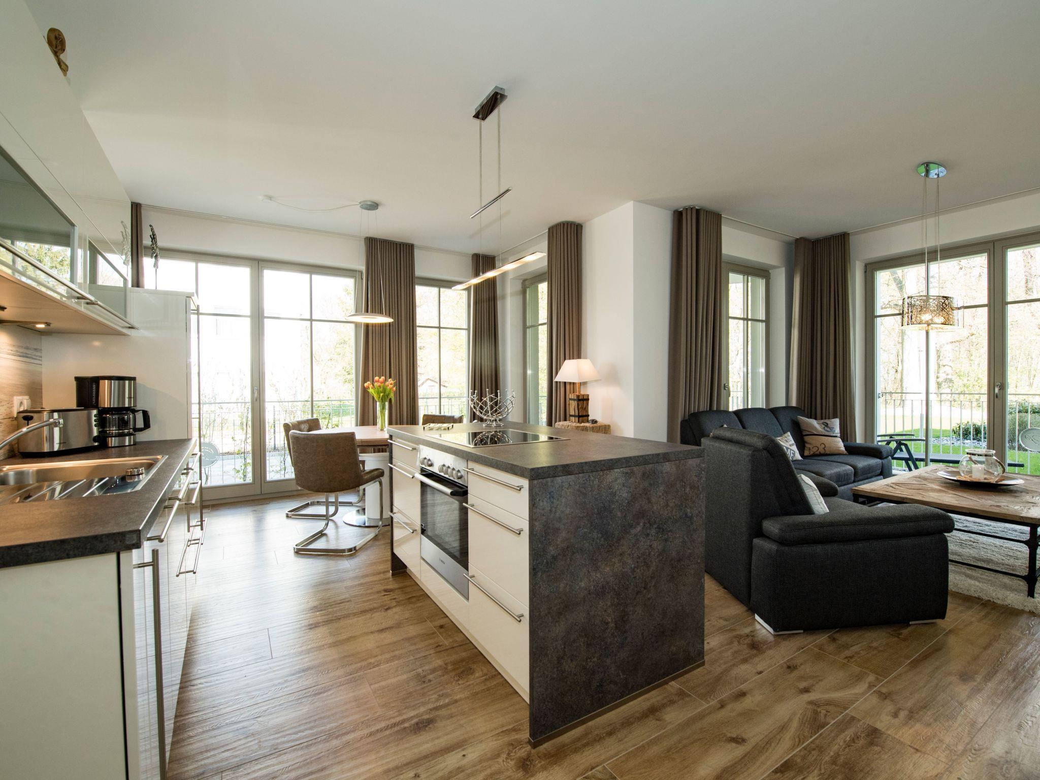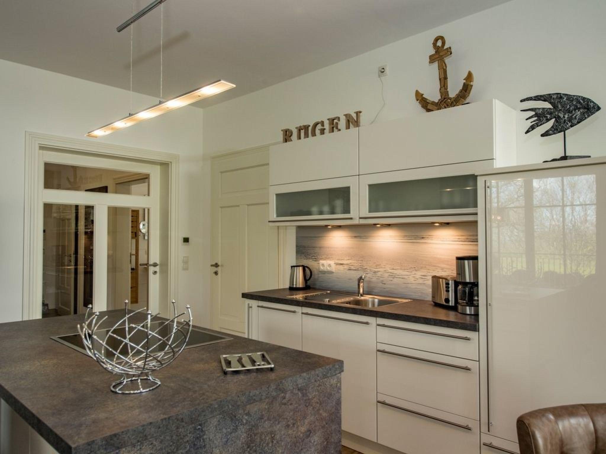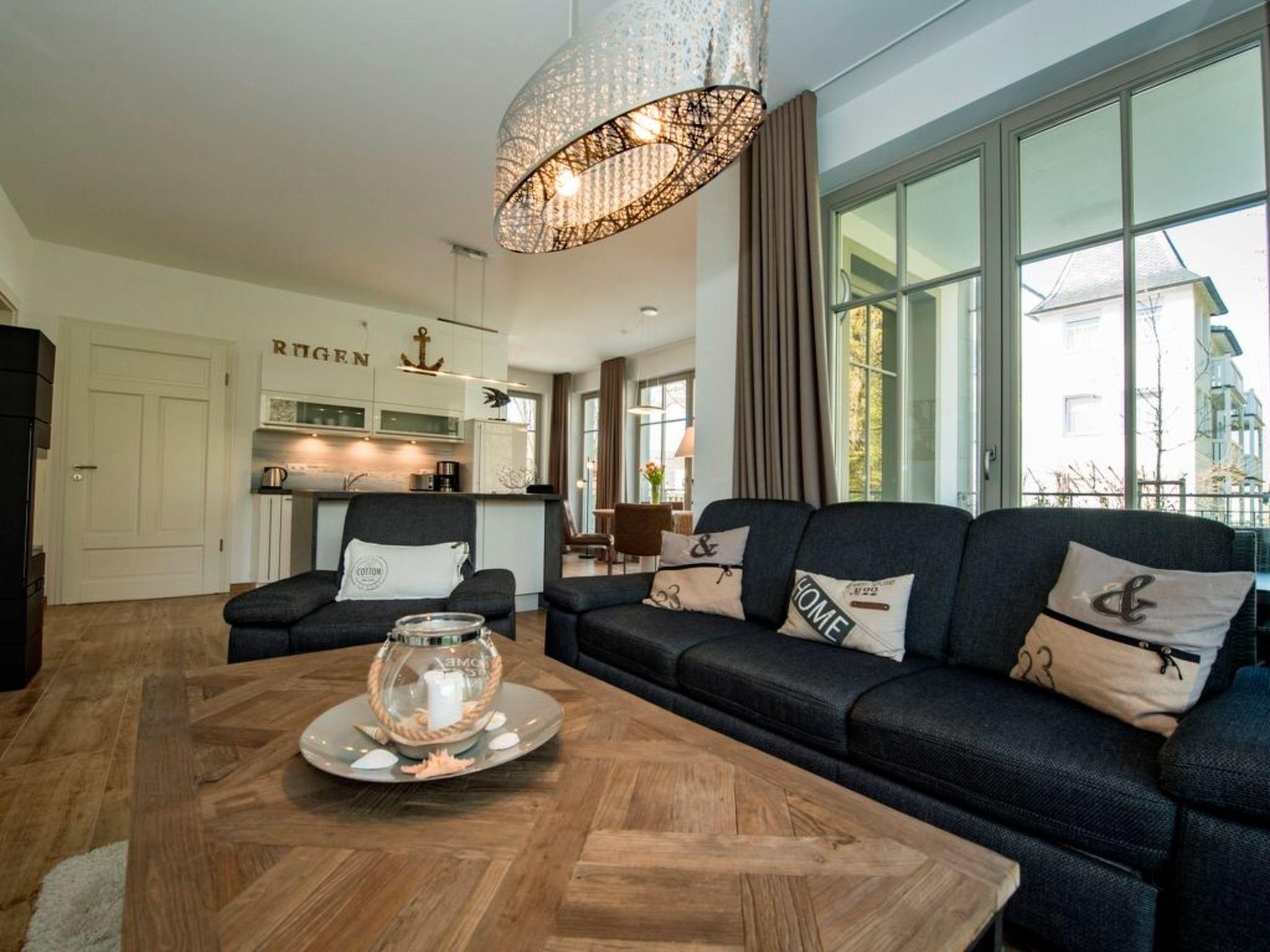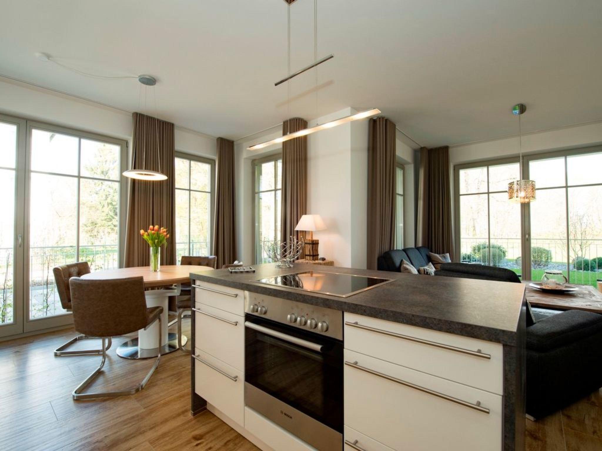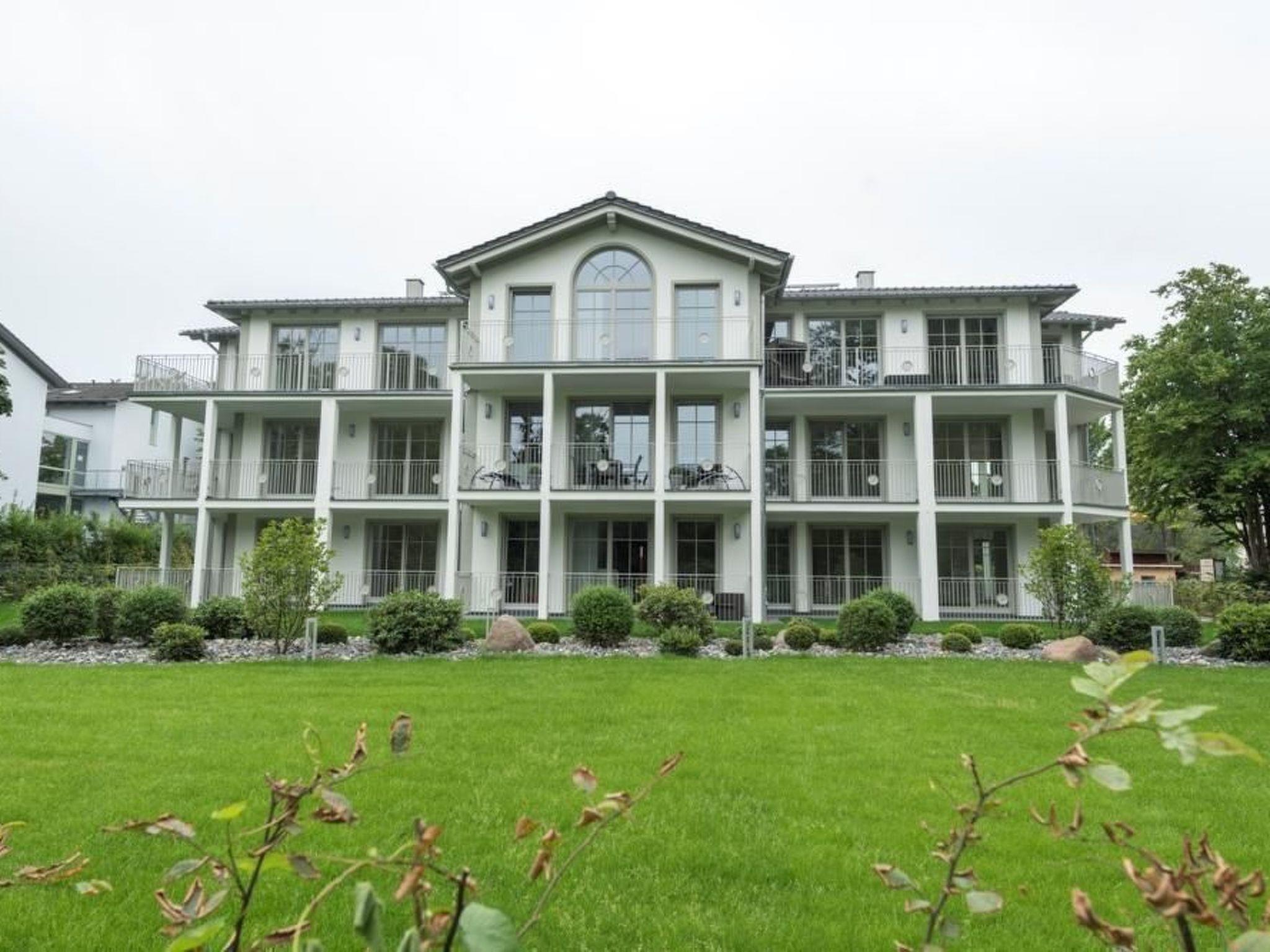Our newly built Villa Pauline (August 2016) is situated in an exposed and idyllic location directly on the forest promenade on the high shore in the Baltic seaside resort of Göhren. The spacious 3-room holiday flat is perfect for families and individual travellers. The exclusive 3-room holiday flat is modern and furnished to a high standard and has a large terrace and a small terrace (both fenced) to enjoy the good Baltic Sea air and sun on Rügen at any time. The fine sandy north beach with the amber promenade is about 400 metres away and the natural beach (south beach) can be reached comfortably in about 10 minutes on foot or in even less time by bike. Incidentally, you can park your bike directly in your own bike shed at the house. Do you also like to be online on holiday? You'll find free Wi-Fi in the holiday flat. Holiday flat in Villa Pauline in Göhren on Rügen 3-room holiday flat with 2 enclosed terraces, ground floor. Entire flat with large windows at ground level Fantastic view of the forest promenade on the high bank Distance to the north beach approx. 400 metres and south beach approx. 10 minutes walk to the centre of the village Free W-LAN in the flat Barrier-free Sauna in the flat Lift in the house with fireplace 2 free parking spaces available directly at the house Bicycle storage available Non-smoking flat! Pets not allowed