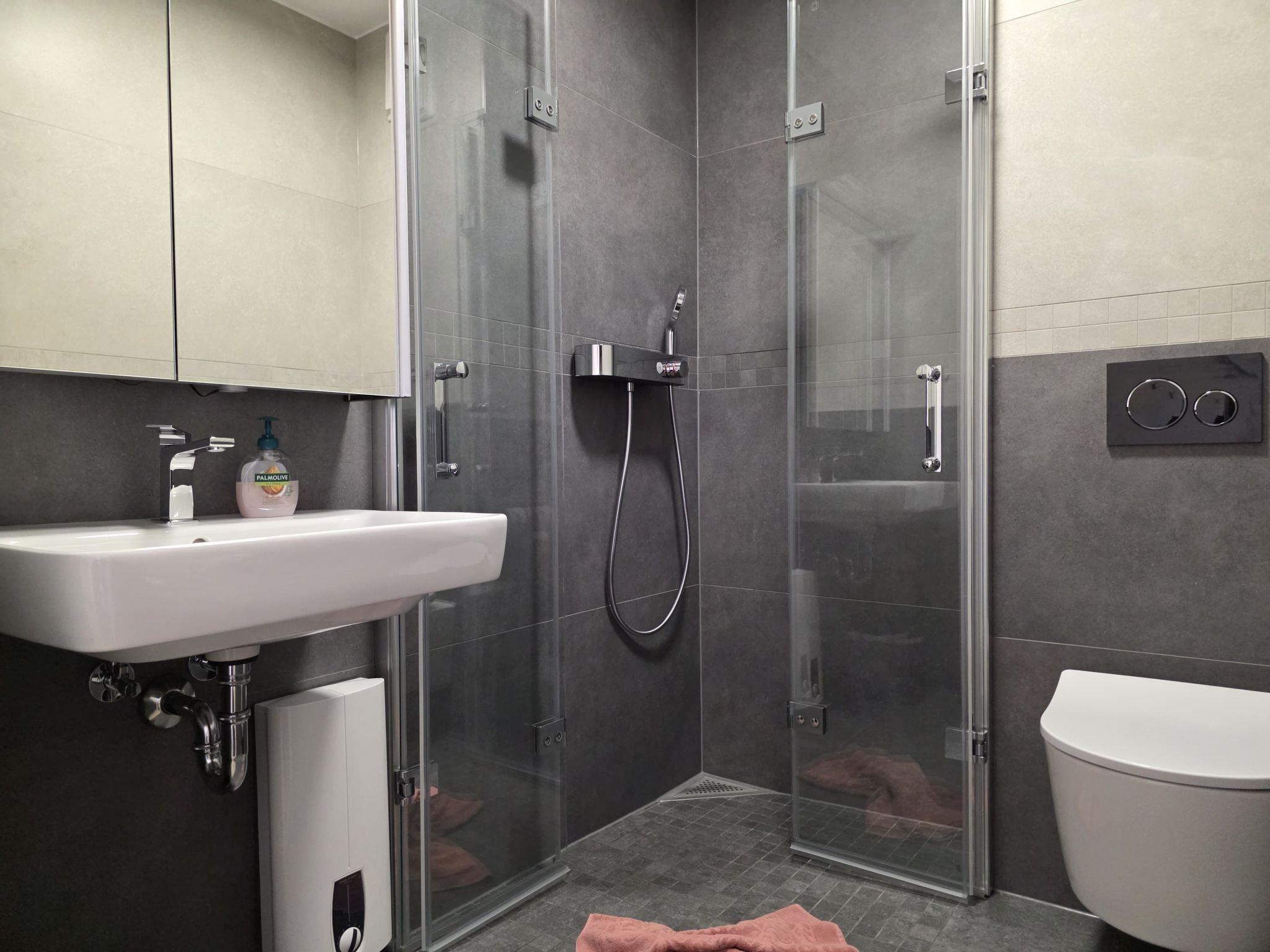 The large living area has a fitted kitchen with electric cooker, dishwasher, kettle, toaster, coffee machine, egg cooker, pots, crockery and cutlery (for 12 people). There is also a music system, cable TV and a DVD player. The dining area is furnished with a modern table, 4 comfortable chairs and a sideboard. WLAN is available. The cosy seating area with glass table, uplighter and large sofa invites you to relax. The light-flooded bedroom has a comfortable double bed, a large wardrobe with folding doors, a bookshelf and 2 large windows with access to the two terraces. The bright and cosy bathroom has a round shower with glass doors, WC, washbasin, glass shelf and a side cabinet with plenty of space for your bathroom utensils. A hairdryer is also available. All windows have electric shutters.