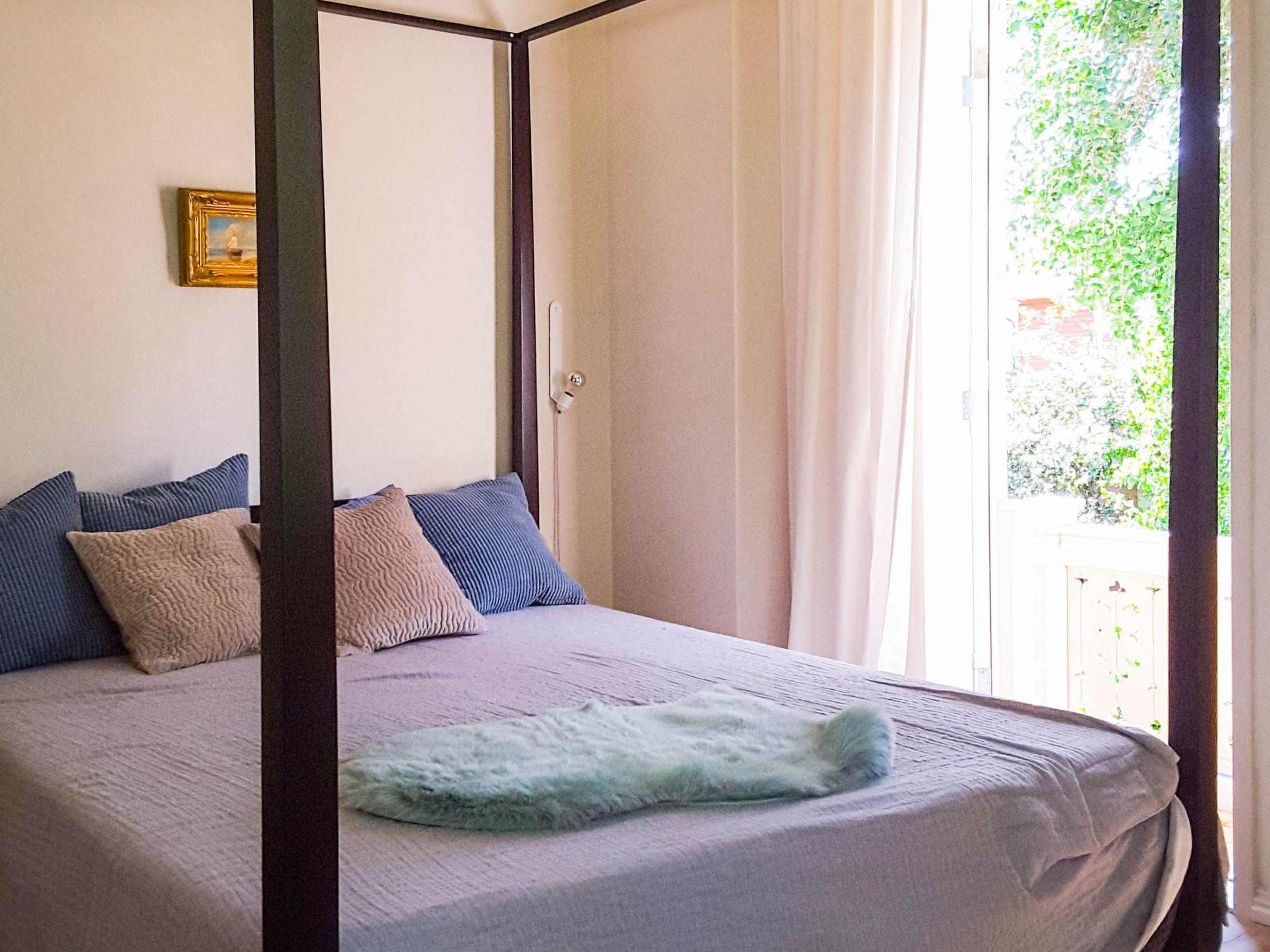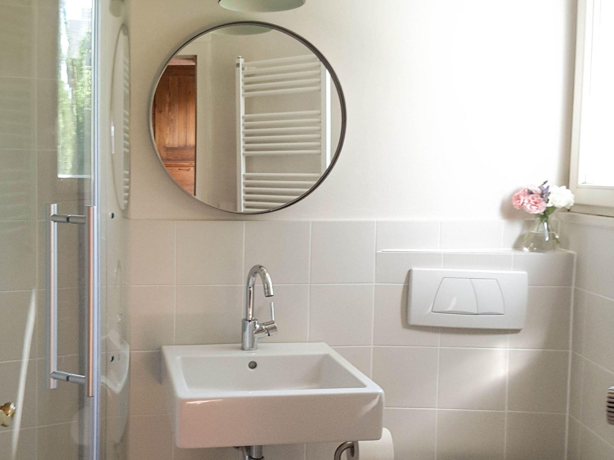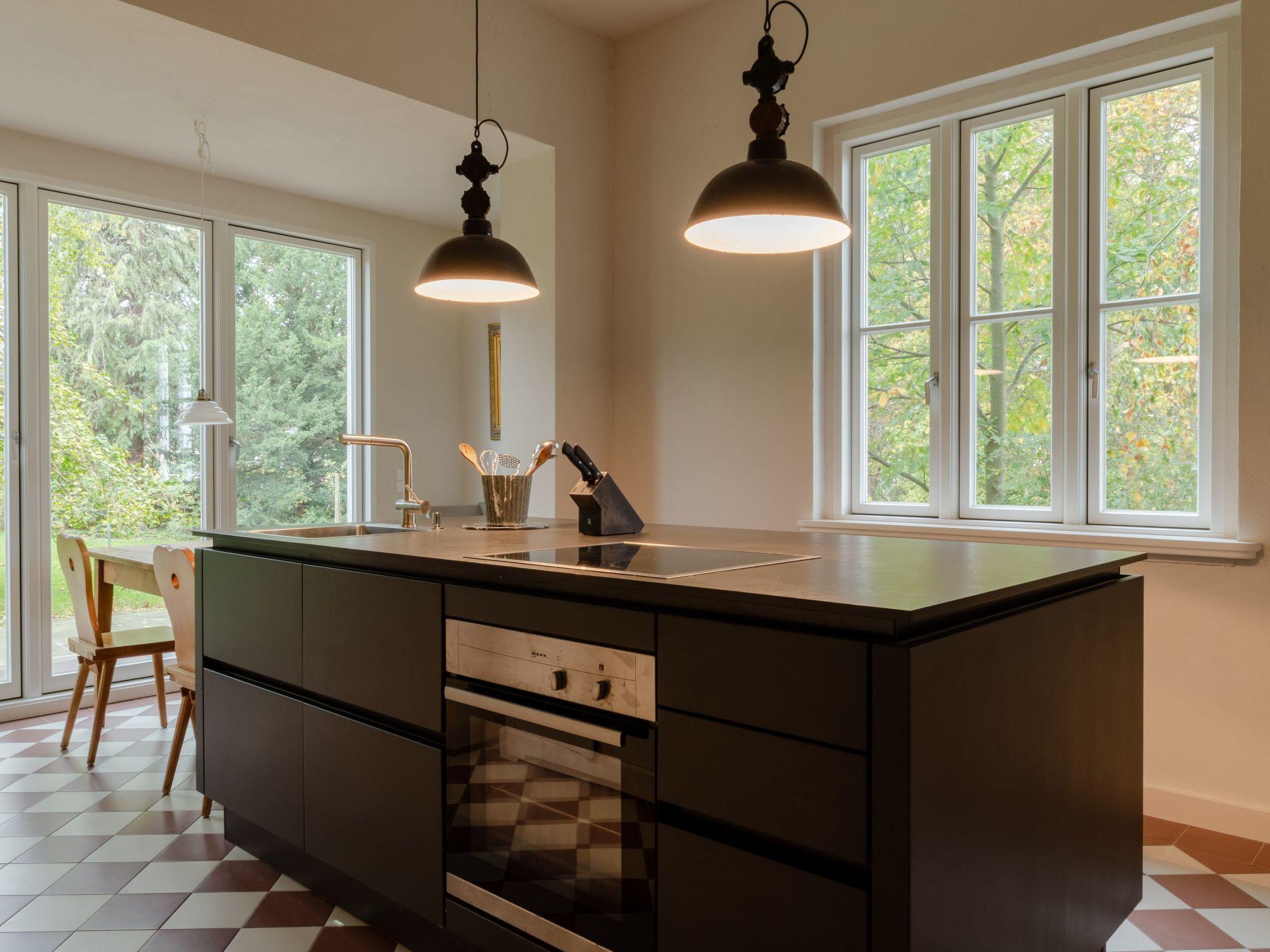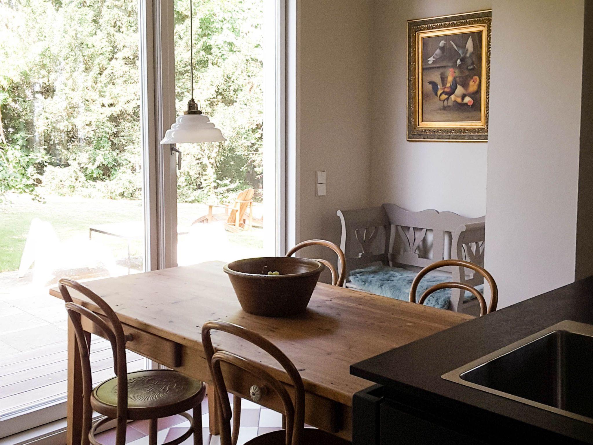 Also on the ground floor is the large kitchen with seating and a view of the very large garden. There you can still enjoy the old trees, ginkgo, yew and hanging beech, and relax in the hammock or deckchairs. The house offers space for 10 guests.
