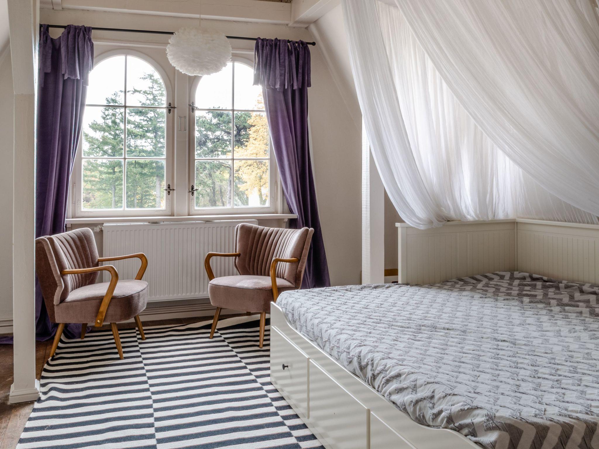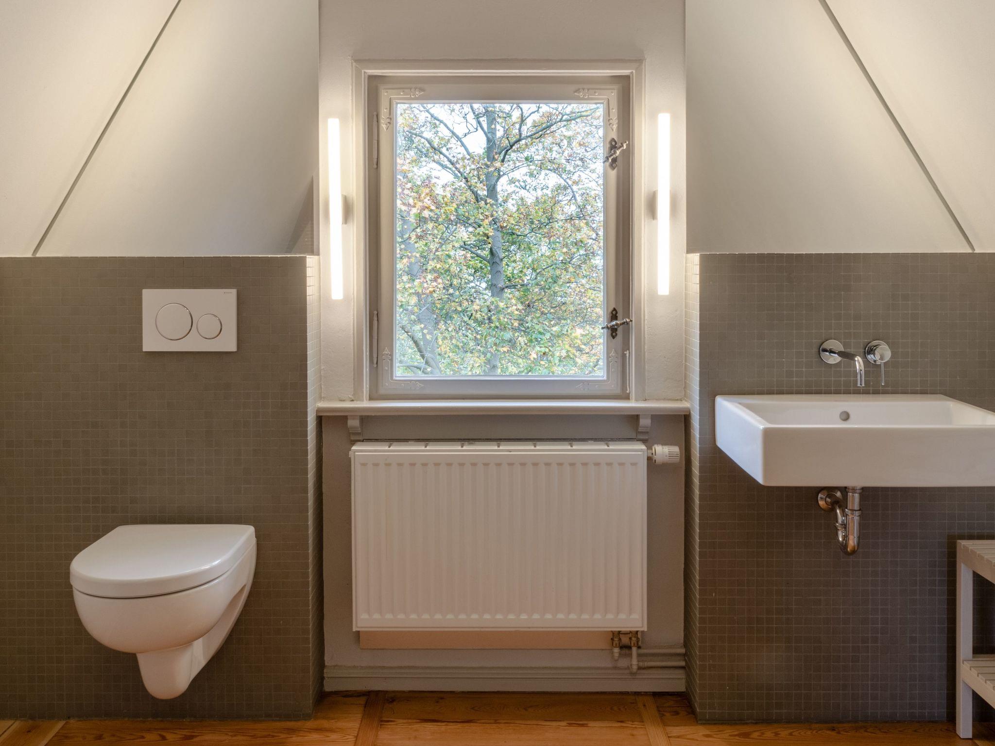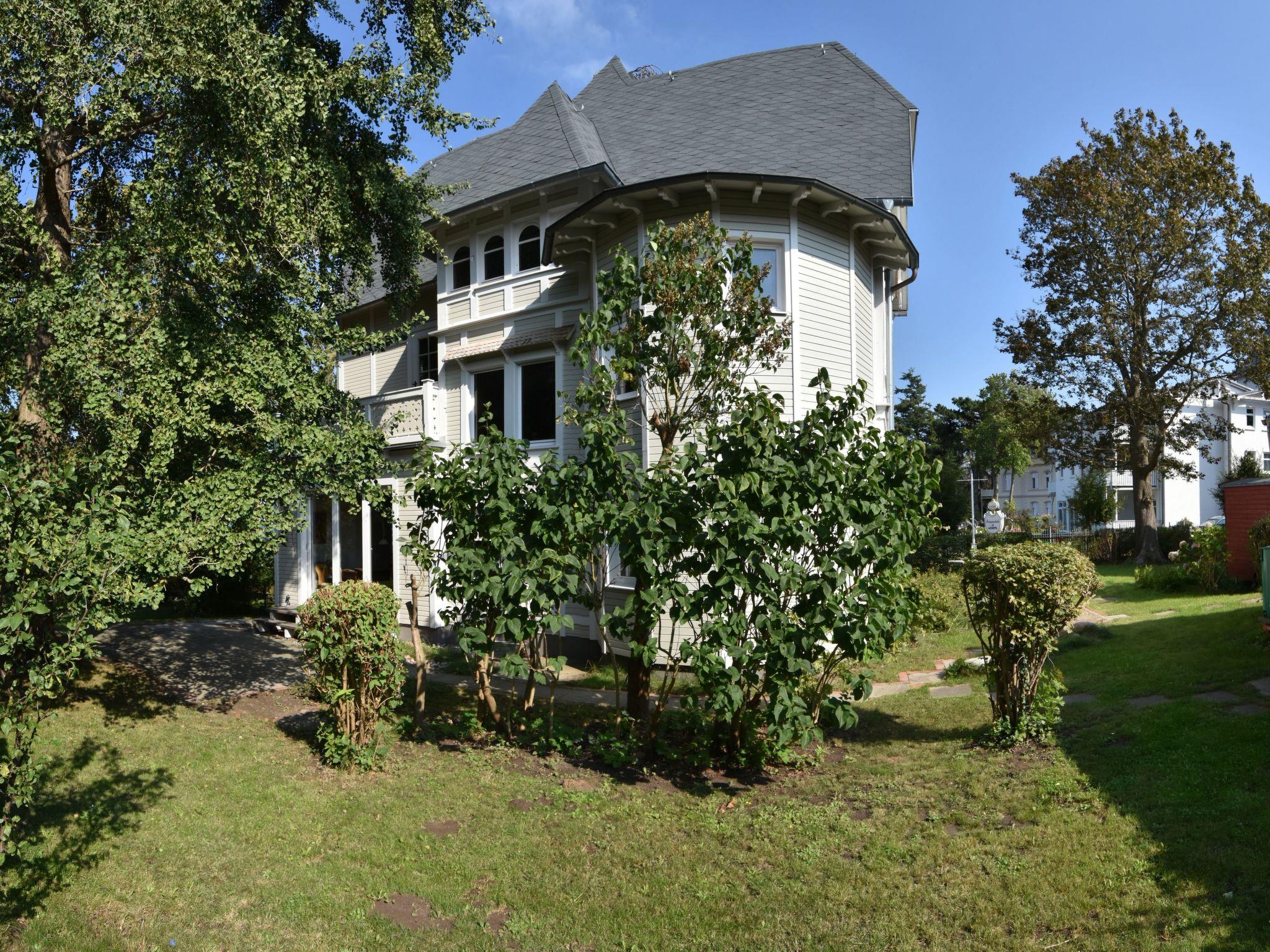 The house was sensitively reconstructed in 2016/19 with the aim of recreating the historic villa character of the listed building. There are five double bedrooms on the upper floors, three with terraces facing south, east and west. There are four shower rooms. The bedrooms, which extend over two floors, are connected by the central staircase, the walls of which are clad entirely in wood. The shared rooms are located on the ground floor next to the main entrance and the cloakroom. With its historic pitch pine wall panelling, the smaller living room, TV room and library display all the charm of the old spa architecture. The large dining room and the veranda offer a bay window with a view of the Baltic Sea to the north-east and access to the front area of the garden. There is a rustic sauna trolley which you are welcome to use. Next to the sauna caravan is a small outbuilding housing the washing machine and another toilet.