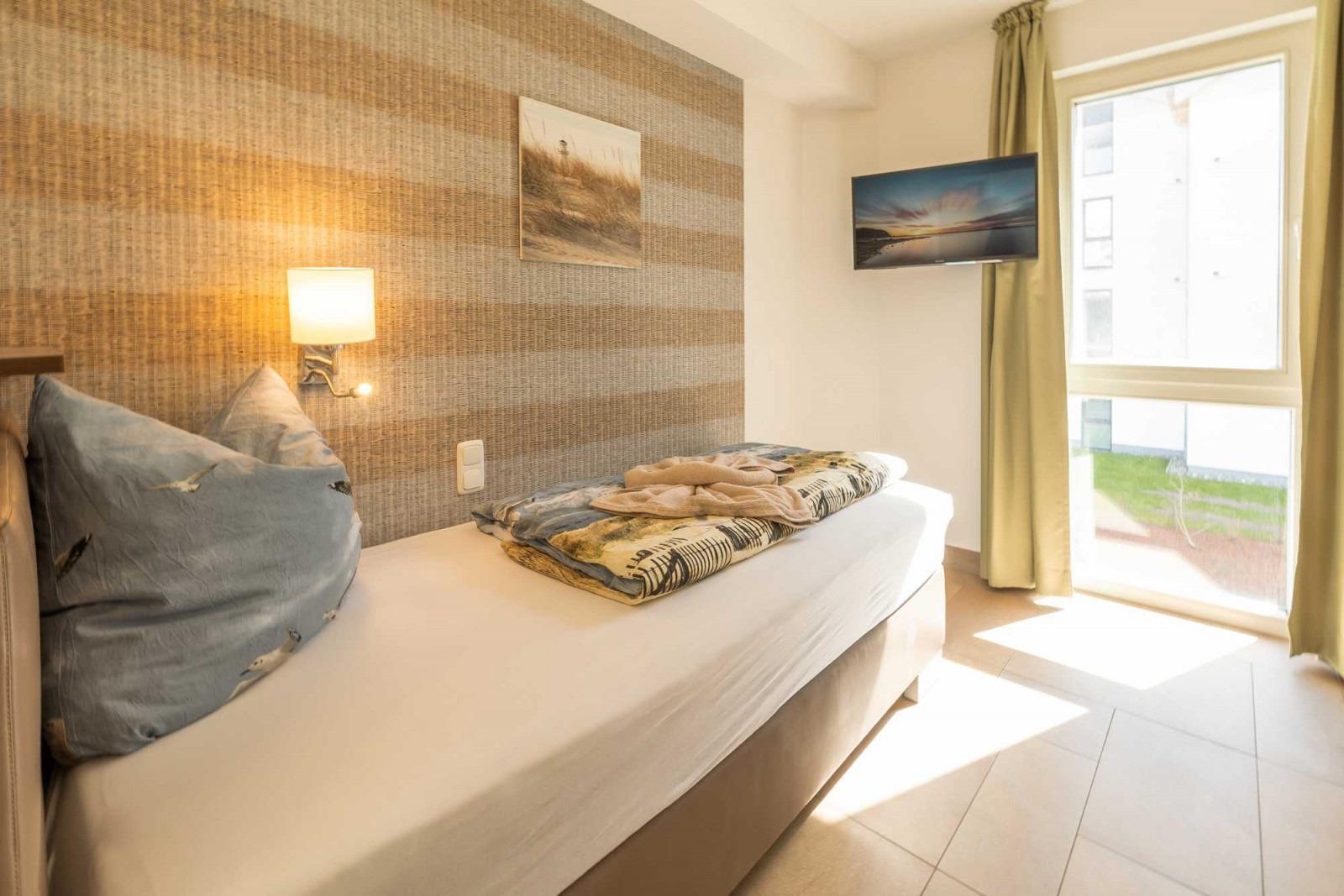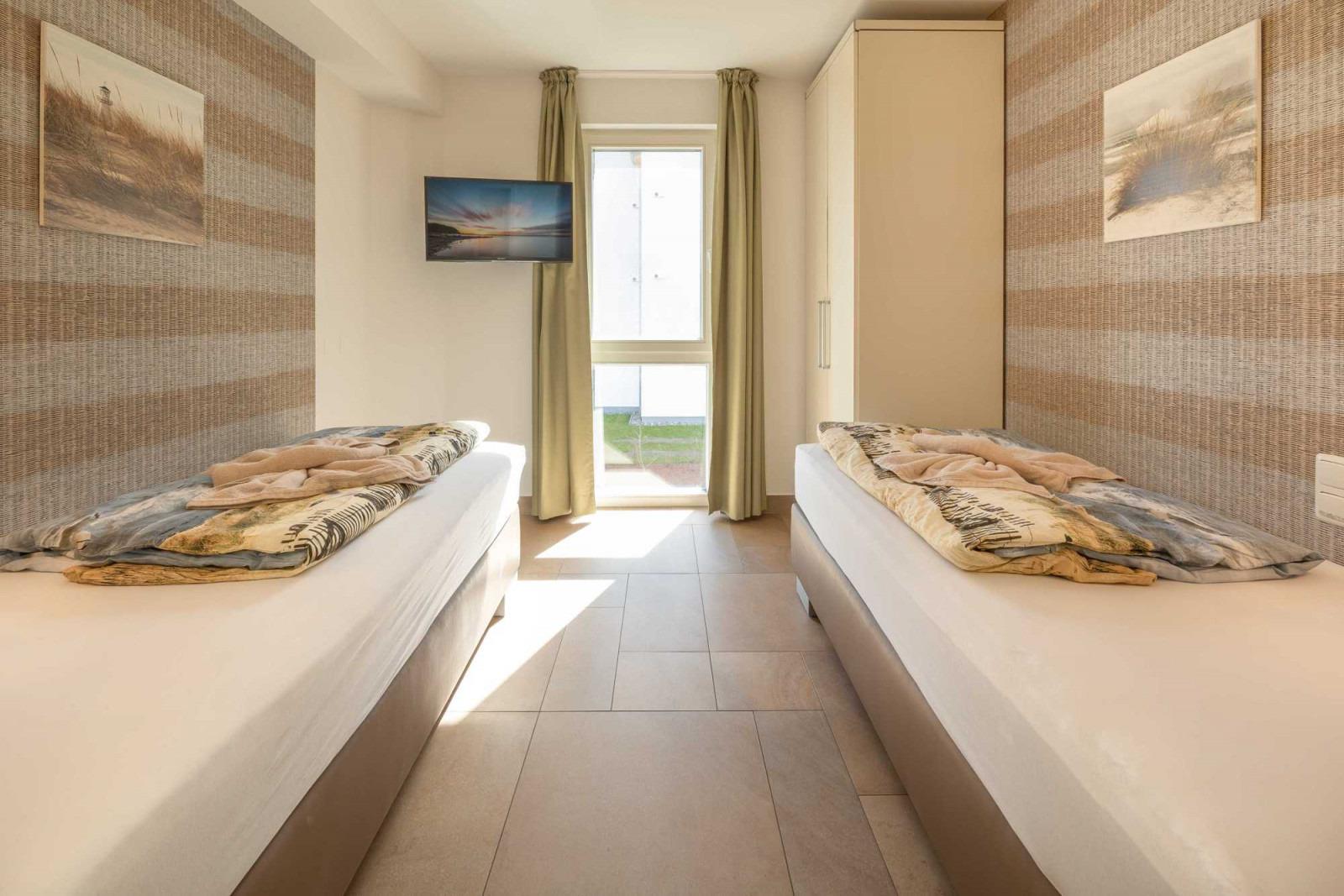 Insgesamt finden in der Wohnung 6 Personen Platz. Ein Schlafzimmer ist mit einem Doppelbett ausgestattet, das Andere mit zwei Einzelbetten. Zusätzlich befindet sich im Wohnbereich ein Schlafsofa für zwei weitere Personen. Alle Schlafräume sind mit TV-Geräten versehen.